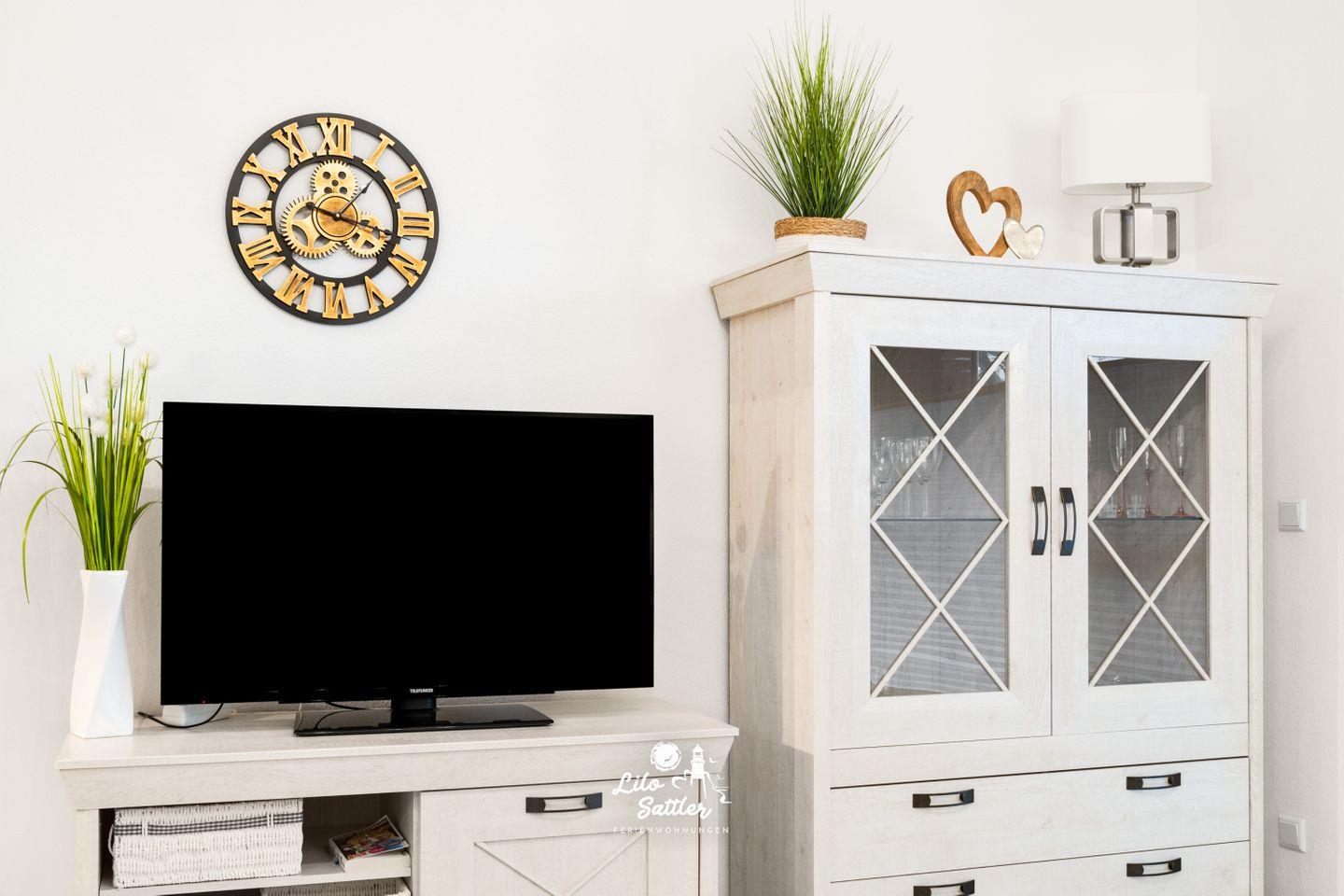 gemütliches Ledersofa, TV Board und Vitrine, Smart TV, Radio, Terrassentür mit Plissee und Außenrolladen, Fliegenschutzgitter, Essplatz für 3 Personen, Zugang zur Terrasse