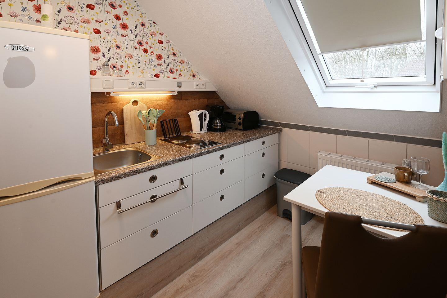 Die Küchenzeile ist mit allem ausgestattet, was Sie brauchen: einem Cerankochfeld, Mikrowelle, Kühlschrank, Gefrierfach, und allen notwendigen Küchenutensilien.