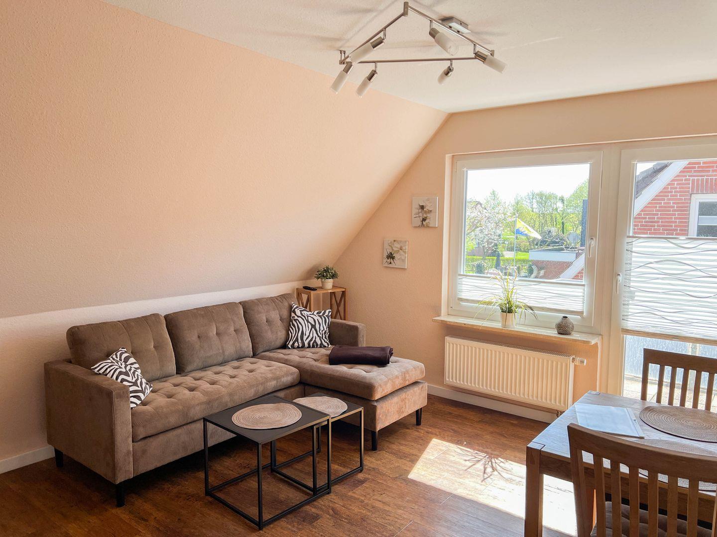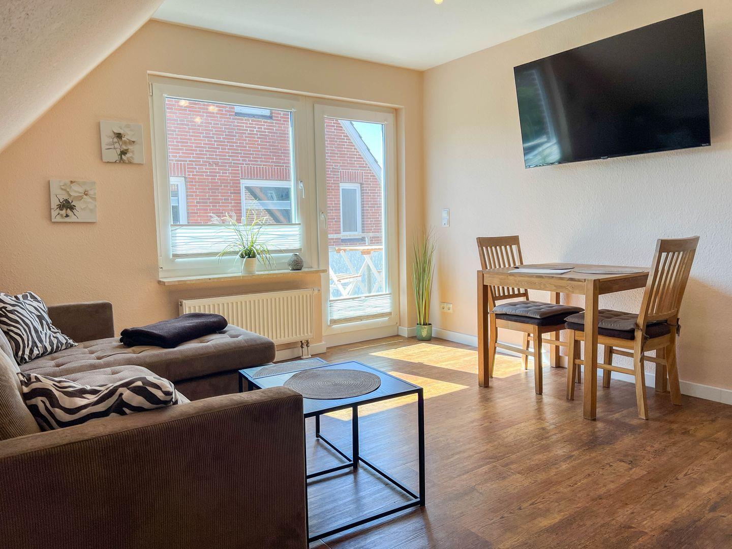 Ein weiteres Highlight der Wohnung ist der süd-west Balkon, auf dem Sie die frische Nordseeluft genießen oder einfach entspannen können. Den Balkon erreichen Sie von dem Wohnbereich aber auch vom Schlafzimmer aus. WLAN ist in der gesamten Unterkunft verfügbar, sodass Sie auch während Ihres Urlaubs verbunden bleiben können.