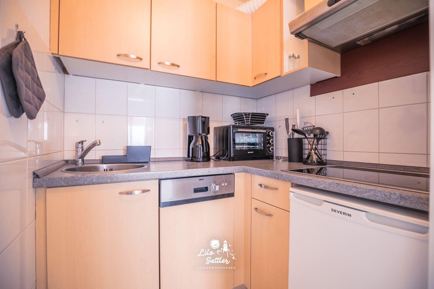 Spüle, Kühlschrank, kleiner Backofen, Geschirrspüler, Ceranfeld mit Abluft, Kaffeemaschine, Toaster, Wasserkocher