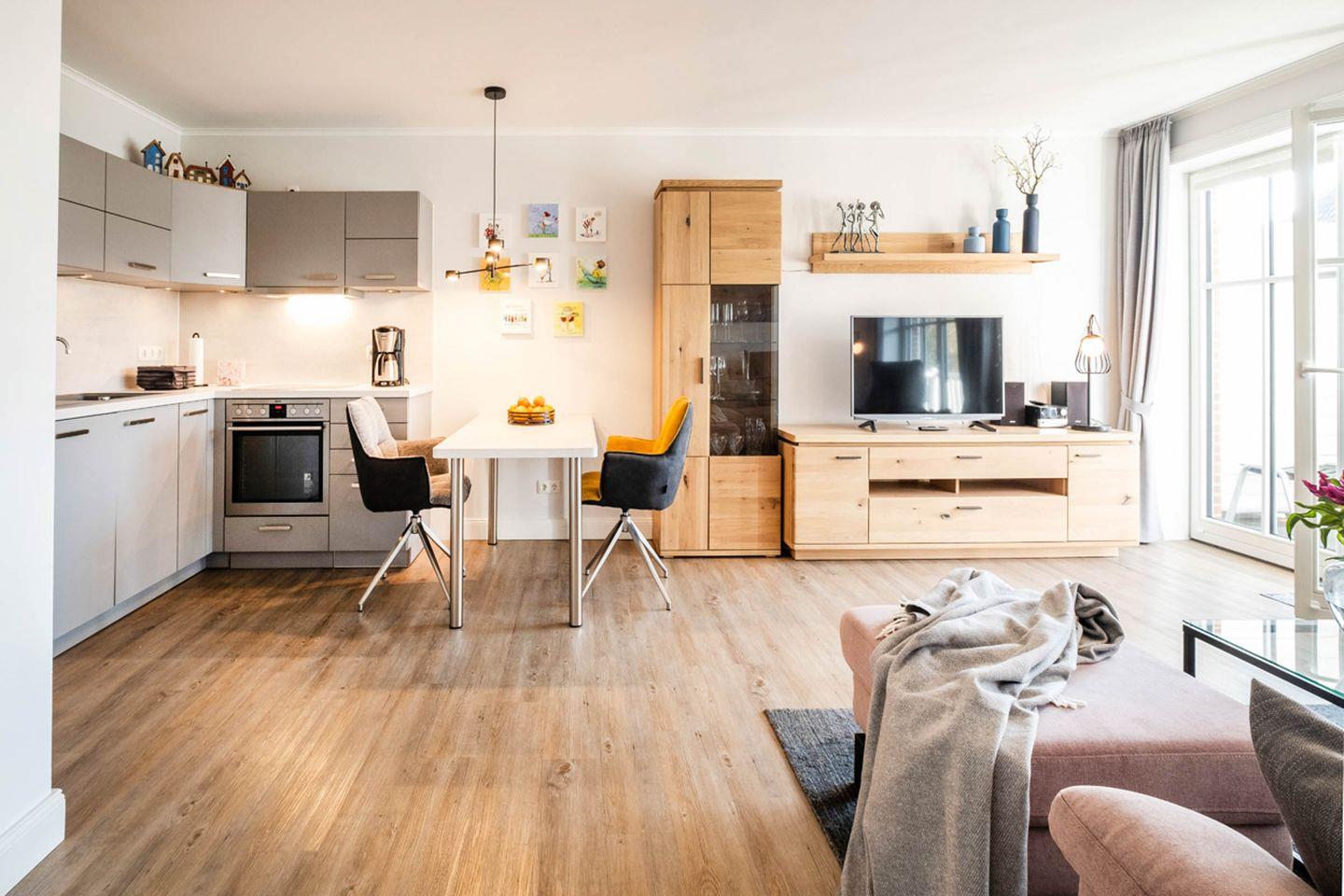 Die Ferienwohnung befindet sich im 1. Obergeschoss eines gepflegten Hauses und ist bequem mit einem Aufzug zu erreichen. Der offen gestaltete Wohnbereich vereint Funktionalität und Gemütlichkeit. Hier finden Sie eine moderne Küche, die mit hochwertigen Geräten wie einem Cerankochfeld, einer Mikrowelle, einem Geschirrspüler und einer Kaffeemaschine ausgestattet ist. Nach einem erlebnisreichen Tag können Sie am Esstisch eine köstliche Mahlzeit genießen oder auf der gemütlichen Couch entspannen. Für Unterhaltung sorgt ein Fernseher, sodass Sie Ihre Lieblingsfilme oder Serien auch in der Ferne nicht missen müssen.