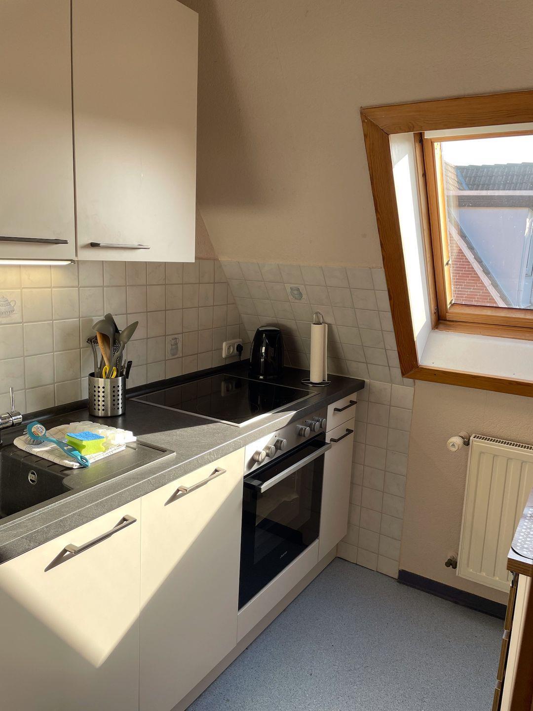 Der helle Wohn- und Essbereich ist freundlich gestaltet und lädt zum Entspannen ein. Hier finden Sie einen Fernseher für gemütliche Abende sowie einen Essbereich, der Platz für gemeinsame Mahlzeiten bietet. Die moderne Küche ist komplett ausgestattet mit einem Cerankochfeld, einem Kühlschrank mit Gefrierfach und einer Spülmaschine, so dass Sie sich ganz wie zu Hause fühlen können.