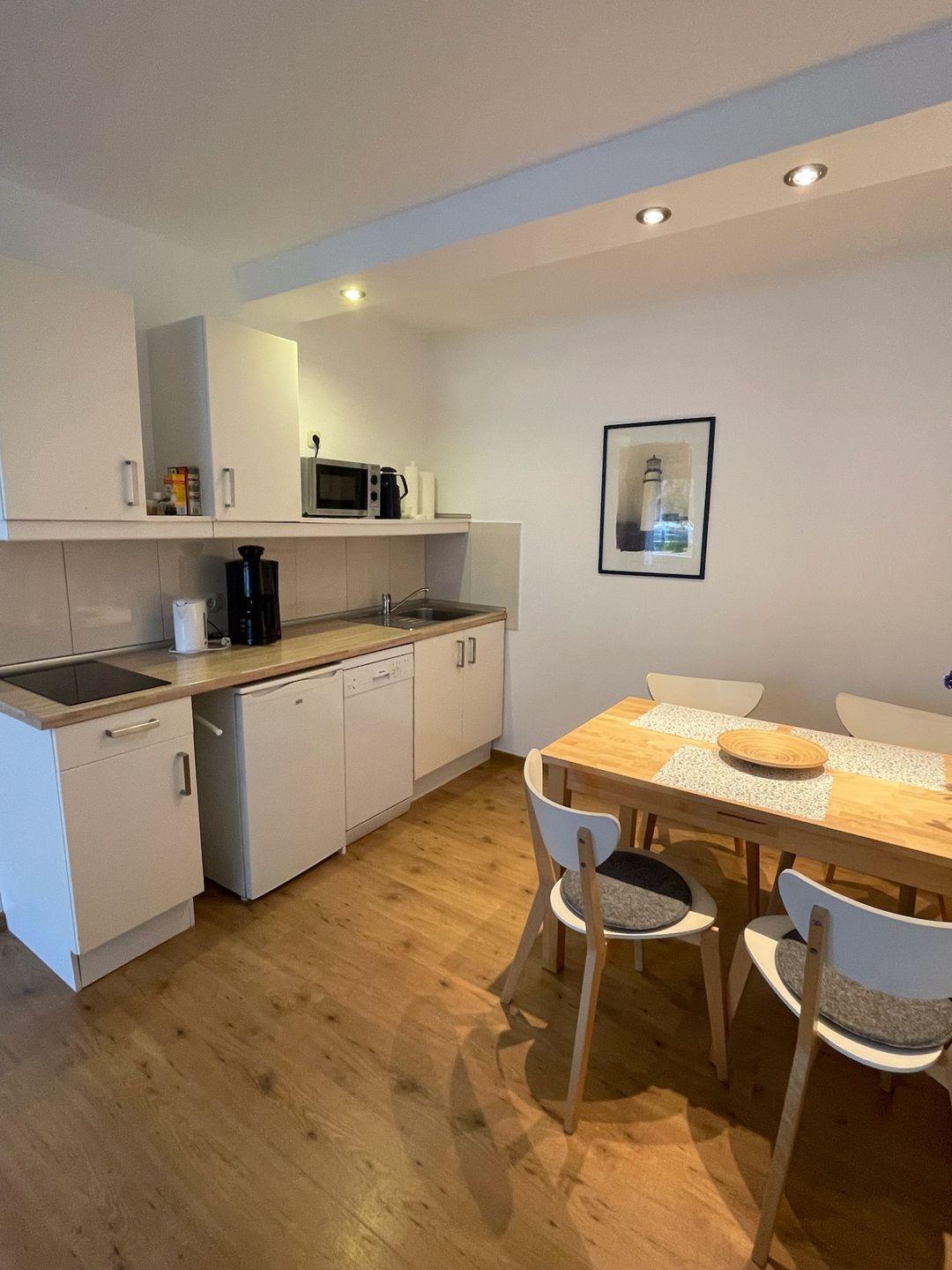 Die moderne und lichtdurchflutete Wohnung begrüßt Sie mit einem offenen Wohnraum, der mit einem gemütlichen Sofa und einem Sessel ausgestattet ist – der perfekte Ort zum Entspannen nach einem erlebnisreichen Tag am Meer. Ein Esstisch lädt zu gemeinsamen Mahlzeiten ein und schafft eine harmonische Atmosphäre für Familien und Freunde. Die große Terrasse erweitert Ihr Wohngefühl ins Freie, wo Sie die frische Nordseebrise und die Ruhe der Umgebung genießen können.
