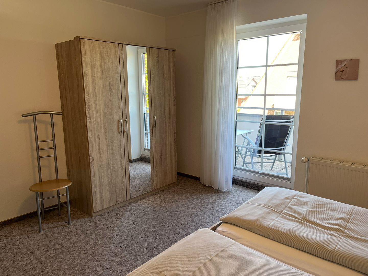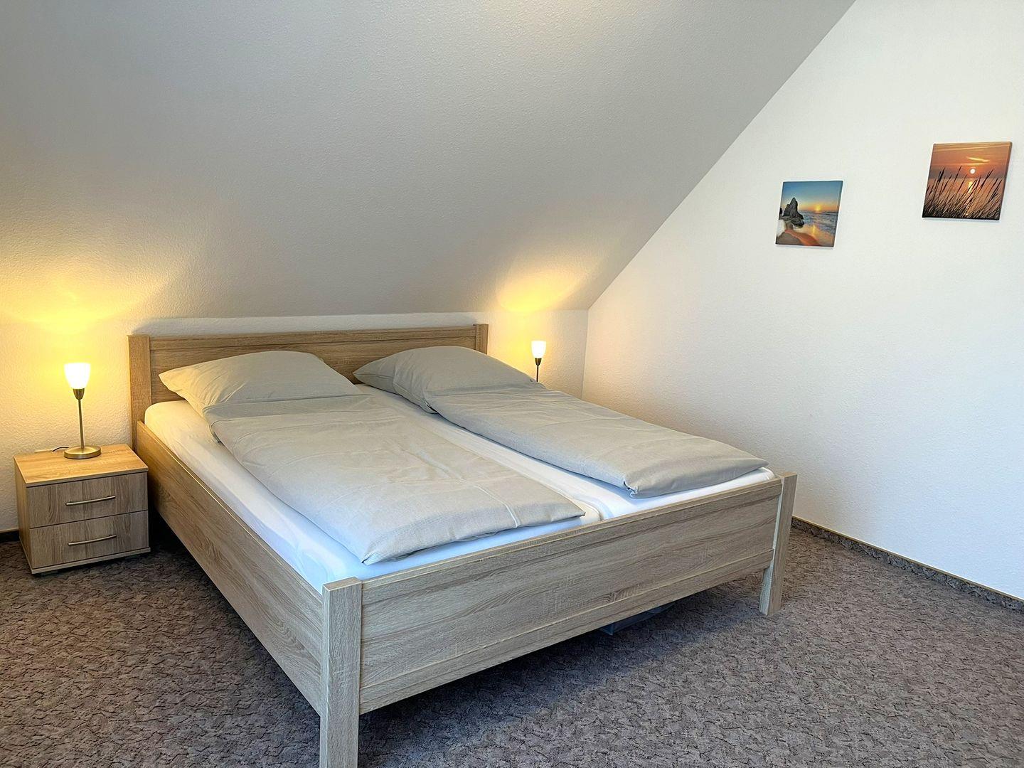 Das separate Schlafzimmer ist mit einem Doppelbett (2 Einzelmatratzen 0,90 x 2m) und einem Kleiderschrank möbliert, hier sind Verdunklungsplissee angebracht. Für die kleinsten Gäste kann hier auch ein Babyreisebett aufgestellt werden, dass sie mitbringen oder bei uns kostenpflichtig dazu buchen können.