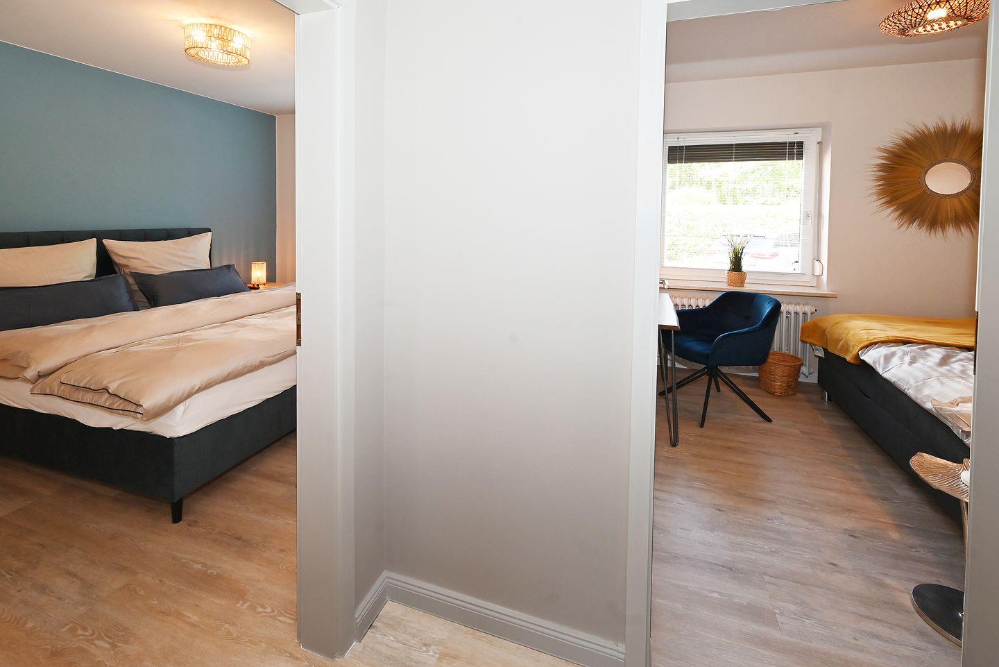 Die Wohnung verfügt über zwei Schlafzimmer -ausgestattet mit jeweils einem gemütlichen Boxspringbett - eines mit einem Doppelbett 1,80 x 2,00 Meter, sowie einem Doppelbett von 1,40 x 2,00 Meter.