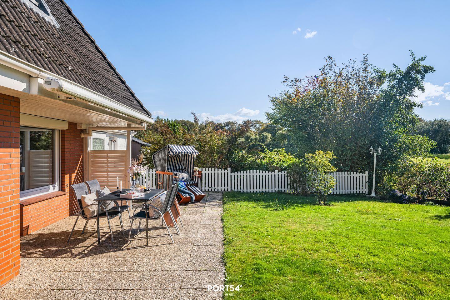 Das etwa 800 m² große Grundstück bietet reichlich Platz und Privatsphäre. Genießen Sie sonnige Stunden im Garten mit Gartenmöbeln, Liegewiese, überdachter Terrasse, Balkon, Markisen und einem Strandkorb. Der Blick auf die angrenzenden Weiden sorgt für echtes Nordsee-Feeling.