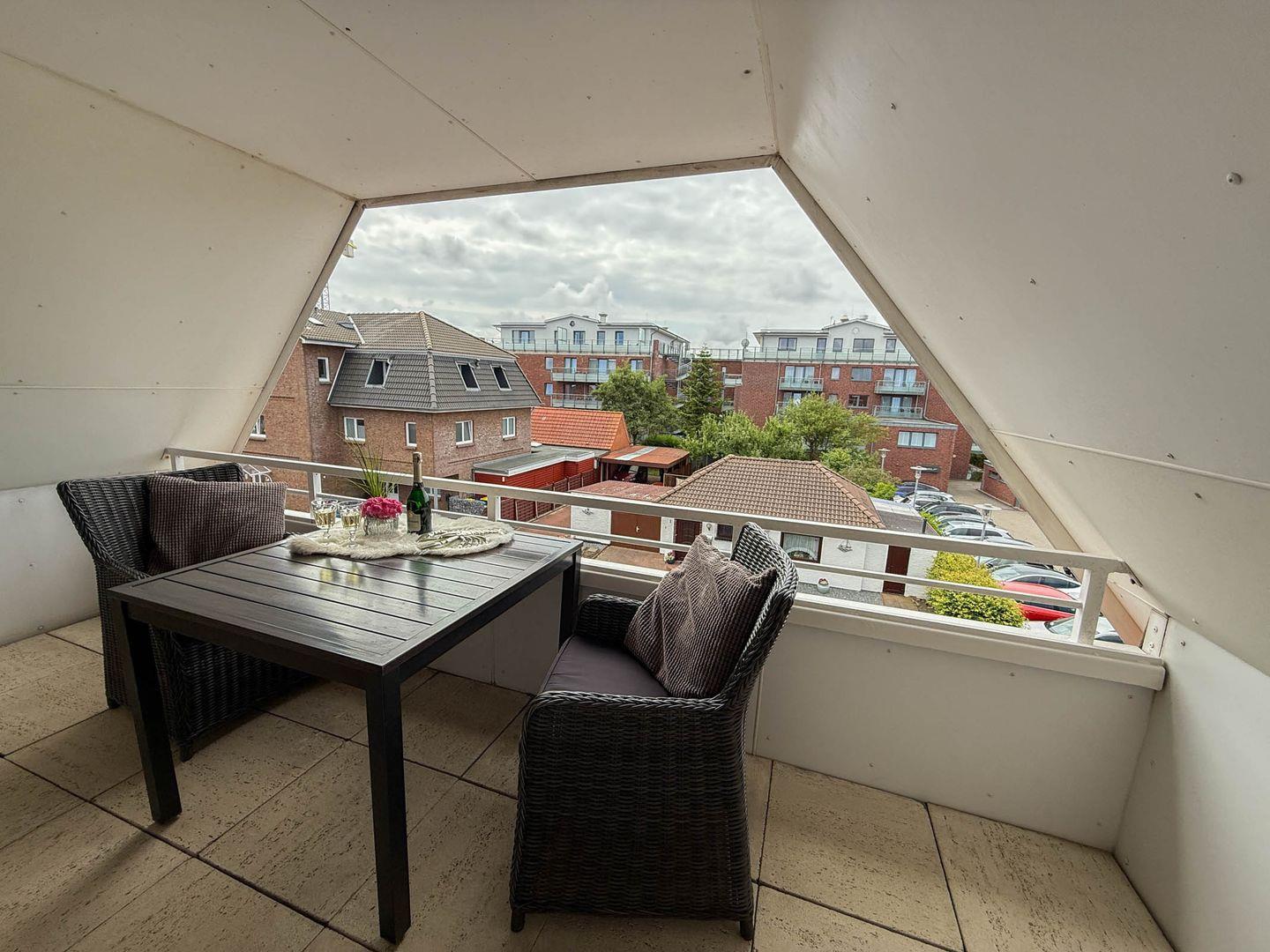 Genießen Sie entspannte Stunden auf dem eigenen überdachten Balkon, der mit Balkonmöbeln ausgestattet ist. Von dem Balkon aus haben Sie eingeschränkten Meerblick.