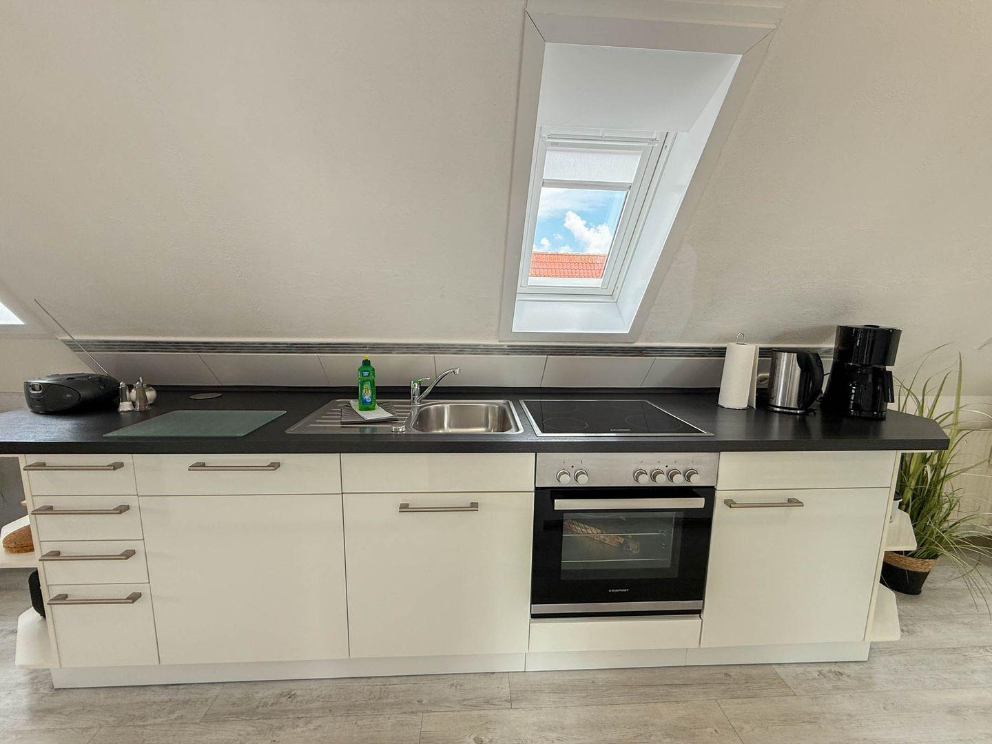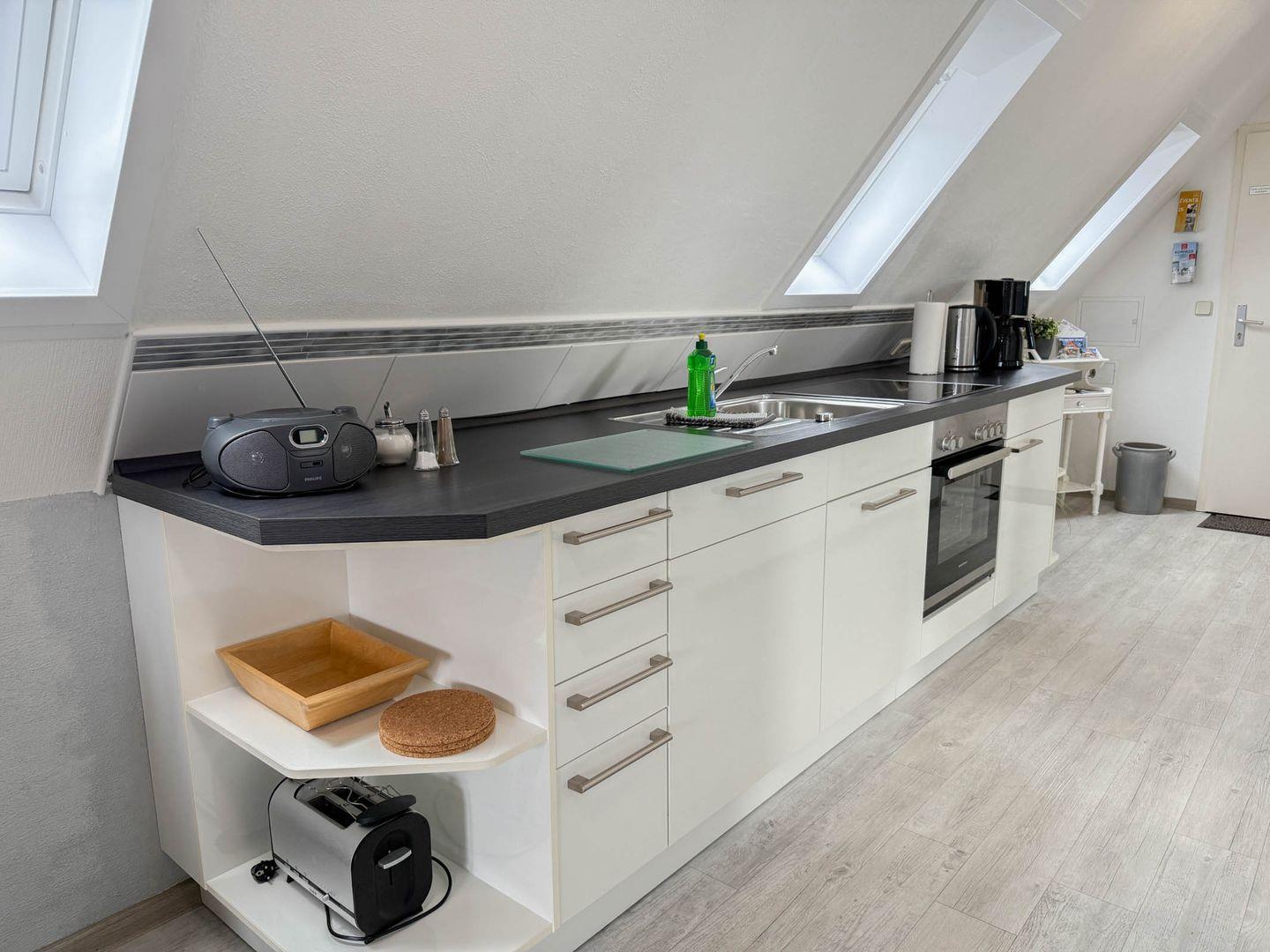 Der offene Wohn- und Essbereich lädt mit gemütlicher Sofaecke sowie einem Esstisch zum Verweilen ein. Die moderne, offene Küche ist mit Ceranherd, Backofen, Kühlschrank, Spülmaschine, Wasserkocher, Kaffeemaschine, Toaster und sämtlichen Küchenutensilien umfassend ausgestattet, sodass eine komfortable Selbstverpflegung problemlos möglich ist.