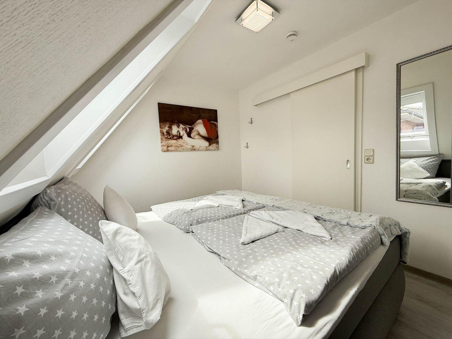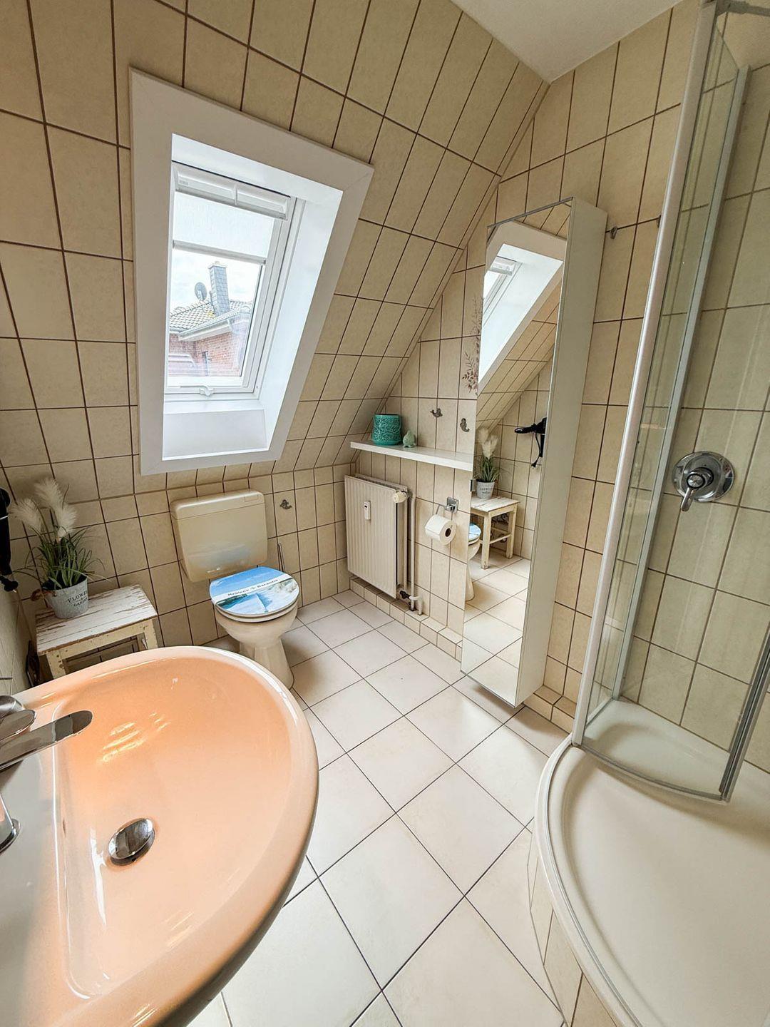 Das Schlafzimmer bietet eine erholsame Rückzugsmöglichkeit und ist mit praktischen Möbeln ausgestattet. Der Sichtschutz an allen Fenstern sorgt jederzeit für Privatsphäre. Das Badezimmer verfügt über eine Dusche mit flacher Wanne, WC, Waschbecken, und Spiegel, sodass Sie sich umfassend wohlfühlen können.