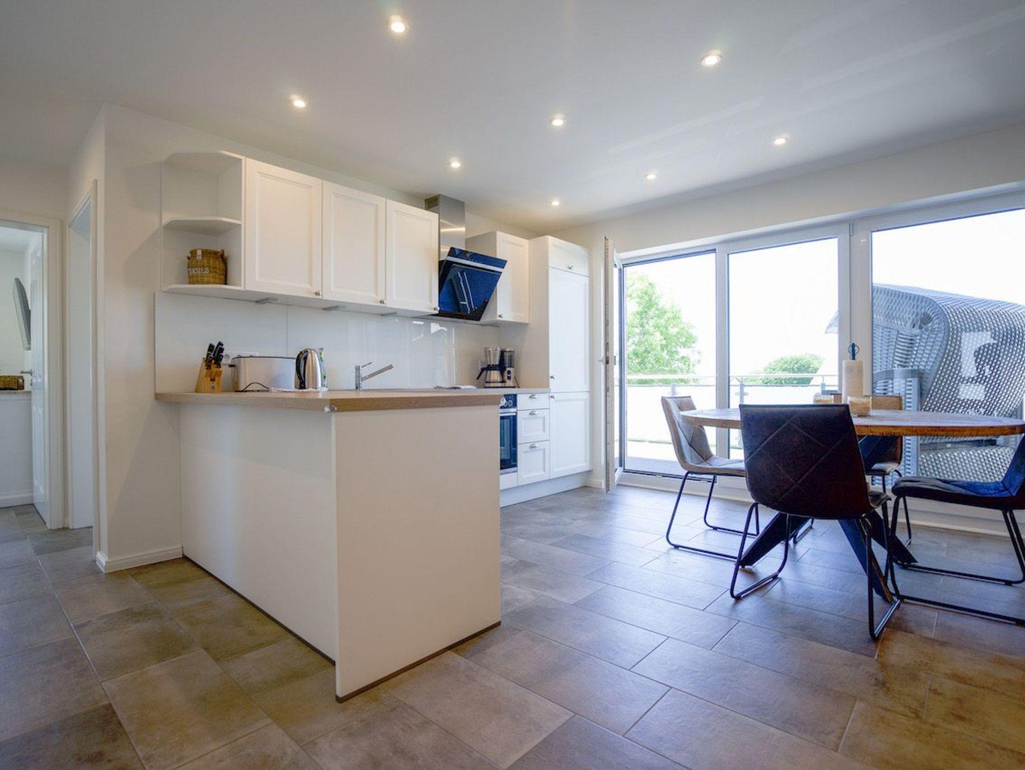 Offene, voll ausgestattete Wohnküche mit Markengeräten. Es stehen eine Filterkaffee- und Nespresso-Maschine zur Verfügung.