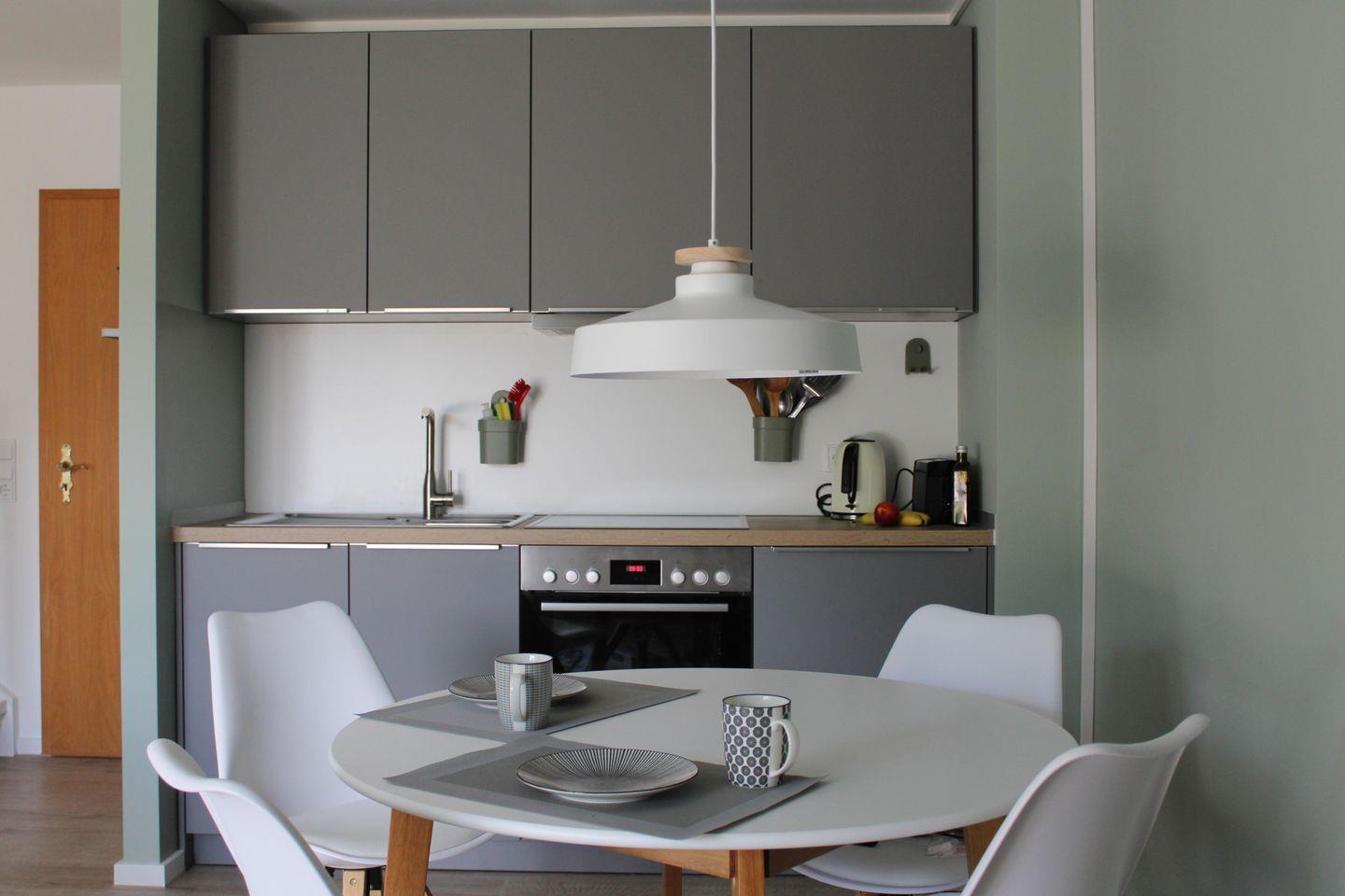 Mit einer großzügigen Fläche von 60 m² und zwei charmanten Schlafzimmern ist die Ferienwohnung ideal für kleine Gruppen oder Paare, die Wert auf Privatsphäre und Komfort legen. Der offene Wohn- und Essbereich ist der perfekte Ort für gemütliche Abende. Die moderne Küche, ausgestattet mit einem Cerankochfeld, Backofen und Kühlschrank, ermöglicht Ihnen die Zubereitung Ihrer Lieblingsgerichte. Egal, ob Sie einen herzhaften Frühstück starten oder ein romantisches Abendessen planen, hier sind Sie bestens versorgt.