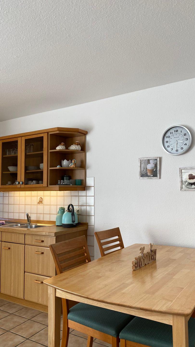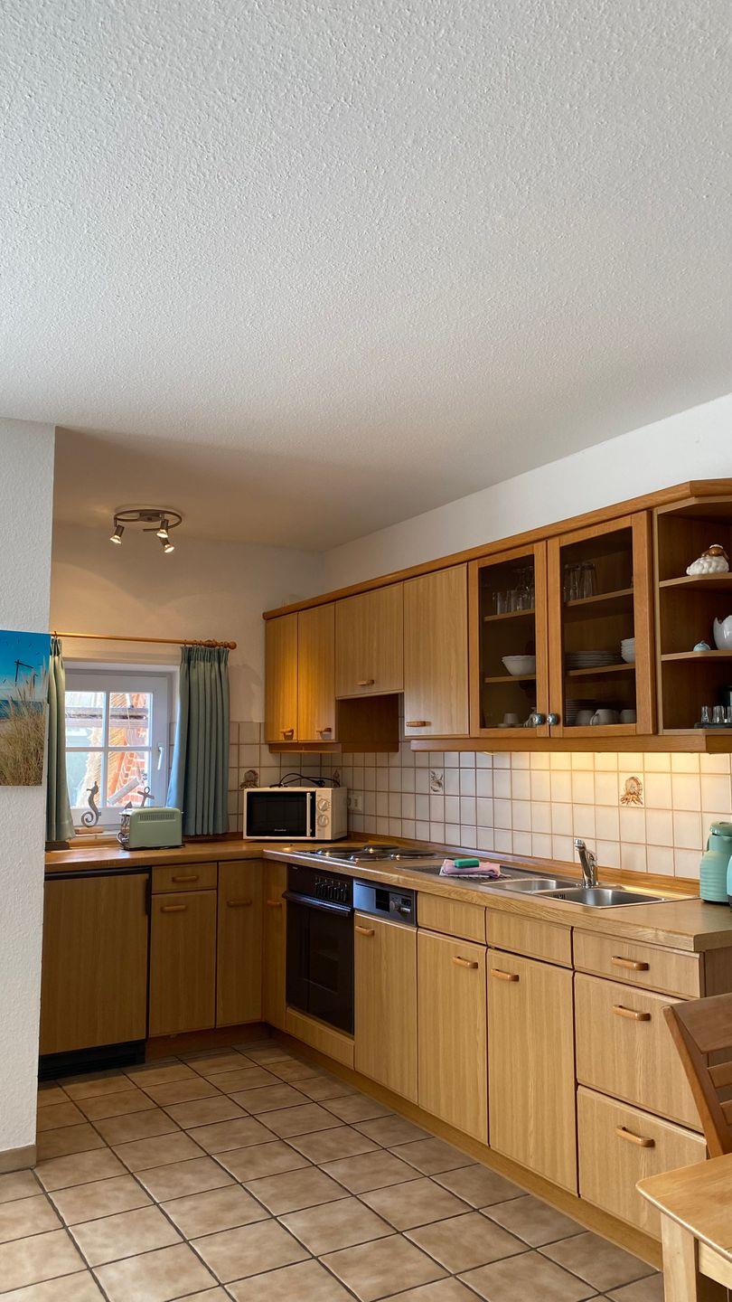 Die offene Küche ist komplett eingerichtet und lässt keine Wünsche offen. Ausgestattet mit einem Kochfeld, Backofen, Kühlschrank, Gefrierfach sowie Kaffeemaschine und Toaster, können Sie Ihre Lieblingsgerichte ganz bequem zubereiten. Für Ihren Komfort sind auch ausreichend Geschirr und Küchenutensilien vorhanden.