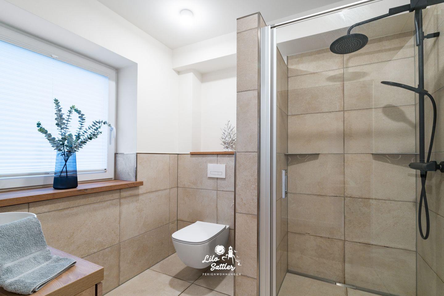 Ebenerdige Dusche, WC, Fenster, beleuchteter Spiegel, Waschtisch, Unterschrank, Fön, Handtuchtrockner,