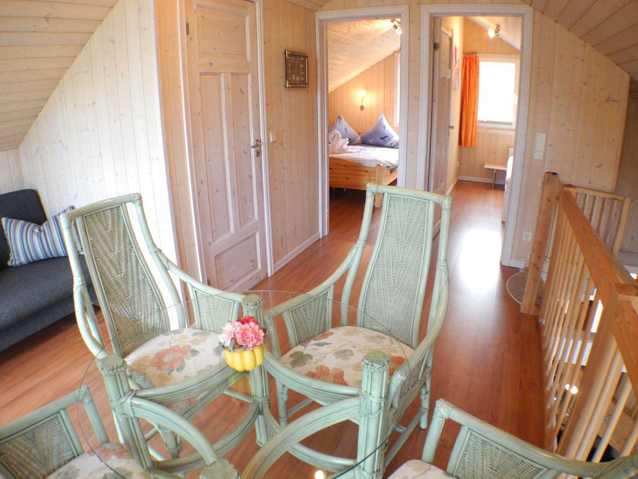 Eine Etage höher bietet die offene Galerie unter romantischen Dachschrägen mit einer Couch (Aufbettungsmöglichkeit) und weiteren Sitzgelegenheiten einen Rückzugsort zum Chillen oder Arbeiten. Von dem kleinen Balkon haben Sie den Blick auf das Meer. Auch ein zweites Badezimmer mit Dusche/WC und Ihre beiden Schlafzimmer finden Sie hier. Die Betten sind 1,80 m x 2,00 m bzw. 2,00 m x 2,00 m groß. Verdunklungsvorhänge und Fliegengitter an den Fenstern sorgen für erholsamen Schlaf.
