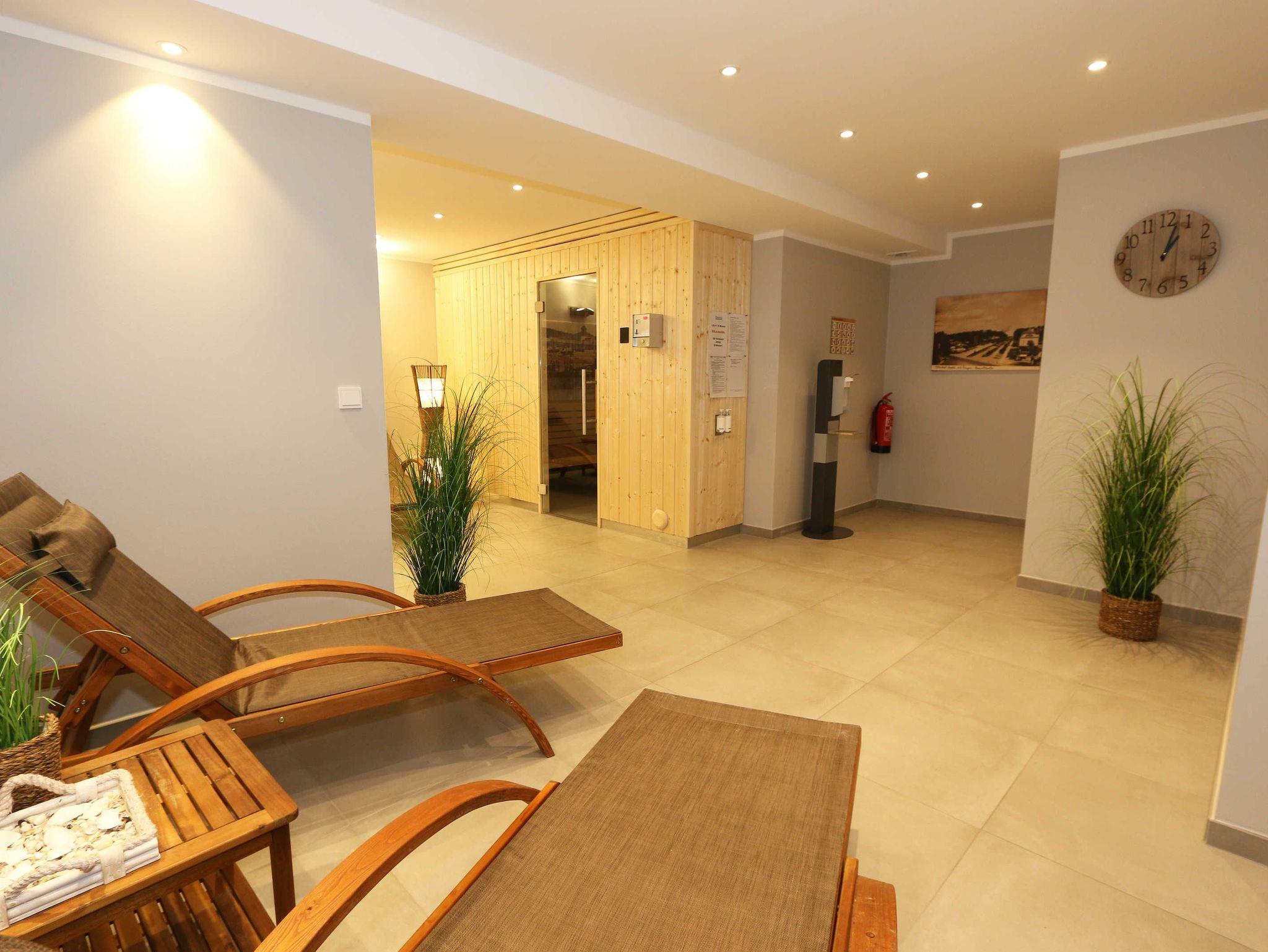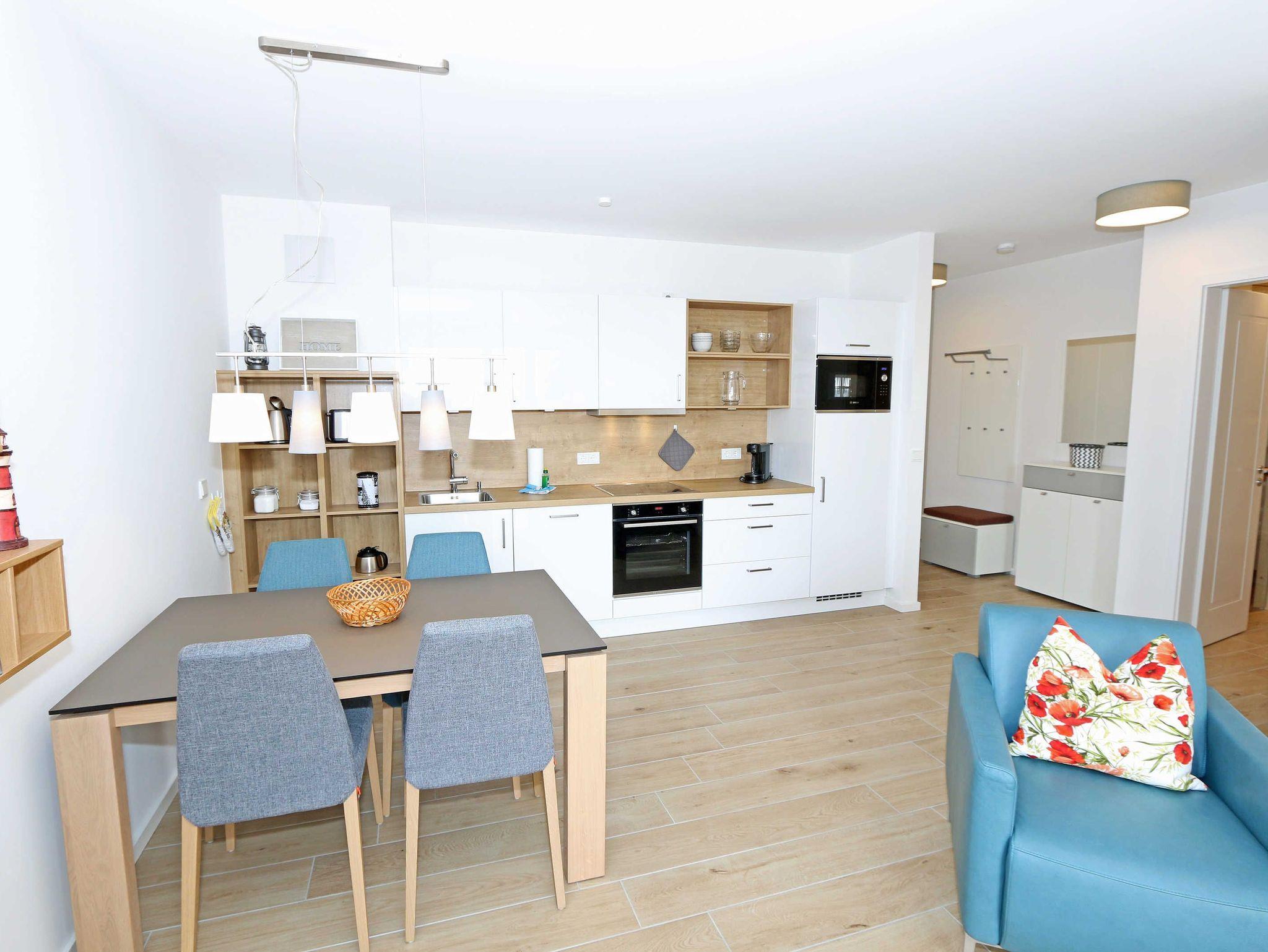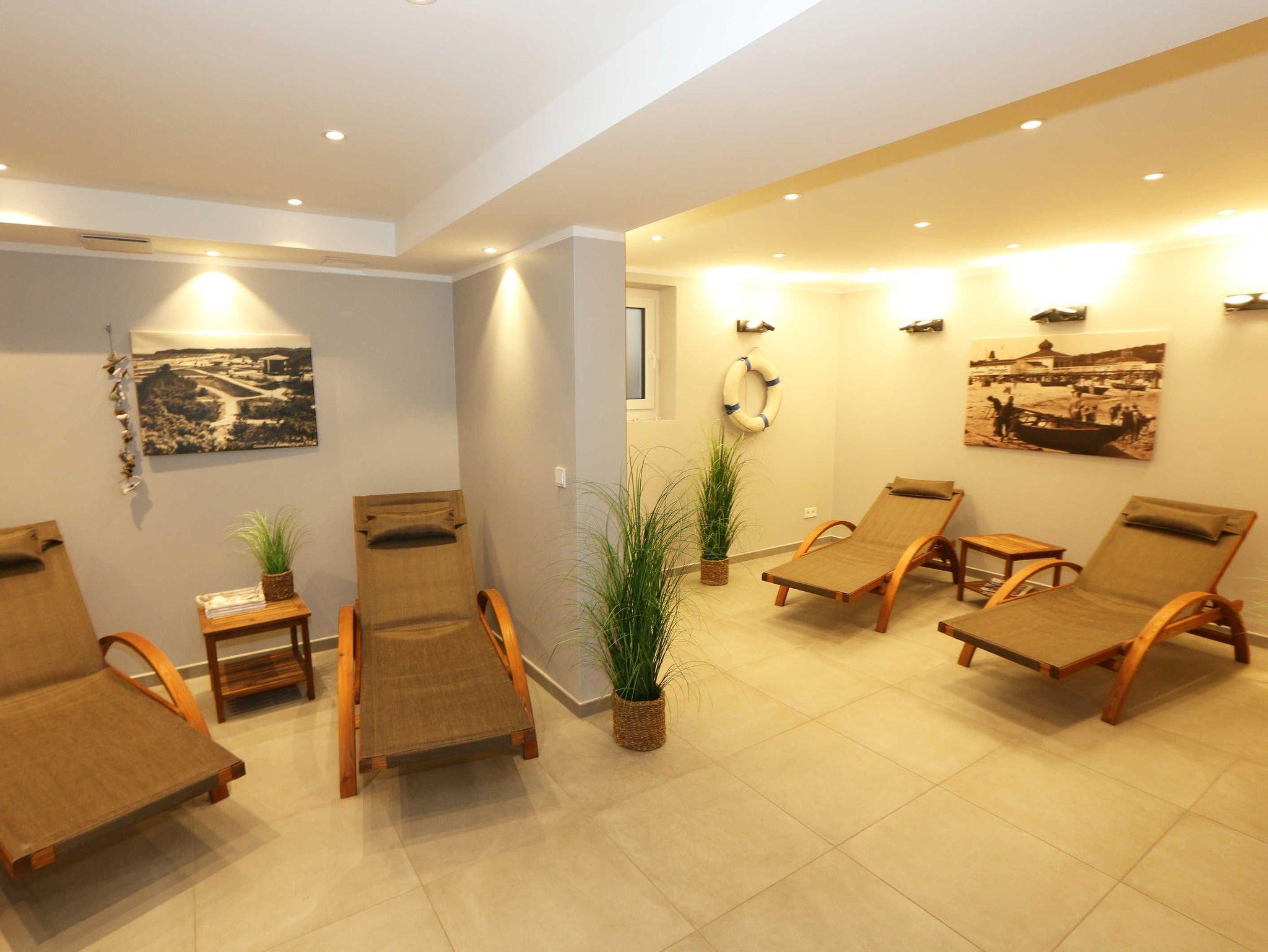 Die stilvoll und komfortabel eingerichtete Nichtraucherferienwohnung „Morgensonne“ befindet sich in der 1. Etage des Hauses. Es erwartet Sie eine 2 Raumwohnung mit einer Gesamtfläche von ca. 62 qm, welche Sie bequem mit dem Fahrstuhl erreichen können. Die Wohnung ist mit viel Liebe zum Detail ausgestattet und für maximal 2 Personen. Der offene Wohnbereich ist mit modernen Möbeln ausgestattet und verfügt über einen Couchtisch mit einem Sessel, Stehlampe, einem Sideboard und einer bequemen Ledercouch in modischen Farben. Für die Unterhaltung steht Ihnen ein Smart-TV von Loewe mit Blu-Ray-Player zur Verfügung ebenso wie eine kleine Auswahl an Urlaubslektüre und Musik-CD`s. Auch auf einen kostenlosen Internetanschluss (WLAN) müssen Sie nicht verzichten. Auf dem nach Osten zum Meer hin ausgerichteten und überdachten Balkon stehen Ihnen eine Sitzgarnitur mit Sonnenschirm für ein gemütliches Frühstück in der Morgensonne oder ein Glas Wein am Abend zur Verfügung. Dabei genießen Sie einen wundervollen Blick auf die Strandpromenade und die Ostsee. Die hochwertig eingerichtete Einbauküchenzeile besitzt Bosch-Hausgeräte mit Induktionskochfeld, Backofen, Kühlschrank mit Gefrierkombination, Mikrowelle, Toaster, Wasserkocher, Kombi Pad Kaffeemaschine mit Thermoskanne von Senseo, Eierkocher und verschiedenen Küchenutensilien. Der Essbereich schließt sich an und besteht aus einem Esstisch und gepolsterten Stühlen. Für einen erholsamen Schlaf steht Ihnen ein Boxspringbett (1,80m x 2,00m) zur Verfügung, mit durchgehendem Topper in Komforthöhe. Nachttischablagen mit Wandleuchten, ein großzügiger Kleiderschrank und ein Smart-TV ergänzen die Ausstattung im Schlafzimmer. Im Wohn ? und im Schlafzimmer gibt es außerdem einen Sichtschutz mit Faltjalousien, eine Verdunkelung mit Vorhängen sowie Insektenschutzgitter für einen erholsamen Schlaf. Von hier gelangen Sie auch auf Ihren Balkon. Im innenliegenden Bad finden Sie einen Waschtisch, ein Wandspiegel, eine ebenerdige Regendusche, ein WC, ein Fön, ein Handtuchtrockner und ein Kosmetikspiegel. Zur Entspannung nach dem Bad im Meer oder an kühlen Tag trägt die Infrarotsauna bei. Der Flurbereich ist mit einem Ganzkörperspiegel ausgestattet. Alle Räume haben geflieste Böden. Eine Fußbodenheizung sorgt an kühleren Tagen für wohlige Wärme. In einem separaten Abstellraum im Eingangsbereich befindet sich ein Staubsauger, ein Wäscheständer und div. Reinigungsutensilien. Zudem können Sie hier auch Ihre Koffer oder Badeutensilien aufbewahren. Ihre eigenen oder gemieteten Fahrräder können Sie in einen Fahrradständer im begrünten Außenbereich abstellen. In der Tiefgarage (Einfahrtshöhe 2,00m) steht Ihnen ein PKW-Abstellplatz (Nr. 15/Morgensonne) zur Verfügung. Im Untergeschoss des Gebäudes befindet sich ein weiterer Wellnessbereich mit einer Gemeinschaftssauna und einem Ruheraum. Ein Waschraum mit Waschmaschinen und Wäschetrockner stehen gegen Bezahlung zur Verfügung. Haustiere sind nicht erlaubt. Die Erstausstattung eines Wäschepaketes (komplette Bettwäsche, 1 Duschhandtuch, 2 kleine Handtücher) können Sie bis 14 Tage vor der Anreise gegen einen Aufpreis dazu buchen oder durch eigene ergänzen. Ab 2 gebuchten Paketen erhalten Sie einmalig 1 Geschirrtuch und einen Duschvorleger dazu.