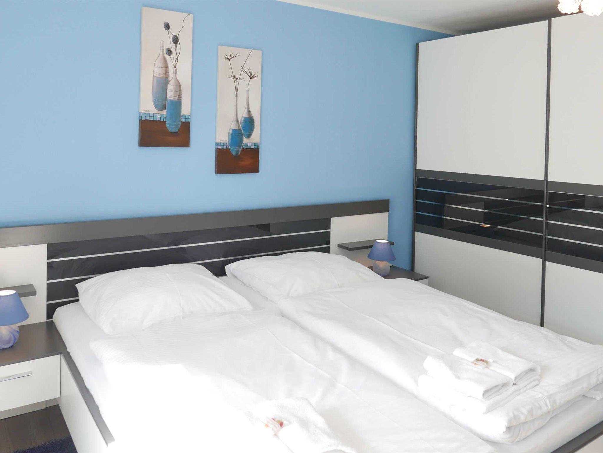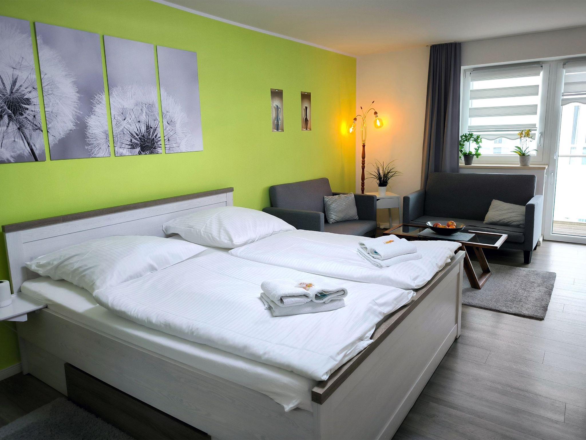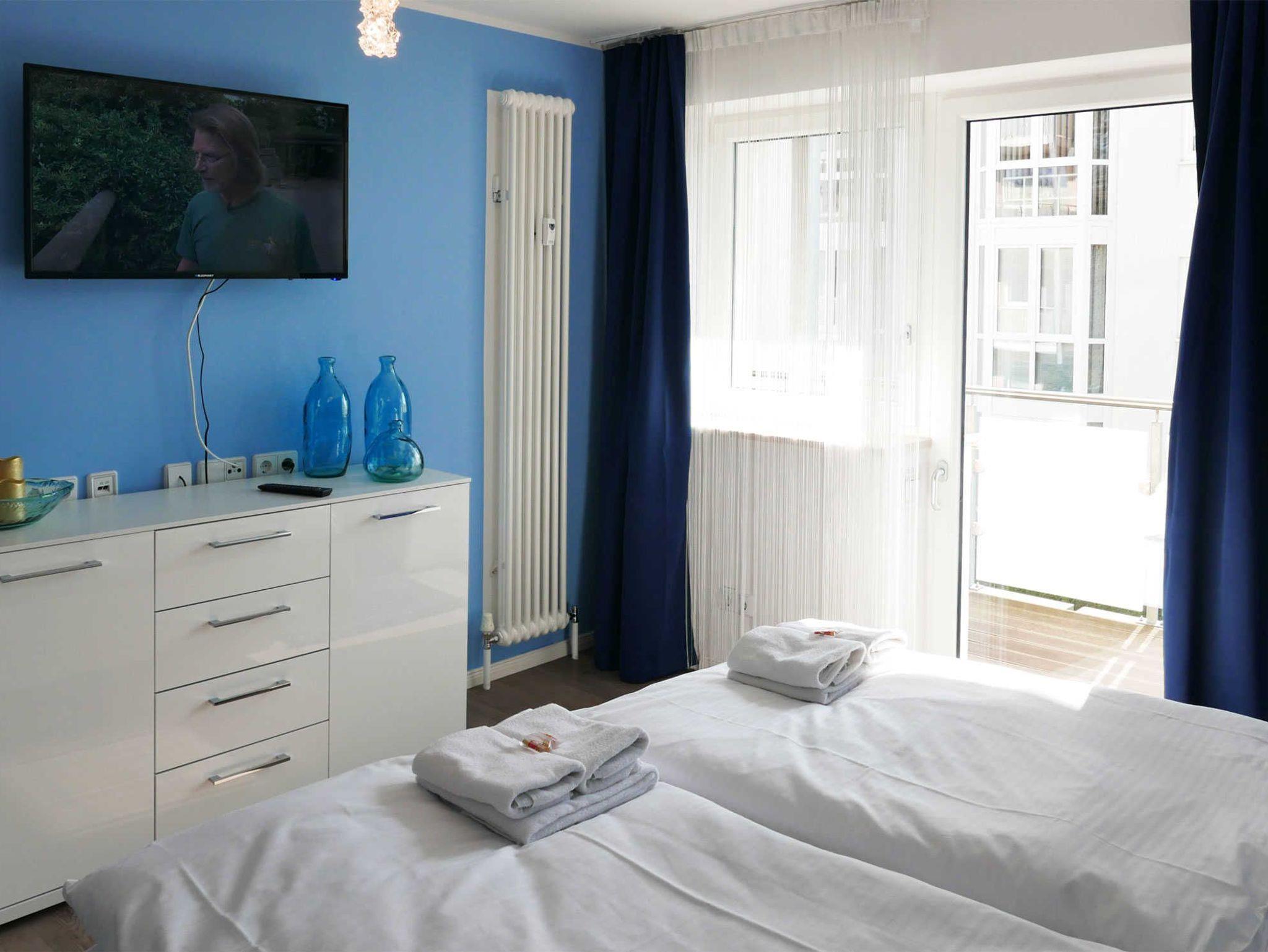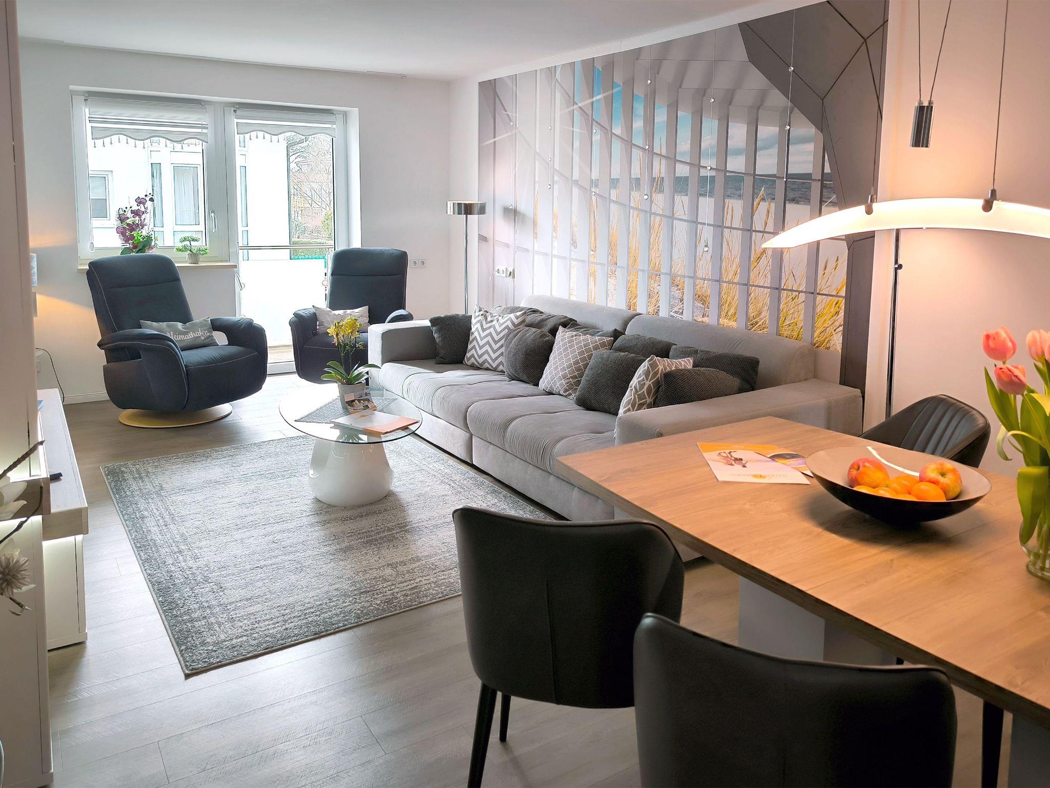 Moderne 3-Zimmer-Ferienwohnung mit erlesener Einrichtung für bis zu 4 Personen mit zwei Schlafzimmer, zwei Bädern und einem Balkon auf 104 qm. Eine Saunalandschaft und ein Fitnessbereich befinden sich überdies in dem Haus. Aufzug, WLAN, Parkplatz sind ebenfalls vorhanden.