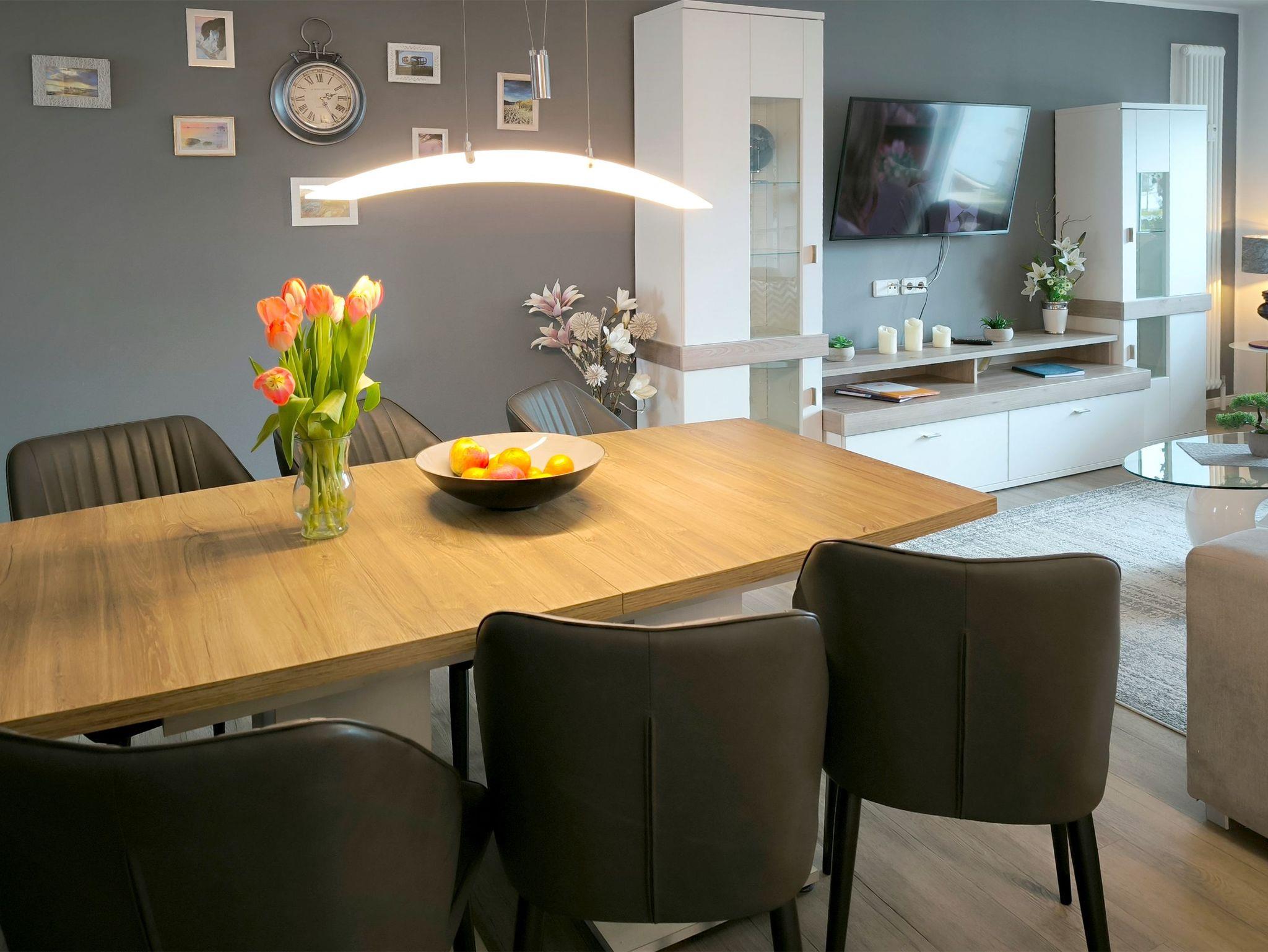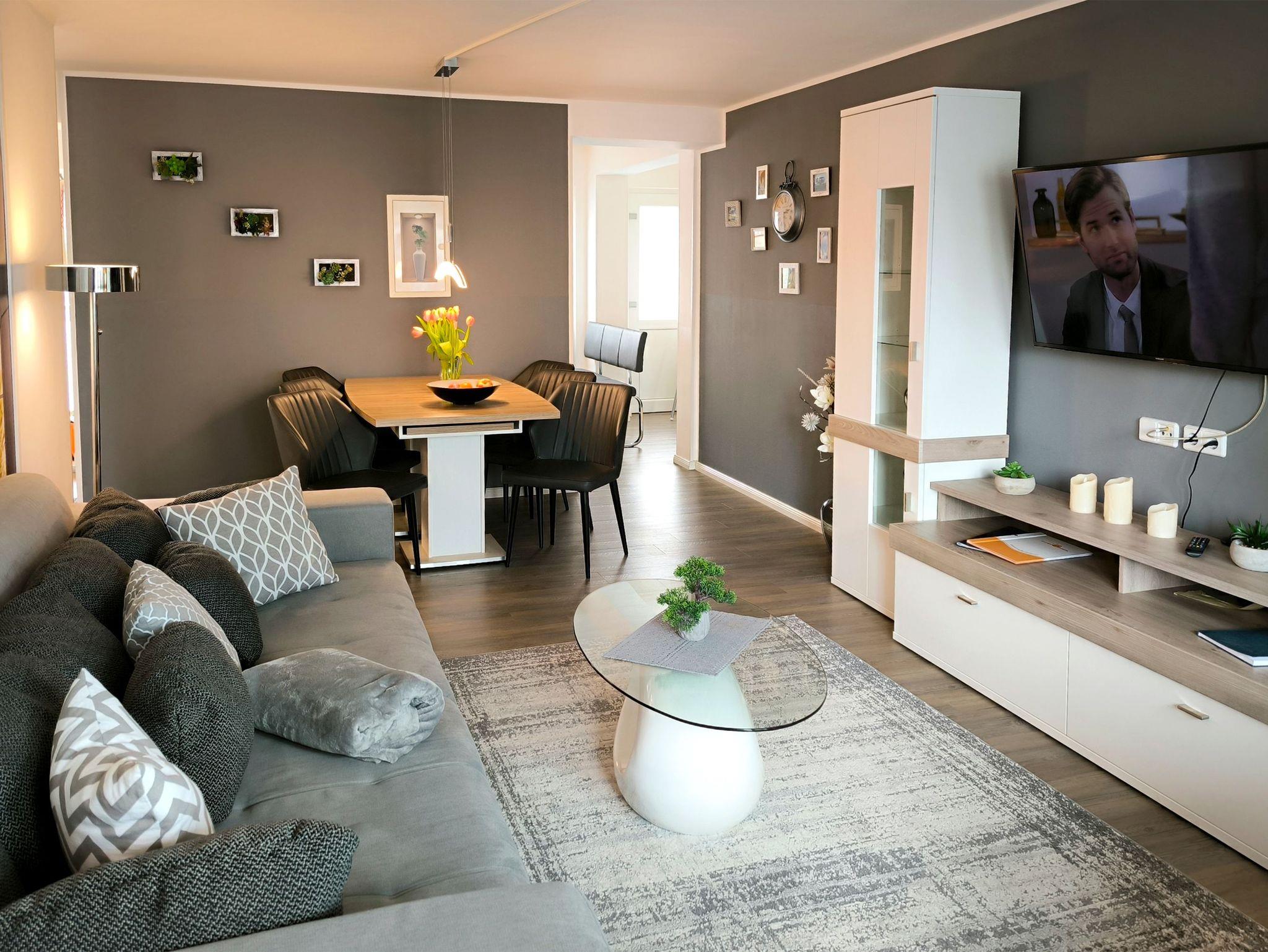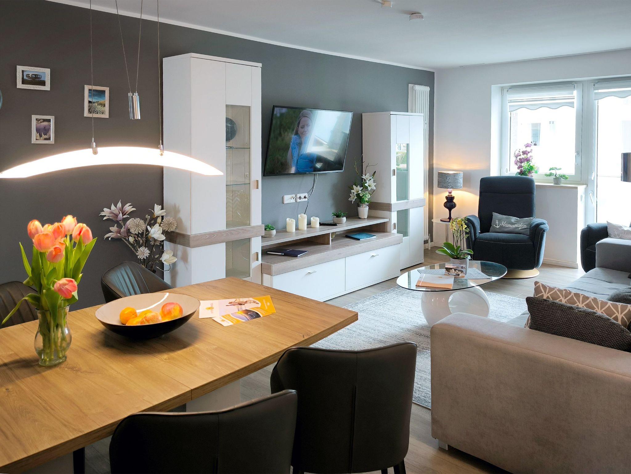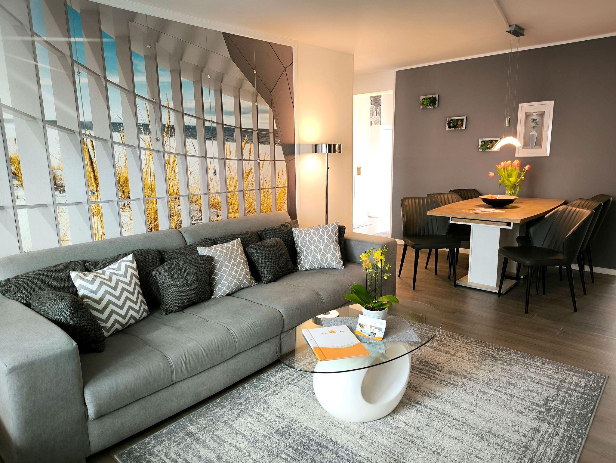 Individuell-moderne Ferienwohnung für 4 Personen: In dieser liebevoll eingerichteten Wohnung mit vielen schönen Details finden Sie auf 104 qm alles, was man für einen gelungenen Urlaub benötigt. In dem Wohnzimmer lässt sich auf dem hochwertigem Sofa und den bequemen Sesseln herrlich entspannen und zur Ruhe kommen.