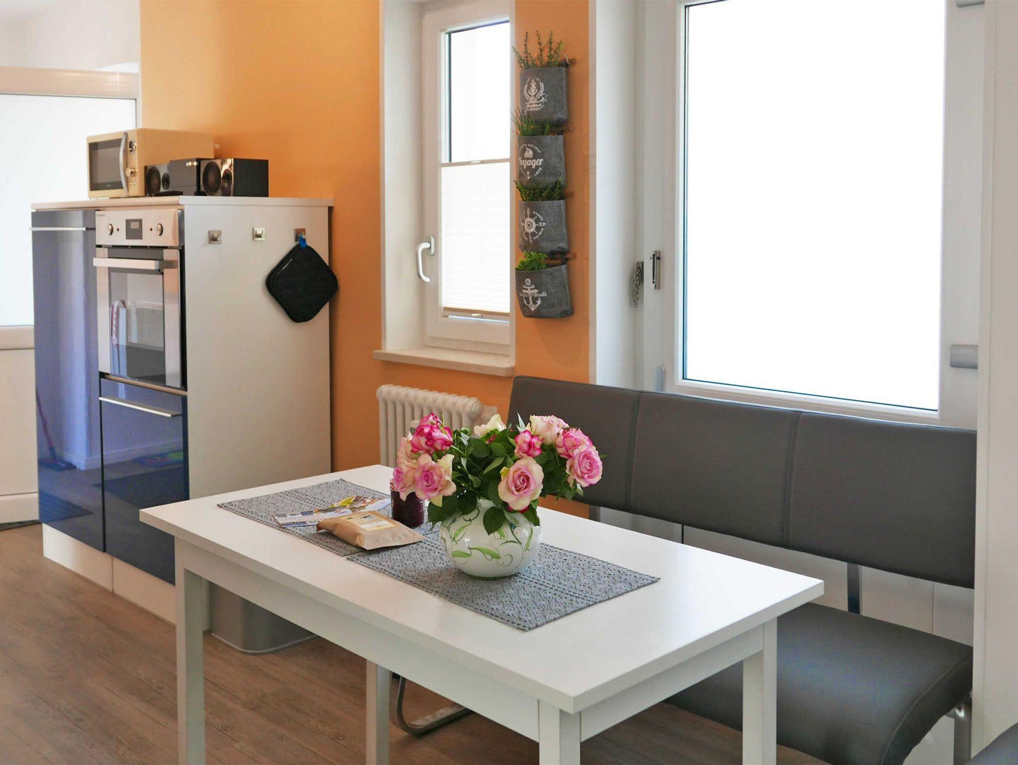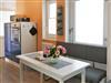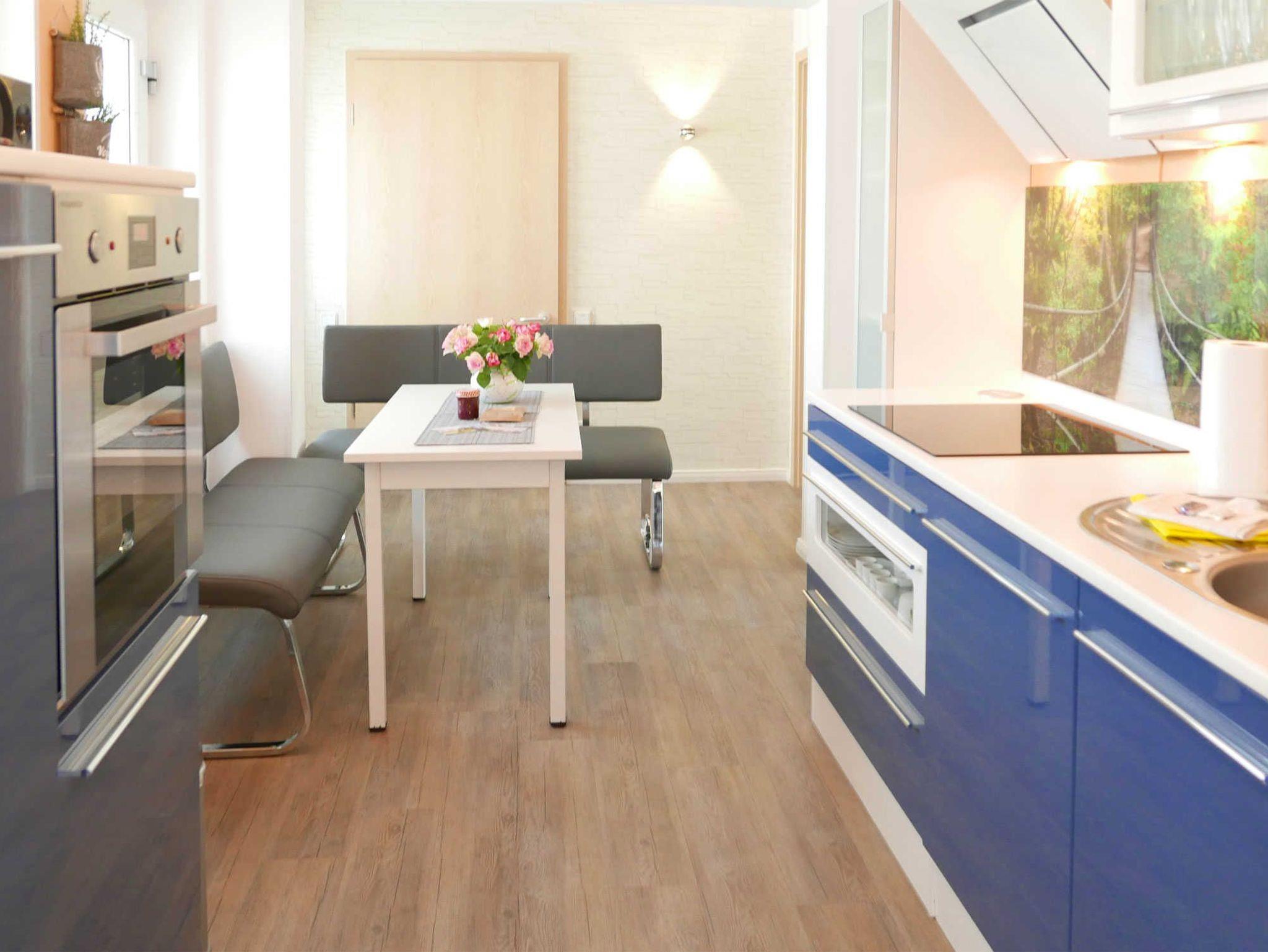 In der Küche befindet sich ein 4-Plattenherd, Backofen, Kühlschrank mit Gefrierfach, Geschirrspülmaschine, Mikrowelle, Kaffeemaschine und ein Toaster. Zudem gibt es einen gemütlichen Sitzbereich.