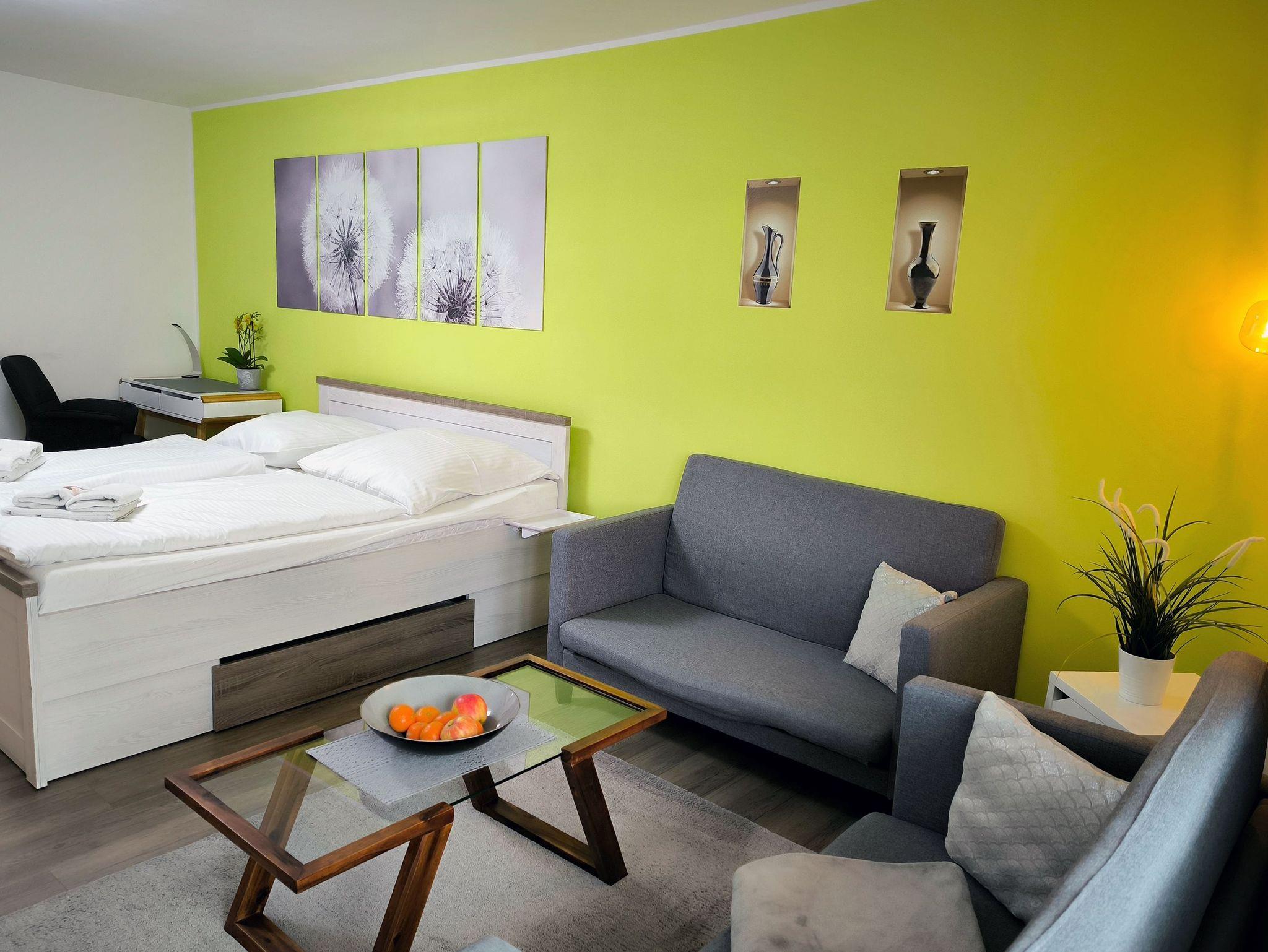 Eines der zwei Schlafzimmer ist mit einem Doppelbett und einem weiteren Fernseher ausgestattet. Das zweite Schlafzimmer kann zum einen als Schlafgemach, zum anderen als weiteres Wohnzimmer genutzt werden, denn hier befindet sich eine weitere Sofaecke und zusätzlich ein Schreibtisch. Das Bett ist ausziehbar und kann somit als Einzel- oder auch als Doppelbett eingesetzt werden.