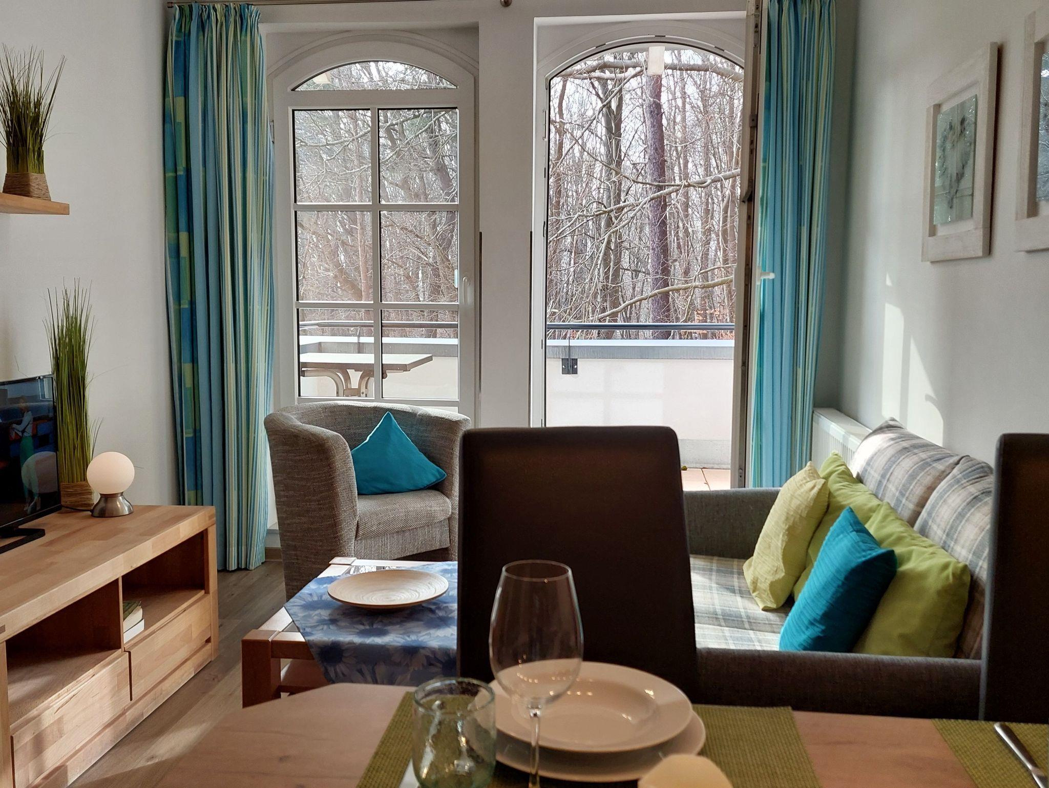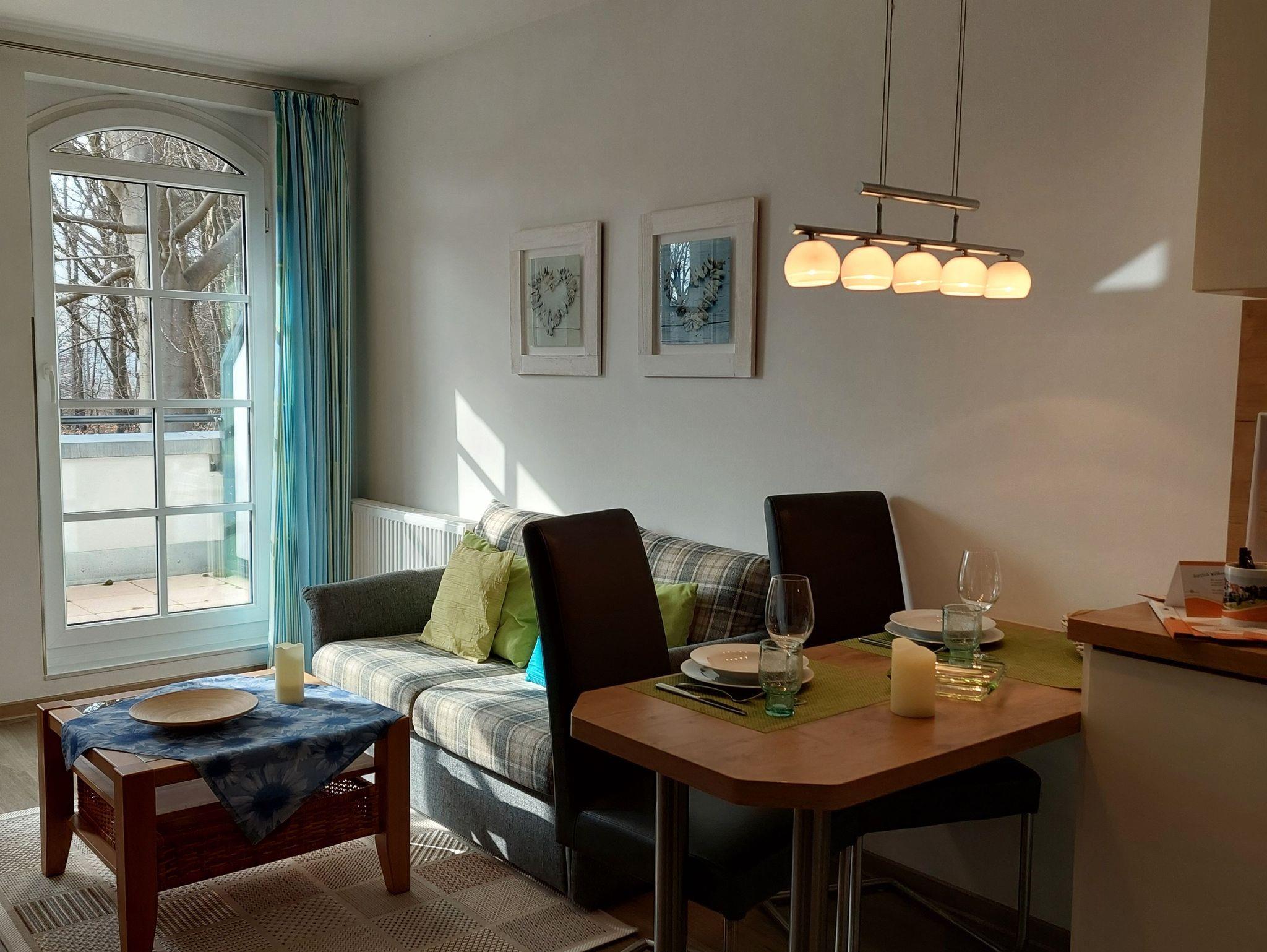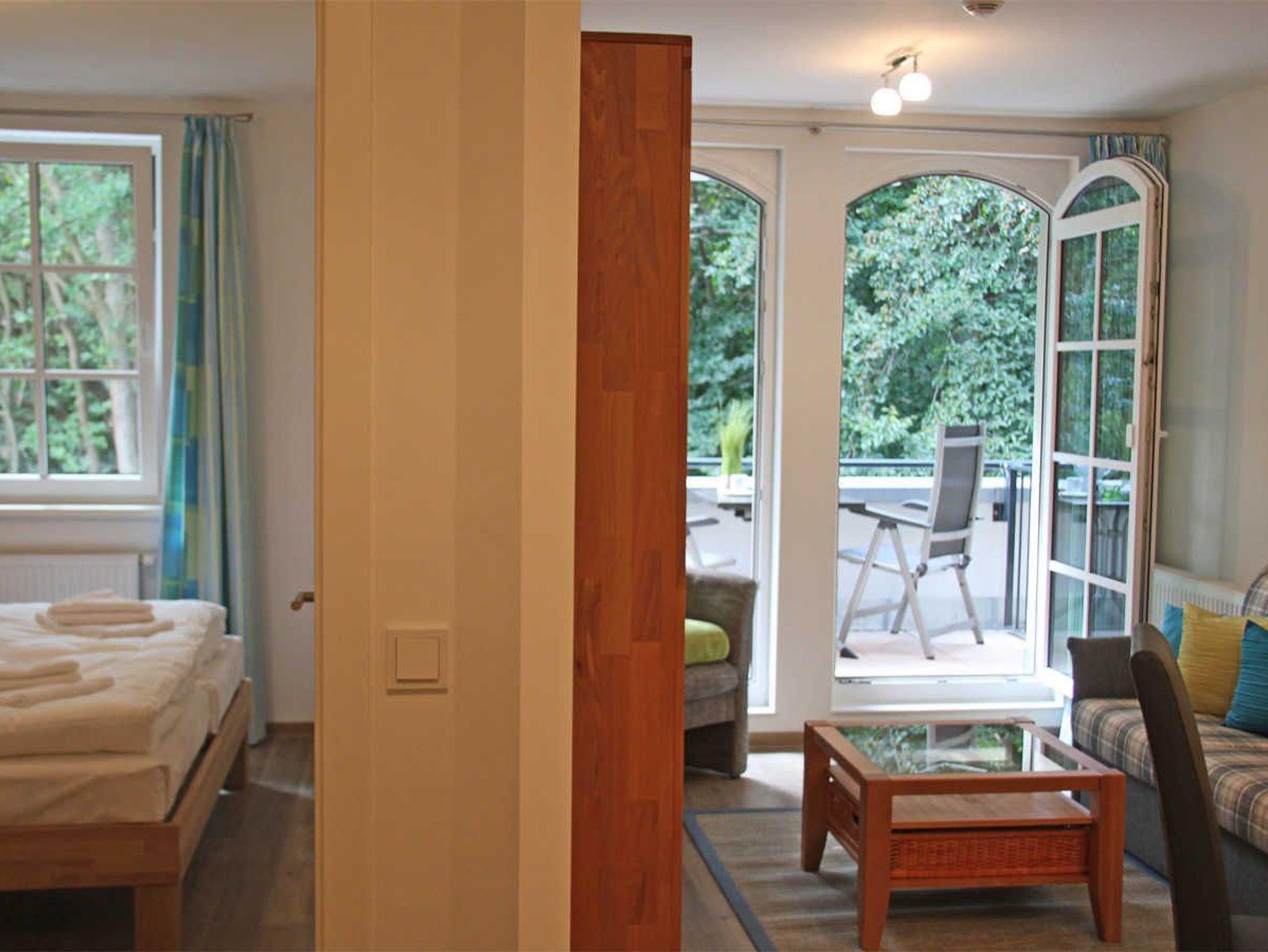 Kleine aber feine Ferienwohnung für 3 Personen mit Balkon und schönen Blick ins Grüne. Die Ferienwohnung liegt in der 3. Etage vom Haus Meeresblick. Das erst 2013 neu eröffnete Haus Meeresblick mit Schwimmbad, Massage- und Saunabereich liegt direkt am Strand von Baabe.