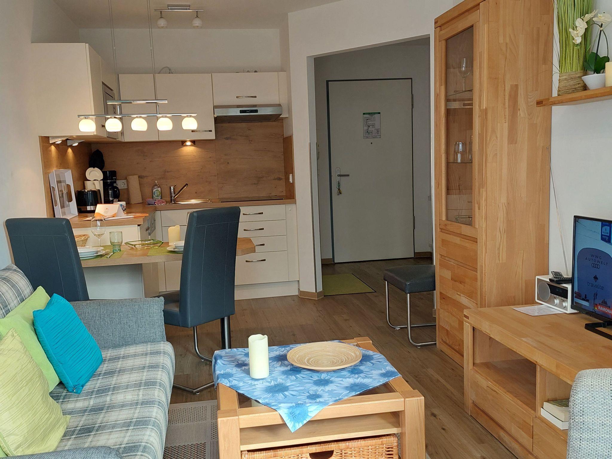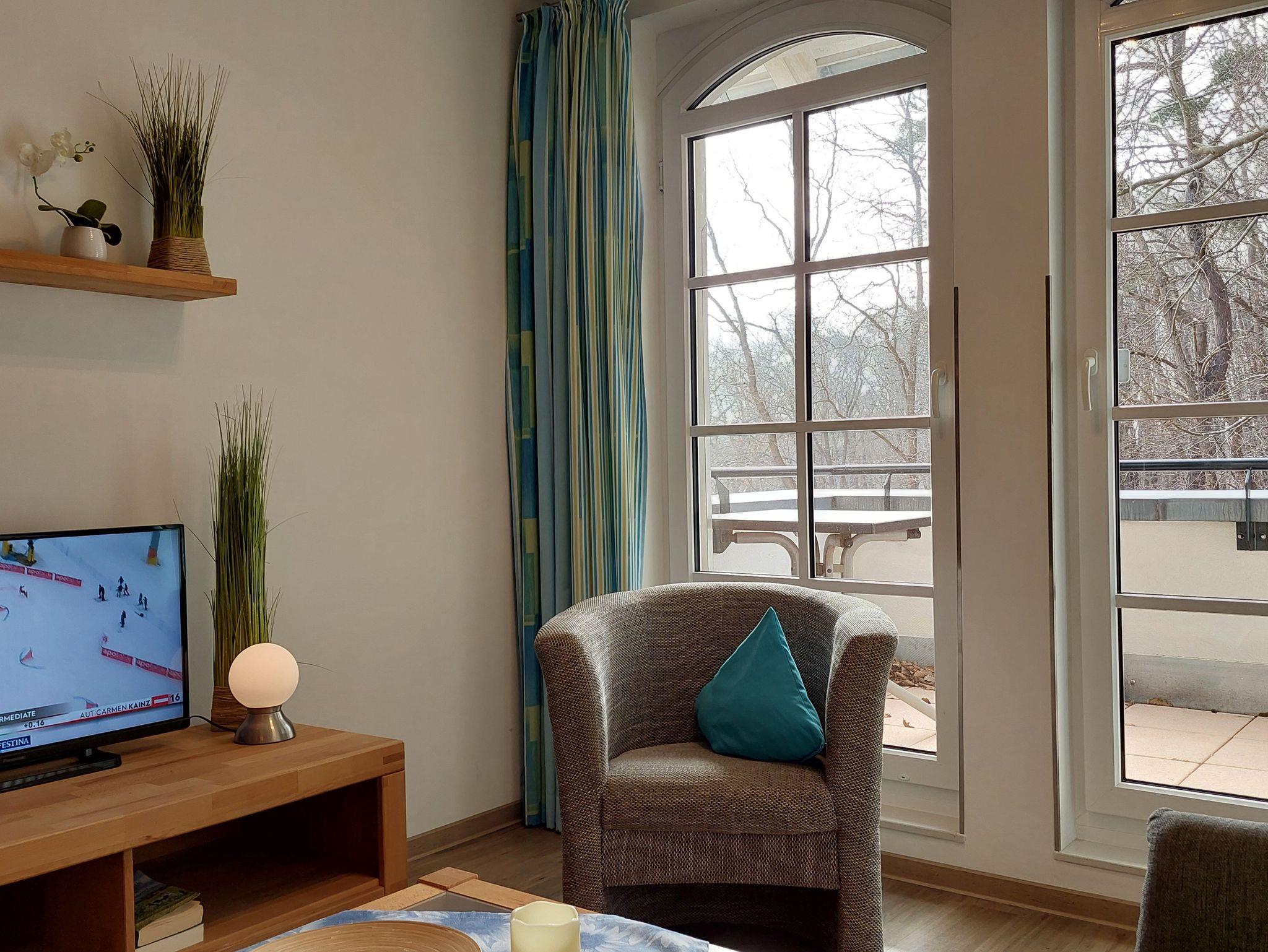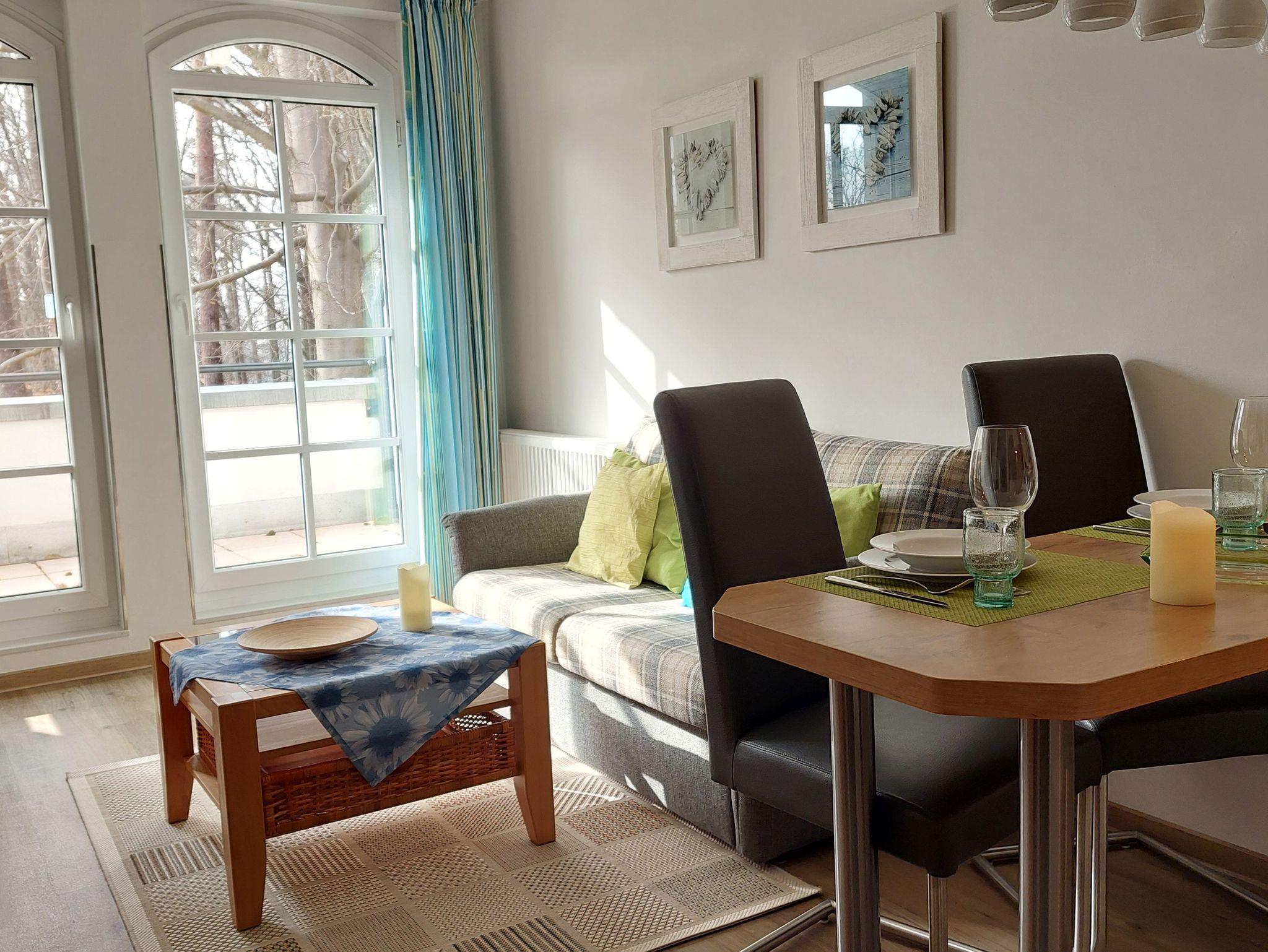 Kleine aber feine Ferienwohnung für 3 Personen mit Balkon und schönen Blick ins Grüne. Die Ferienwohnung liegt in der 3. Etage vom Haus Meeresblick. Das erst 2013 neu eröffnete Haus Meeresblick mit Schwimmbad, Massage- und Saunabereich liegt direkt am Strand von Baabe.