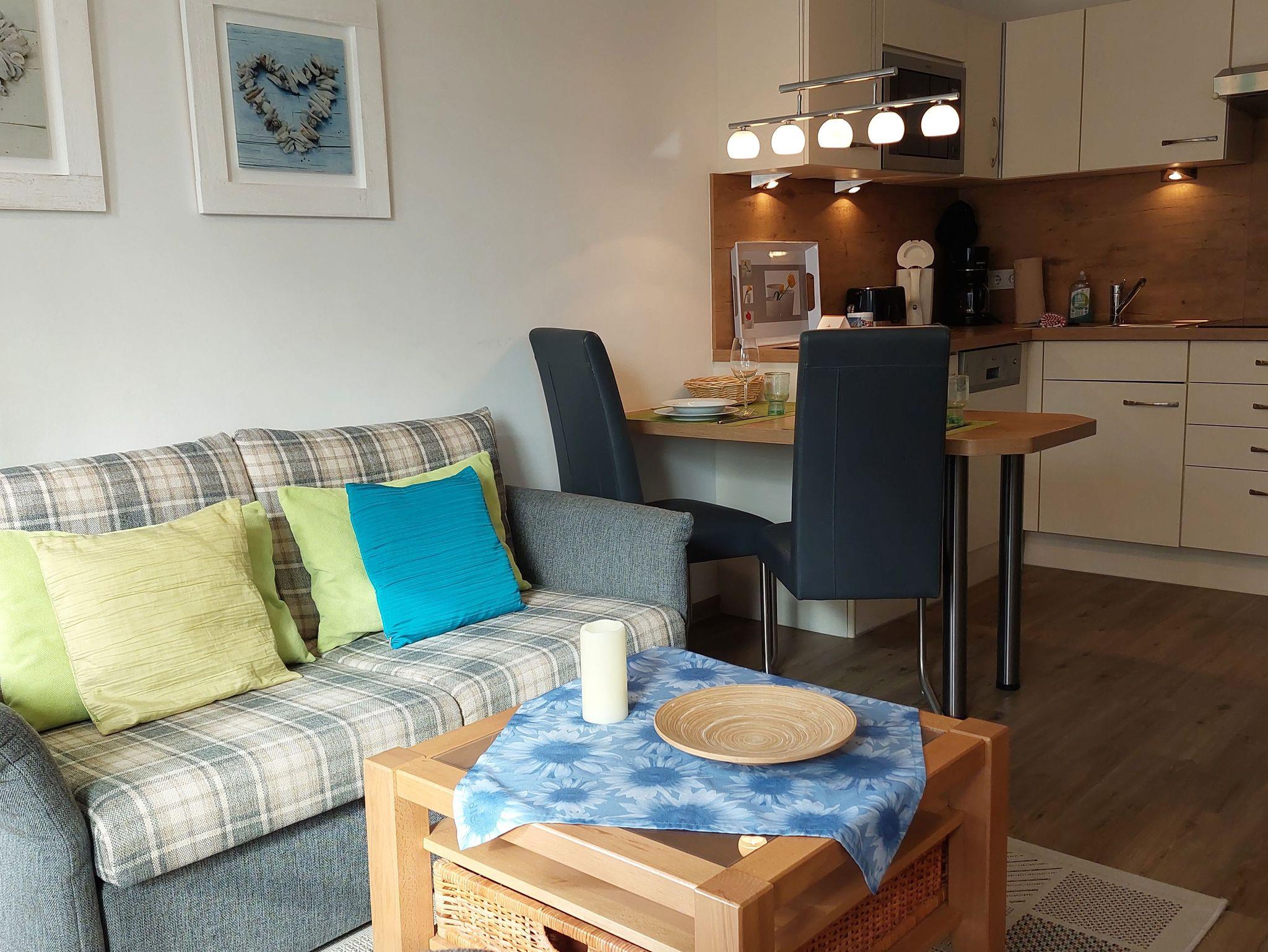 Hell, freundlich und Platz für 2-3 Personen: Die Nichtraucher-Ferienwohnung Strandkrabbe hat ein separates Schlafzimmer mit Doppelbett sowie ein Schlafsofa für eine dritte Person im Wohn- und Essbereich. Dort steht Ihnen auch der Fernseher sowie eine gut ausgestattete Küchenzeile zur Verfügung. Sie hat einen 4-Plattenherd, eine Spülmaschine, einen Kühlschrank mit Gefrierfach, eine Mikrowelle, eine Kaffeemaschine und einen Toaster.