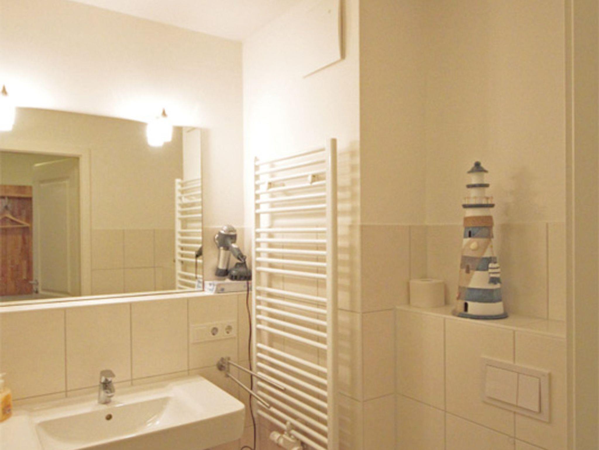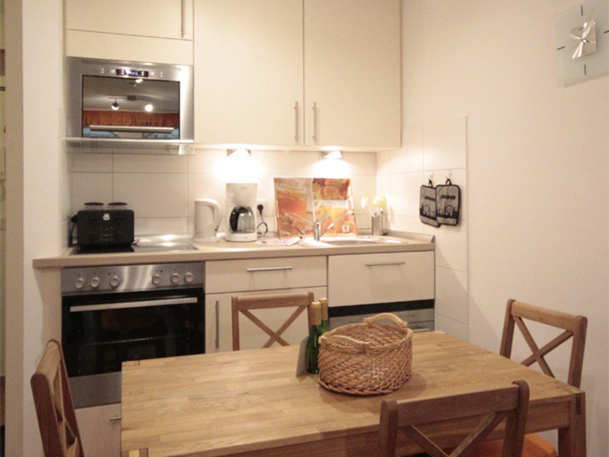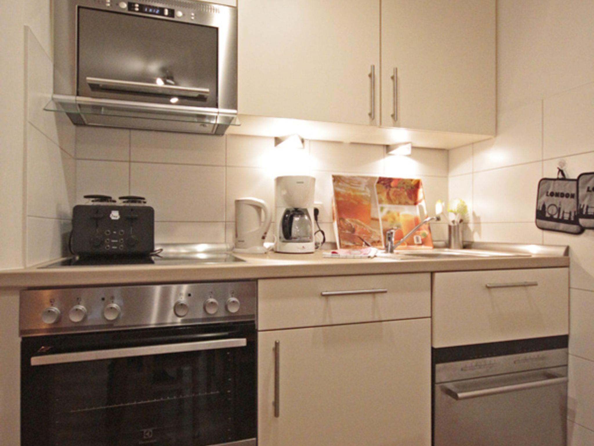 Die Küchenzeile (ebenfalls für große Menschen geeignet) hat einen 4-Plattenherd inklusive Backofen, eine Spülmaschine, einen Kühlschrank mit Gefrierfach, eine Mikrowelle, einen Toaster, eine Kaffeemaschine sowie einen Eier- und Wasserkocher. Außerdem stehen Ihnen Staubsauger, Bügelbrett, Bügeleisen, Wäschespinne und ein Haartrockner (im stufenfreien Bad) zur Verfügung.