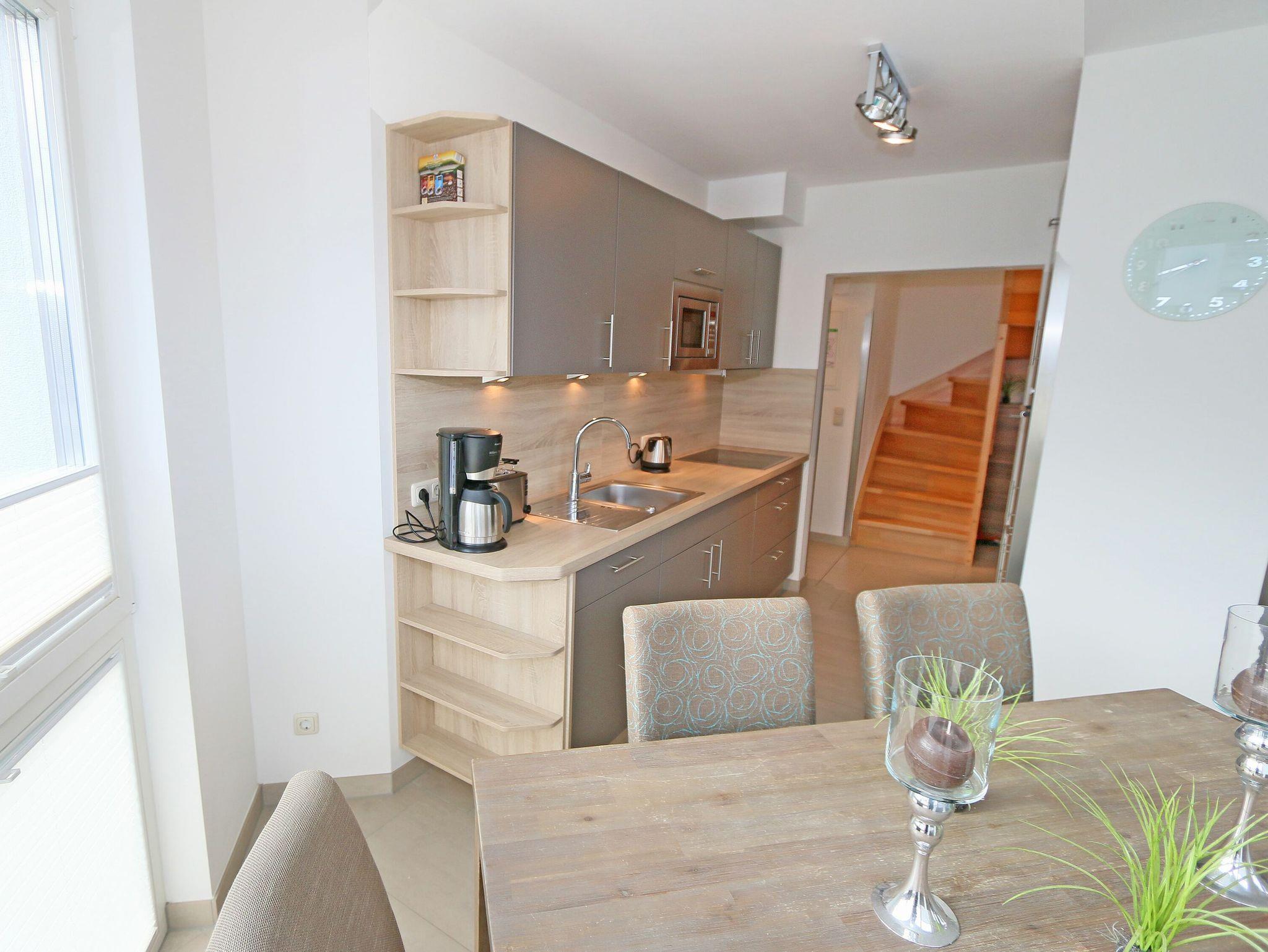 • Küchenzeile mit Waschmaschine, Geschirrspüler, Kühlschrank mit Gefrierfach, Backofen, 4 Zonen-Cerankochfeld, Mikrowelle, Kaffeemaschine, Toaster, Wasserkocher und diversen Küchenutensilien