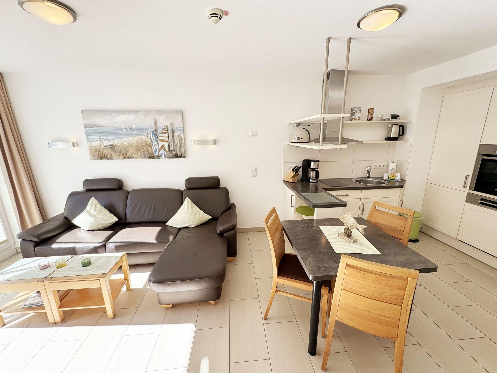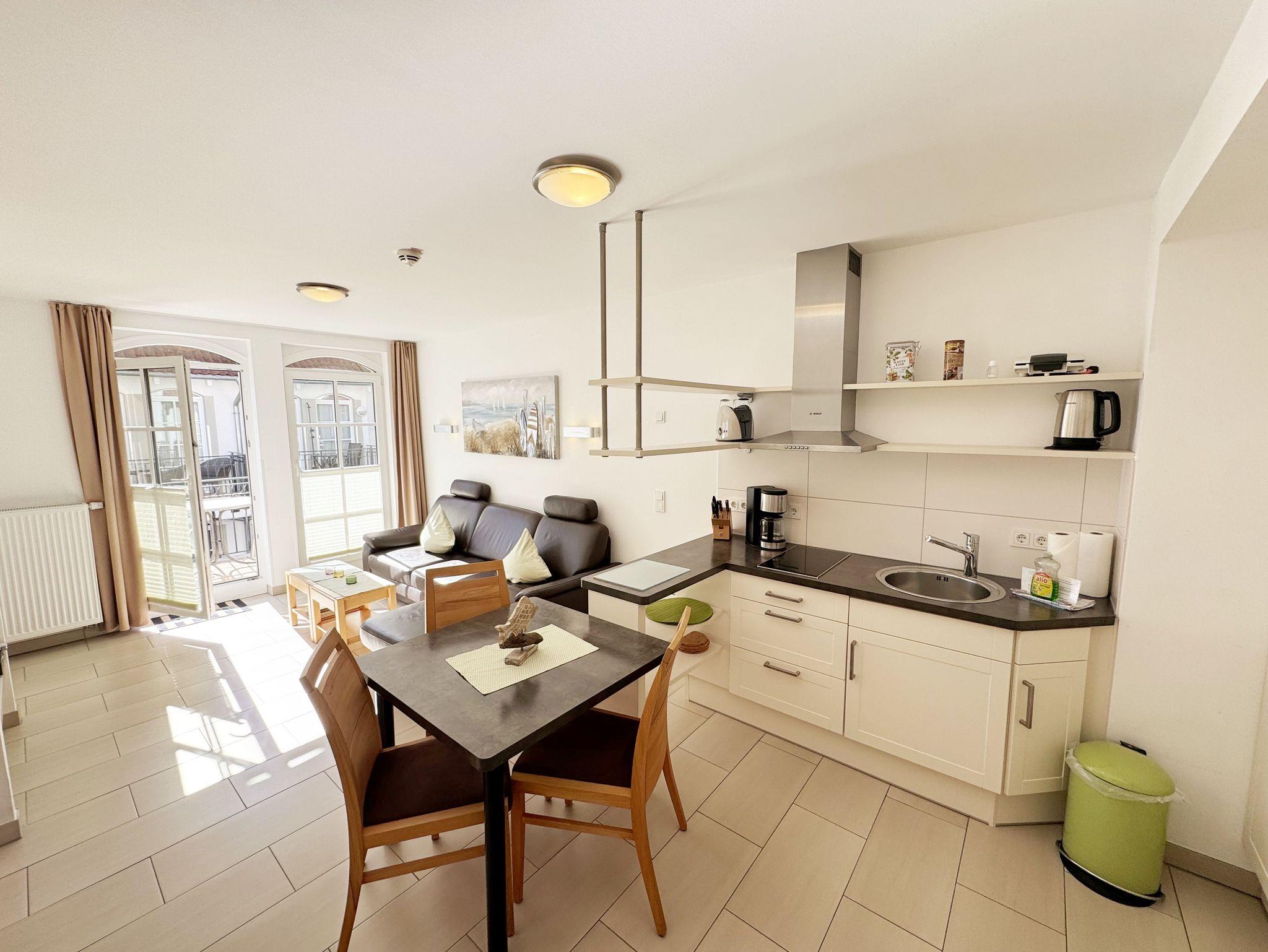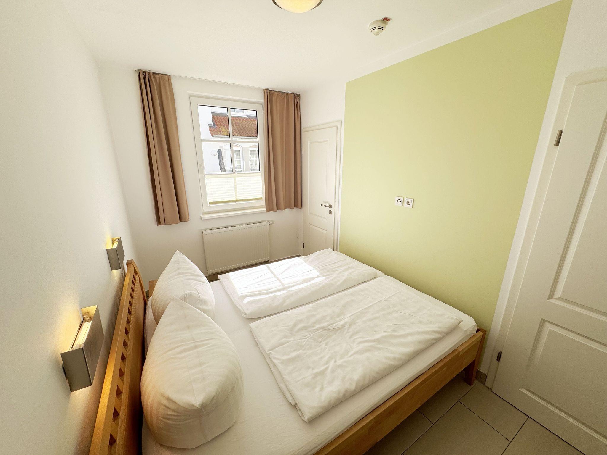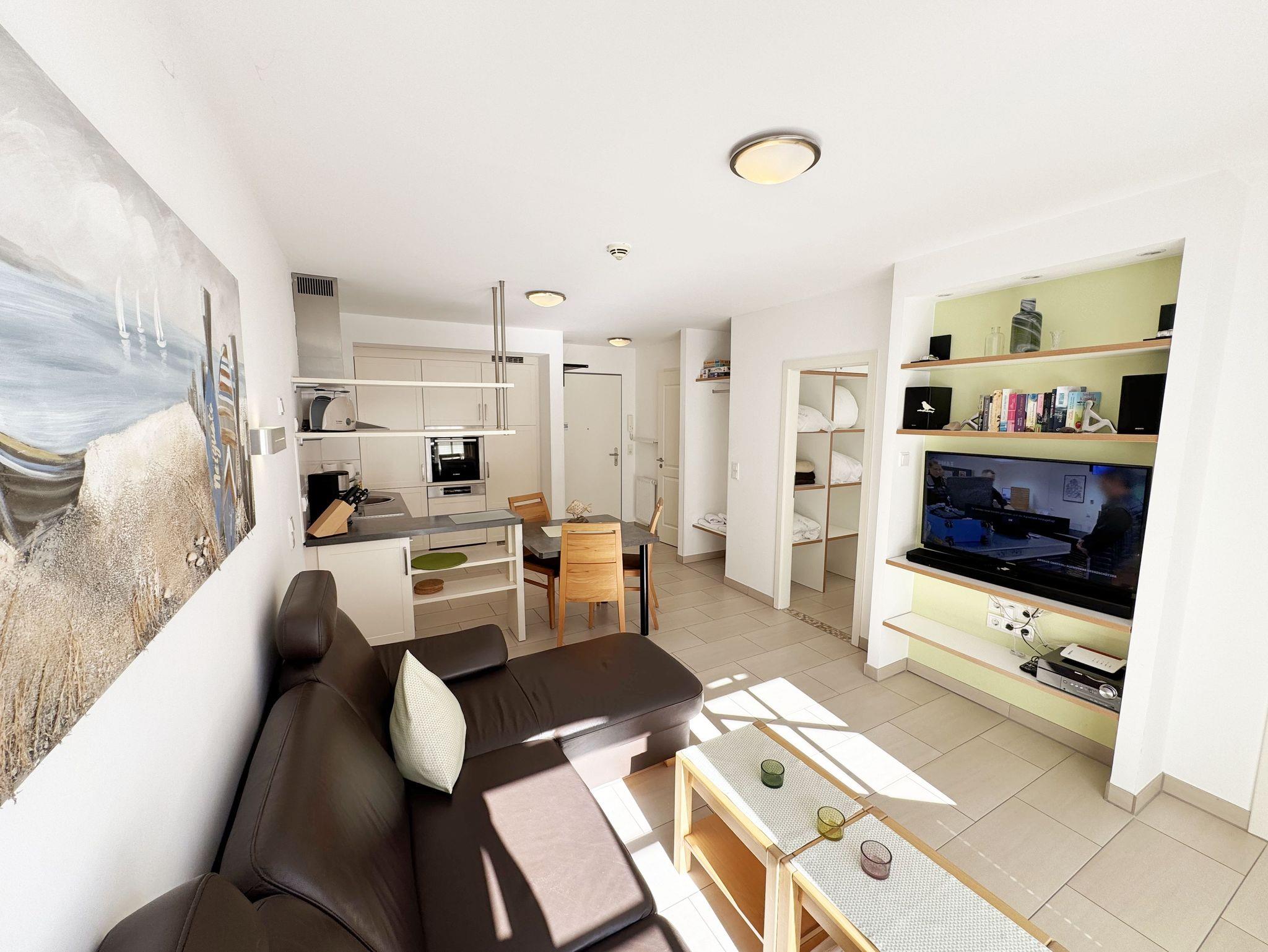 Ihre Nichtraucher-Ferienwohnung ist mit viel Liebe zum Detail ausgestattet und eingerichtet. Sie wohnen in einer ca. 40 m² großen 2-Zimmerwohnung, die ideal für 2 Personen ist (Aufbettungsmöglichkeit im Wohnbereich für eine 3. Person). Die Wohnung A 2.11 befindet sich in der 2. Etage und ist per Fahrstuhl bequem zu erreichen. In der Wohnung finden Sie einen kombinierten Wohn-/Koch- und Essbereich. Die integrierte Küchenzeile lässt mit Backofen, Ceranfeld, Spülmaschine, Kühlschrank mit Gefrierfach, Kaffeemaschine, Wasserkocher, Toaster und anderen praktischen Helfern keine Wünsche offen. Im Wohnbereich sind weiterhin eine Essecke sowie eine gemütliche Couch (1,20 m x 2,00 m) mit Ottomane, Couchtisch, Smart-TV, Blu-Ray-Player und Mini-Stereoanlage vorhanden. Auch auf einen Internetanschluss (WLAN/LAN) müssen Sie nicht verzichten. Dieser ist für Sie inklusive. Der Balkon ist vom Wohn-/Essbereich begehbar und komplett möbliert. Von hier aus haben Sie einen Blick in Richtung Inselparadies. Das Schlafzimmer ist mit einem Doppelbett (1,60 m x 2,00 m) mit verstellbaren Lattenrosten (Kopfteil), Nachttischkonsolen sowie einem offenen Kleiderschrank ausgestattet. Der Wohn- und Schlafraum kann abgedunkelt werden. Das Bad verfügt über eine ebenerdige Dusche, Waschbecken, Fön, WC und Handtuchheizkörper. Ein eigener PKW-Stellplatz Nr. 31 (Einfahrtshöhe 2,00m) befindet sich in der Tiefgarage des Hauses. Im Keller des Hauses haben Sie die Möglichkeit eine Waschmaschine/Trockner gegen Gebühr zu nutzen. Haustiere sind nicht erlaubt. Mit dem Fahrstuhl des Hauses A gelangen sie in das Untergeschoss der Meeresblickanlage, wo Sie ein großzügiger und heller Wellnessbereich erwartet. Hier können sie in einem Pool kleine Bahnen schwimmen, in 2 Saunen Ihren Kreislauf in Schwung bringen, in einem dazugehörigen Ruheraum Ihren Körper wieder beruhigen, in einer Schneckendusche sowie weiteren Duschen das kühle Nass genießen und auf einer Außenterrasse mit Außendusche die frische Luft einatmen. Die Erstausstattung eines Wäschepaketes (komplette Bettwäsche, 1 Duschhandtuch, 2 kleine Handtücher) können Sie bis 14 Tage vor Anreise gegen einen Aufpreis dazu buchen oder durch eigene ergänzen. Ab 2 gebuchten Paketen erhalten Sie einmalig 1 Geschirrhandtuch und 1 Duschvorleger hinzu.