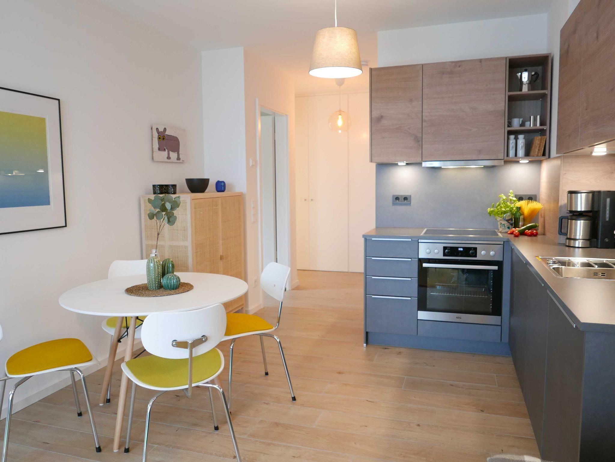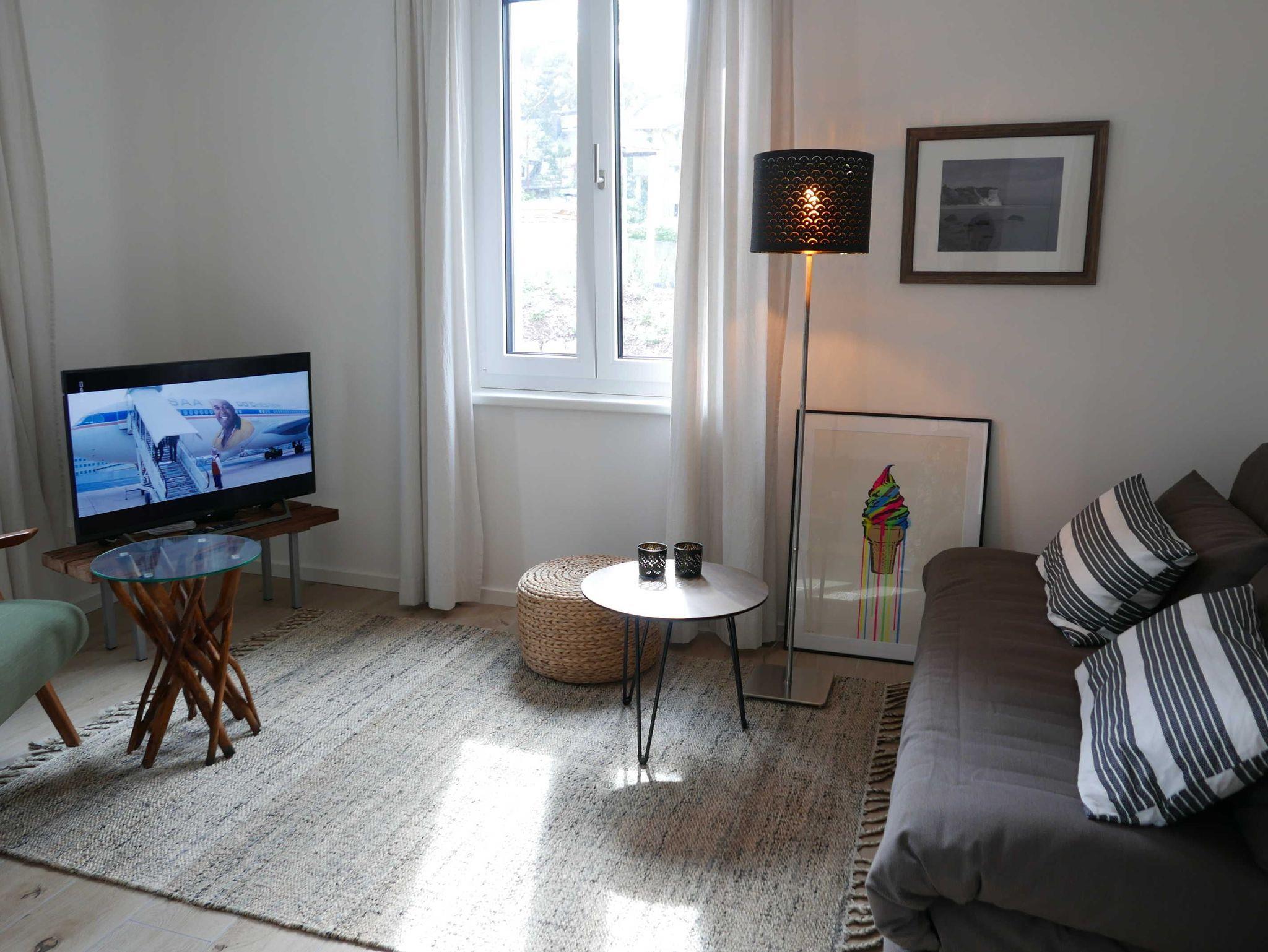 Die moderne helle Ferienwohnung für 4 Personen bietet allen Komfort für einen entspannten Urlaub und ist mit viel Gespür für Design eingerichtet. Sie verfügt über eine Terrasse mit kleinem Garten sowie einem Tisch mit 4 Stühlen. Die Wohnung eignet sich für 4 Personen und bietet Ihnen 2 separate Schlafmöglichkeiten in 2 Schlafräumen. Neben der Wohnküche gibt es noch ein extra Schlaf-/Wohnzimmer mit einem hochwertigen Schlafsofa mit extra Matratze (1,56 x 1,98 m). Sofern Sie nur zu zweit reisen, haben Sie so noch ein zusätzliches separates Wohnzimmer. Das Schlafzimmer ist mit einem Boxspringbett (1,60 x 2,00 m) und einem weiteren Fernseher ausgestattet. WLAN ist selbstverständlich vorhanden.