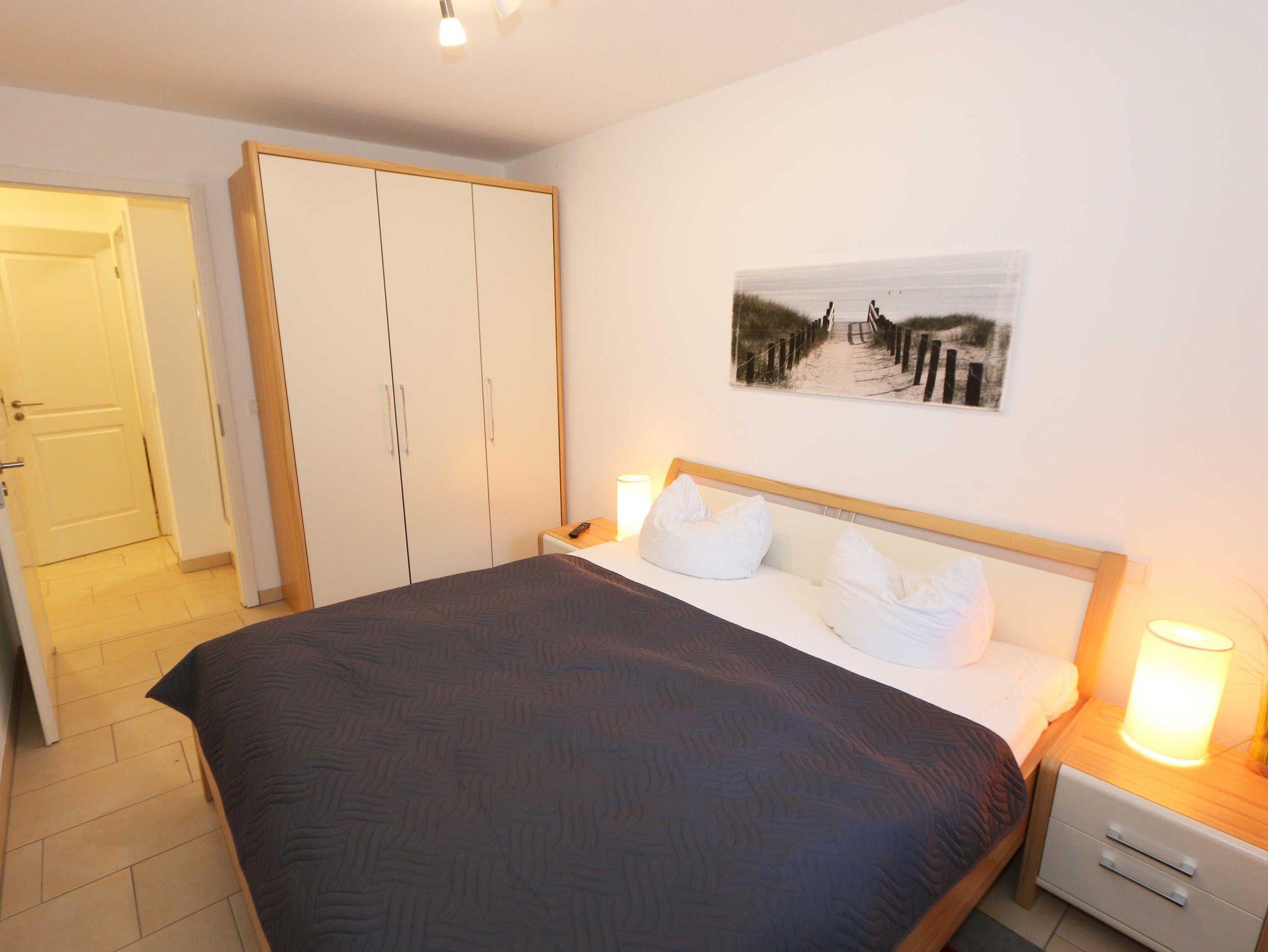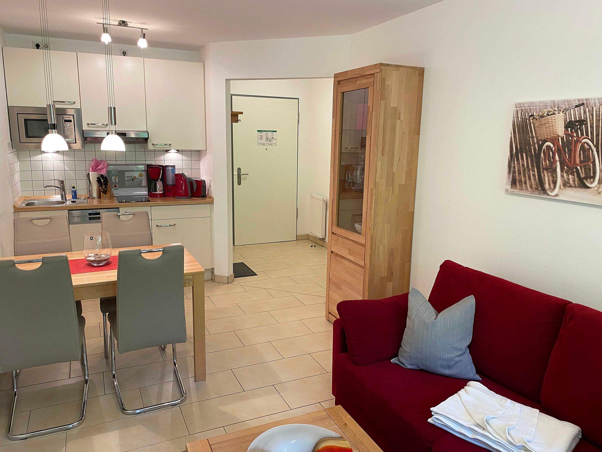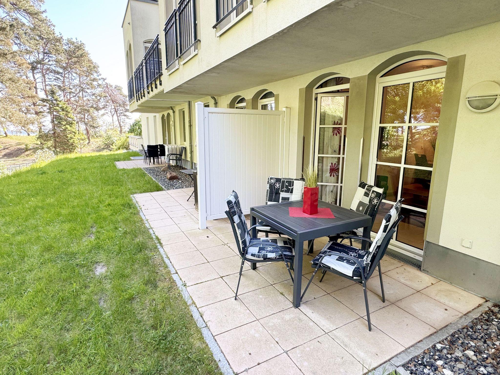 Ihre Nichtraucher-Ferienwohnung ist mit viel Liebe zum Detail ausgestattet und eingerichtet. Sie wohnen in einer ca. 40 m² großen 2-Zimmerwohnung, die für max. 2 Erwachsene + 1 Kleinkind bis 3 Jahre im Kinderreisebett ausgelegt ist. Die Wohnung A 0.14 befindet sich im Erdgeschoss und ist per Fahrstuhl aus der Tiefgarage bequem zu erreichen. In der Wohnung finden Sie einen kombinierten Wohn-/Koch- und Essbereich. Die integrierte Küchenzeile lässt mit Mikrowelle mit Grillfunktion, Ceranfeld, Spülmaschine, Kühlschrank mit Gefrierfach, Kaffeemaschine, Wasserkocher, Toaster und anderen praktischen Helfern keine Wünsche offen. Im Wohnbereich ist weiterhin eine Essecke sowie eine gemütliche Couch, Couchtisch, Leselampe, Smart-TV und Mini-Stereoanlage mit USB-Anschluss vorhanden. Auch auf einen Internetanschluss (WLAN/LAN) müssen Sie nicht verzichten. Dieser ist für Sie inklusive. Die Terrasse ist vom Wohn-/Essbereich begehbar und möbliert. Von der windgeschützten Terrasse (Nord/West) blickt man durch den Kiefernbaumbestand seitlich in Richtung Meer. Das Schlafzimmer ist mit einem Doppelbett (1,80 m x 2,00 m) mit verstellbaren Lattenrosten (Kopfteil), Nachttischkonsolen, einem Smart-TV, Insektenschutzgitter sowie einem Kleiderschrank ausgestattet. Der Wohn- und Schlafraum kann abgedunkelt werden. Das Bad verfügt über eine ebenerdige Dusche, Waschbecken, Fön, Kosmetikspiegel, WC und Handtuchheizkörper. Ein Kinderhochstuhl und ein Kinderreisebett (ohne Zusatzmatratze, ohne Bett Inlett) stehen Ihnen inklusive zur Verfügung. Ein eigener PKW-Stellplatz (Nr.50, Einfahrtshöhe 2,00m) befindet sich in der Tiefgarage des Hauses. Im Keller des Hauses haben Sie die Möglichkeit eine Waschmaschine/Trockner gegen Gebühr zu nutzen. Haustiere sind nicht erlaubt. Mit dem Fahrstuhl des Hauses A gelangen sie in das Untergeschoss der Meeresblickanlage, wo Sie ein großzügiger und heller Wellnessbereich erwartet. Hier können sie in einem Pool kleine Bahnen schwimmen, in 2 Saunen Ihren Kreislauf in Schwung bringen, in einem dazugehörigen Ruheraum Ihren Körper wieder beruhigen, in einer Schneckendusche sowie weiteren Duschen das kühle Nass genießen und auf einer Außenterrasse mit Außendusche die frische Luft einatmen. Die Erstausstattung eines Wäschepaketes (komplette Bettwäsche, 1 Duschhandtuch, 2 kleine Handtücher) können Sie bis 14 Tage vor Anreise gegen einen Aufpreis dazu buchen oder durch eigene ergänzen. Ab 2 gebuchten Paketen erhalten Sie einmalig 1 Geschirrhandtuch und 1 Duschvorleger hinzu.