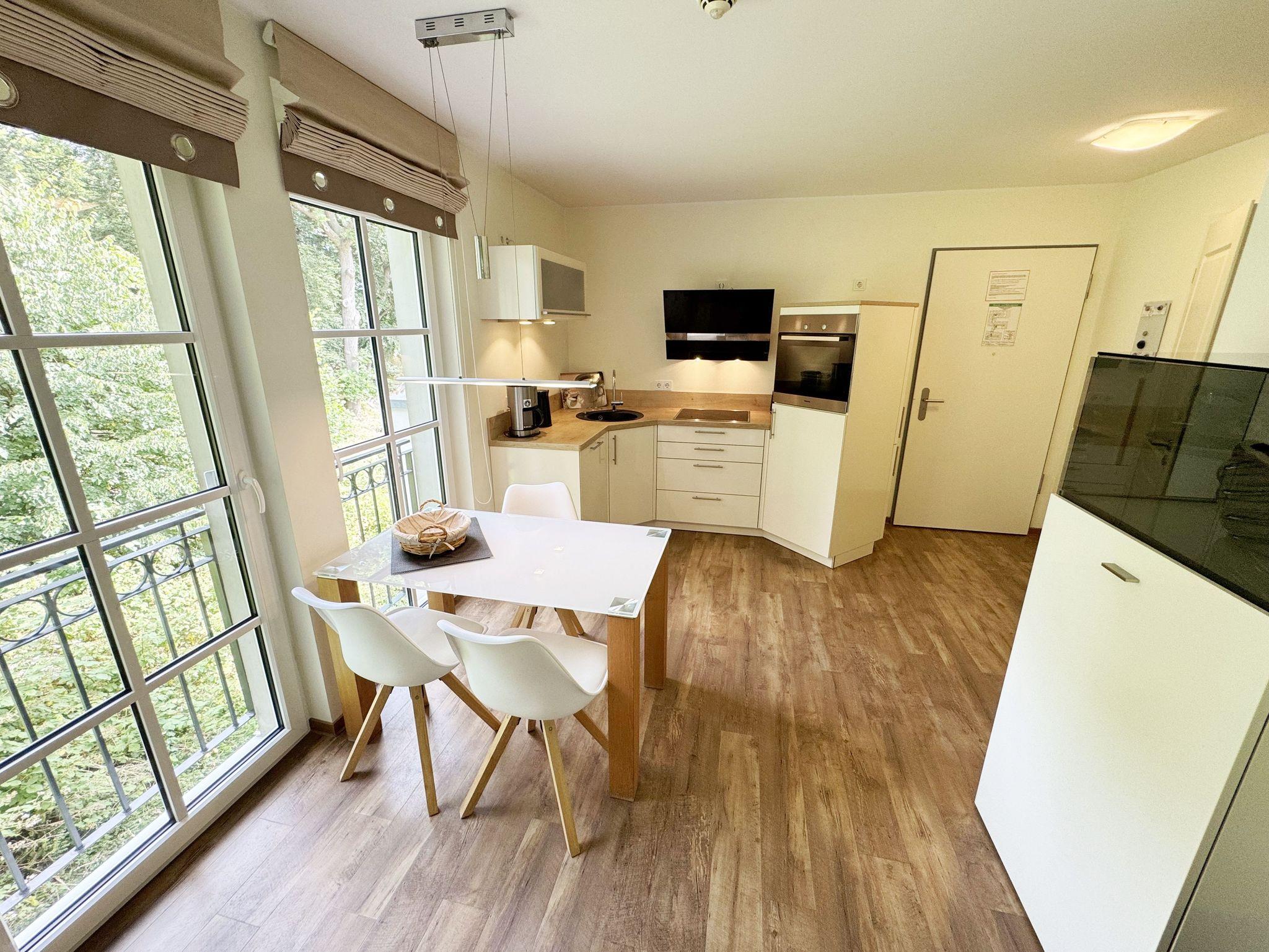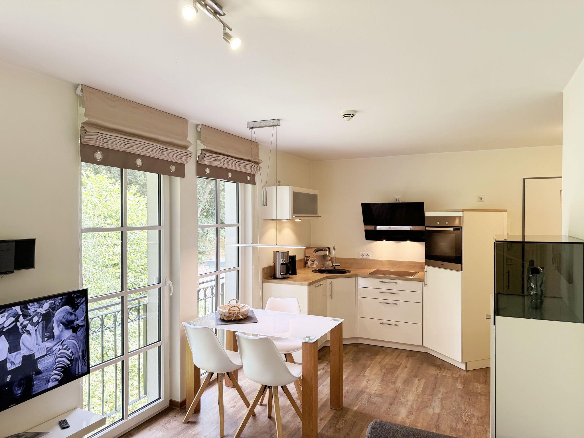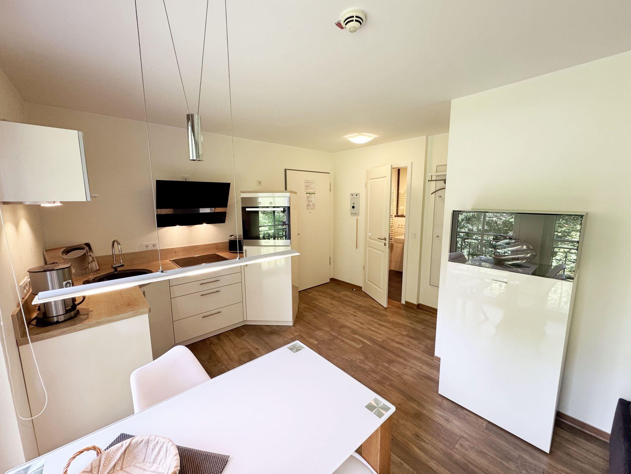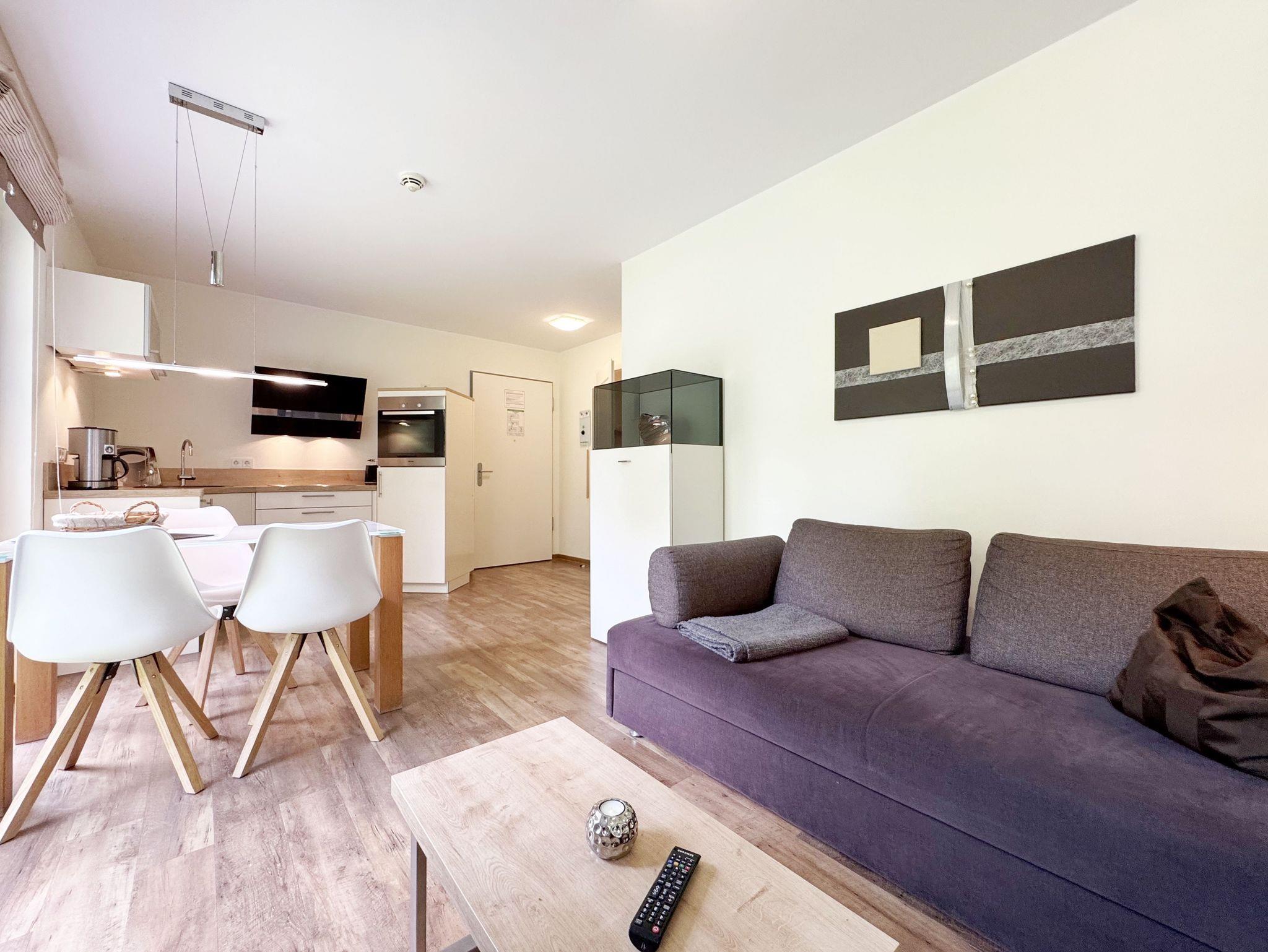 Die lichtdurchflutete 2-Zimmer-Ferienwohnung „Sernetta“ bietet auf ca. 39 m² ein behagliches Zuhause für bis zu 3 Personen ? ideal für Paare oder kleine Familien. Die Nichtraucherwohnung befindet sich im 3. Obergeschoss des gepflegten Apartmenthauses Meeresblick und ist bequem mit dem Fahrstuhl erreichbar. Die moderne Eckwohnung überzeugt mit einer durchdachten Raumaufteilung und passender Ausstattung. Der gemütliche Wohnbereich mit einer Schlafcouch (Aufbettungsmöglichkeit für 3. Person, 1,80m x 2,00m), einem Couchtisch, einer Stehlampe, einer Vitrine, einem LED-TV, einer Radio/CD-Anlage und WLAN lädt zum Entspannen ein. Zum angrenzenden offenen Wohn-/Essbereich befindet sich eine hochwertige Einbauküche mit einem Cerankochfeld, einem Backofen, einem Geschirrspüler, einem Kühlschrank mit Gefrierfach, einer Kaffeemaschine, einem Wasserkocher, einem Toaster, einem Eierkocher sowie viele Küchenhelfer. Abgerundet werden beide Bereiche durch einen Essplatz am Fenster mit Blick ins Grüne. Der zur Südseite ausgerichtete und bestuhlte Einzelbalkon mit Marmortisch ist direkt vom Wohnbereich zugänglich und bietet ruhige sonnige Ausblicke. Das separate Schlafzimmer verfügt über ein komfortables Doppelbett (1,80m x 2,00m), Nachttischablagen mit Beleuchtung, einen Ganzkörperspiegel, einen großen Kleiderschrank mit integrierten Schubladen sowie einen zweiten LED-TV. Verdunkelnde Vorhänge sorgen für erholsame Nächte. Im innenliegenden Badezimmer erwartet Sie eine ebenerdige Dusche, ein großzügiger Waschplatz mit Spiegel, ein WC, einen Fön sowie praktische Ablagemöglichkeiten. In allen Räumen wurde ein ausgewählter Vinylboden verlegt, der ein hygienisches und angenehmes Wohngefühl vermittelt. Ein Haustier ist gegen einen Aufpreis und eigenen Schlafplatz ein gern gesehener Gast. Ein eigener PKW-Stellplatz (Nr.61, Einfahrtshöhe 2,00m) befindet sich in der Tiefgarage des Hauses, welcher sich direkt am Eingang der Tiefgarage befindet. Im Keller des Hauses haben Sie die Möglichkeit eine Waschmaschine/Trockner gegen Gebühr zu nutzen. Mit dem Fahrstuhl des Hauses A gelangen sie in das Untergeschoss der Meeresblickanlage, wo Sie ein großzügiger und heller Wellnessbereich erwartet. Hier können sie in einem Pool kleine Bahnen schwimmen, in 2 Saunen Ihren Kreislauf in Schwung bringen, in einem dazugehörigen Ruheraum Ihren Körper wieder beruhigen, in einer Schneckendusche sowie weiteren Duschen das kühle Nass genießen und auf einer Außenterrasse mit Außendusche die frische Luft einatmen. Die Erstausstattung eines Wäschepaketes (komplette Bettwäsche, 1 Duschhandtuch, 2 kleine Handtücher) können Sie bis 14 Tage vor Anreise gegen einen Aufpreis dazu buchen oder durch eigenes Ergänzen. Ab 2 gebuchten Paketen erhalten Sie einmalig 1 Geschirrhandtuch und 1 Duschvorleger hinzu.