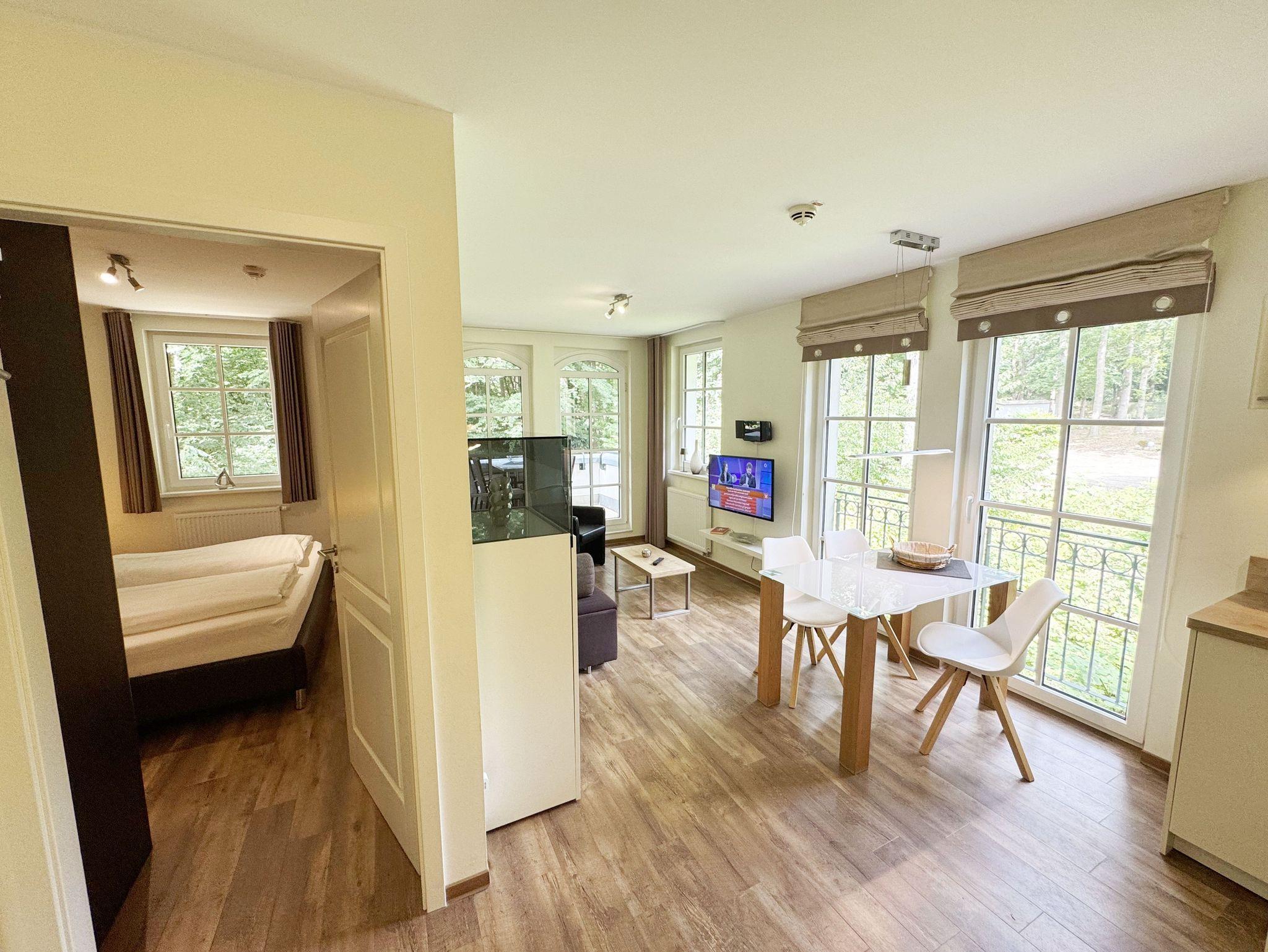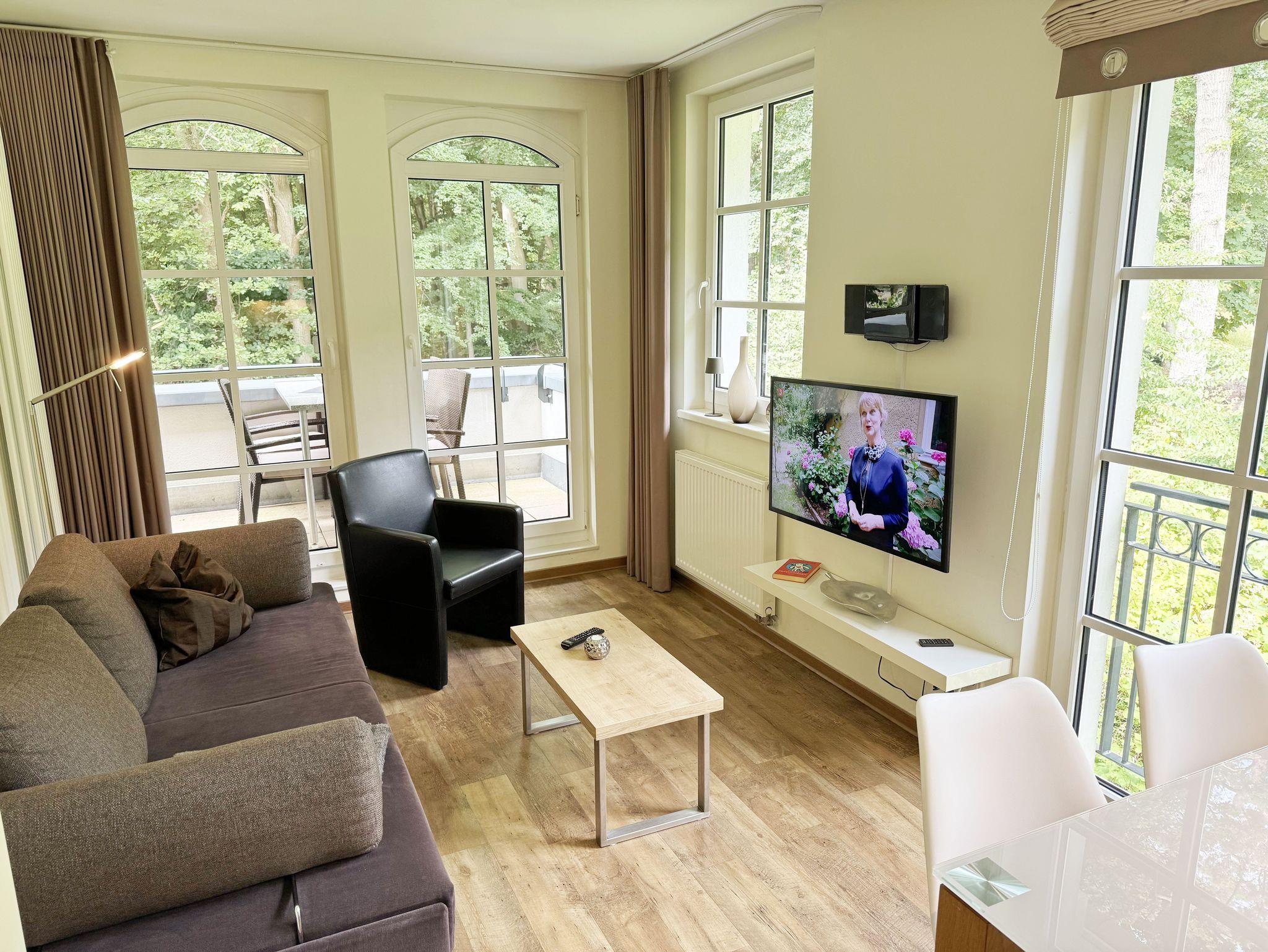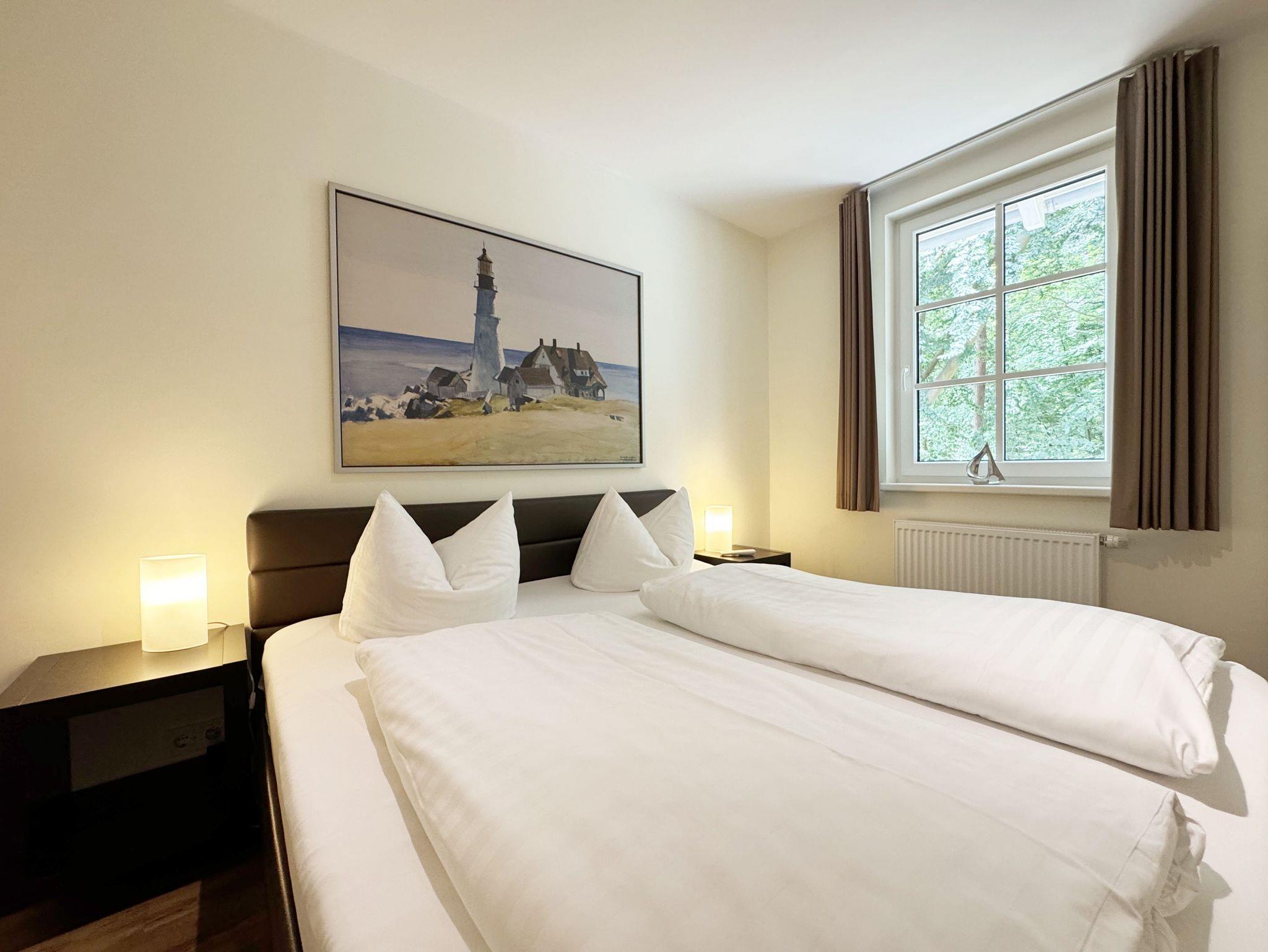 Die lichtdurchflutete 2-Zimmer-Ferienwohnung „Sernetta“ bietet auf ca. 39 m² ein behagliches Zuhause für bis zu 3 Personen ? ideal für Paare oder kleine Familien. Die Nichtraucherwohnung befindet sich im 3. Obergeschoss des gepflegten Apartmenthauses Meeresblick und ist bequem mit dem Fahrstuhl erreichbar. Die moderne Eckwohnung überzeugt mit einer durchdachten Raumaufteilung und passender Ausstattung. Der gemütliche Wohnbereich mit einer Schlafcouch (Aufbettungsmöglichkeit für 3. Person, 1,80m x 2,00m), einem Couchtisch, einer Stehlampe, einer Vitrine, einem LED-TV, einer Radio/CD-Anlage und WLAN lädt zum Entspannen ein. Zum angrenzenden offenen Wohn-/Essbereich befindet sich eine hochwertige Einbauküche mit einem Cerankochfeld, einem Backofen, einem Geschirrspüler, einem Kühlschrank mit Gefrierfach, einer Kaffeemaschine, einem Wasserkocher, einem Toaster, einem Eierkocher sowie viele Küchenhelfer. Abgerundet werden beide Bereiche durch einen Essplatz am Fenster mit Blick ins Grüne. Der zur Südseite ausgerichtete und bestuhlte Einzelbalkon mit Marmortisch ist direkt vom Wohnbereich zugänglich und bietet ruhige sonnige Ausblicke. Das separate Schlafzimmer verfügt über ein komfortables Doppelbett (1,80m x 2,00m), Nachttischablagen mit Beleuchtung, einen Ganzkörperspiegel, einen großen Kleiderschrank mit integrierten Schubladen sowie einen zweiten LED-TV. Verdunkelnde Vorhänge sorgen für erholsame Nächte. Im innenliegenden Badezimmer erwartet Sie eine ebenerdige Dusche, ein großzügiger Waschplatz mit Spiegel, ein WC, einen Fön sowie praktische Ablagemöglichkeiten. In allen Räumen wurde ein ausgewählter Vinylboden verlegt, der ein hygienisches und angenehmes Wohngefühl vermittelt. Ein Haustier ist gegen einen Aufpreis und eigenen Schlafplatz ein gern gesehener Gast. Ein eigener PKW-Stellplatz (Nr.61, Einfahrtshöhe 2,00m) befindet sich in der Tiefgarage des Hauses, welcher sich direkt am Eingang der Tiefgarage befindet. Im Keller des Hauses haben Sie die Möglichkeit eine Waschmaschine/Trockner gegen Gebühr zu nutzen. Mit dem Fahrstuhl des Hauses A gelangen sie in das Untergeschoss der Meeresblickanlage, wo Sie ein großzügiger und heller Wellnessbereich erwartet. Hier können sie in einem Pool kleine Bahnen schwimmen, in 2 Saunen Ihren Kreislauf in Schwung bringen, in einem dazugehörigen Ruheraum Ihren Körper wieder beruhigen, in einer Schneckendusche sowie weiteren Duschen das kühle Nass genießen und auf einer Außenterrasse mit Außendusche die frische Luft einatmen. Die Erstausstattung eines Wäschepaketes (komplette Bettwäsche, 1 Duschhandtuch, 2 kleine Handtücher) können Sie bis 14 Tage vor Anreise gegen einen Aufpreis dazu buchen oder durch eigenes Ergänzen. Ab 2 gebuchten Paketen erhalten Sie einmalig 1 Geschirrhandtuch und 1 Duschvorleger hinzu.