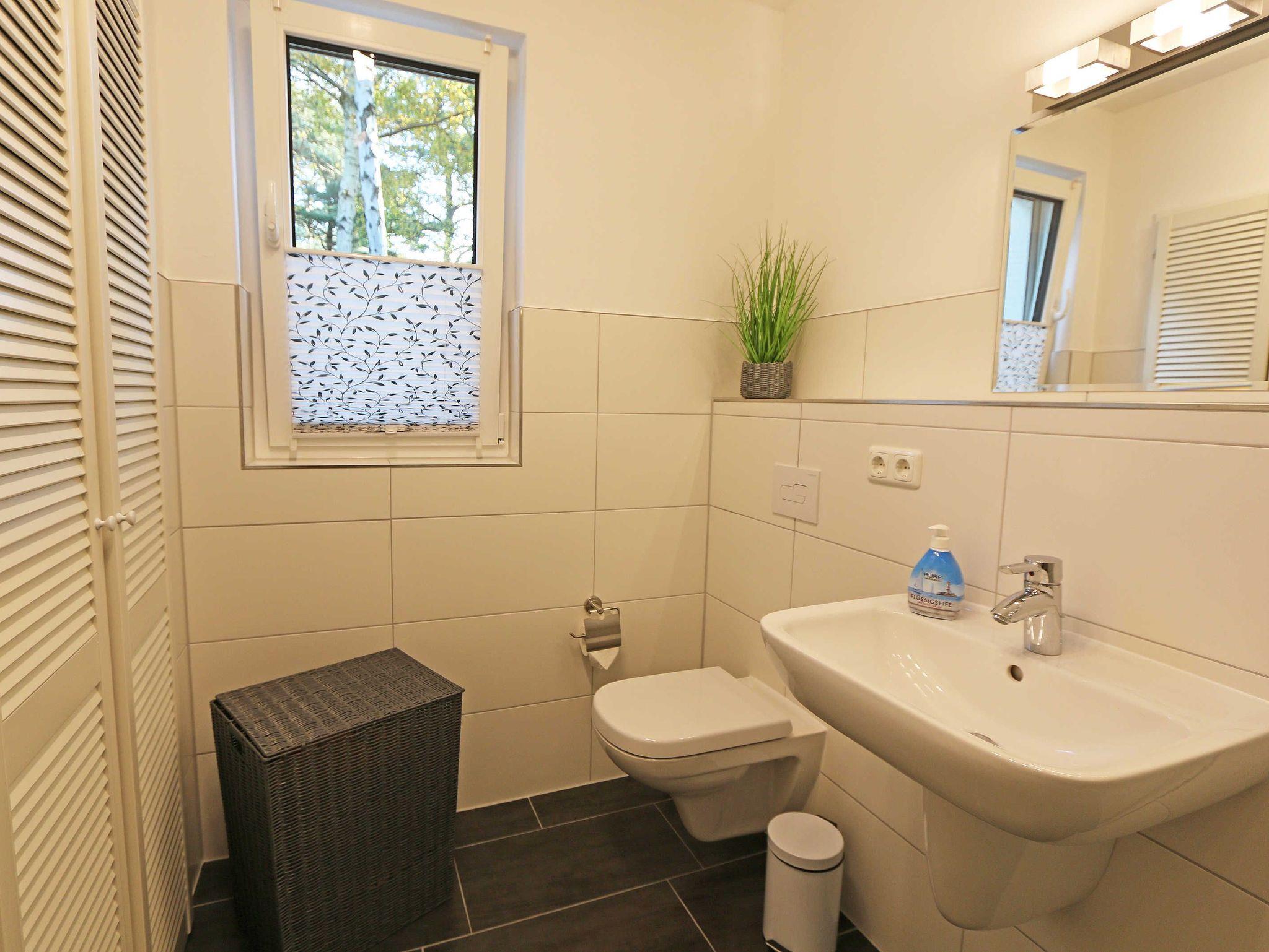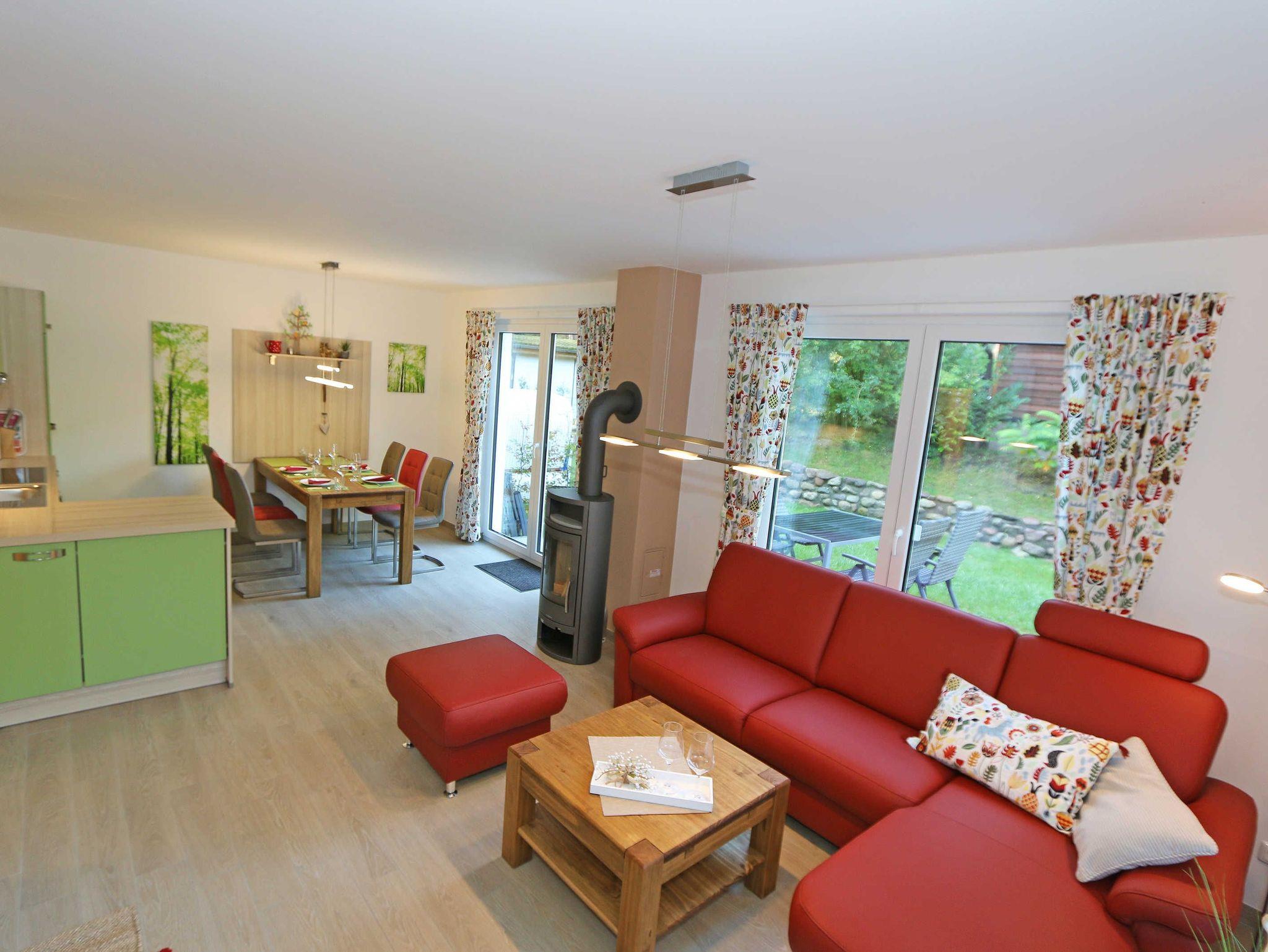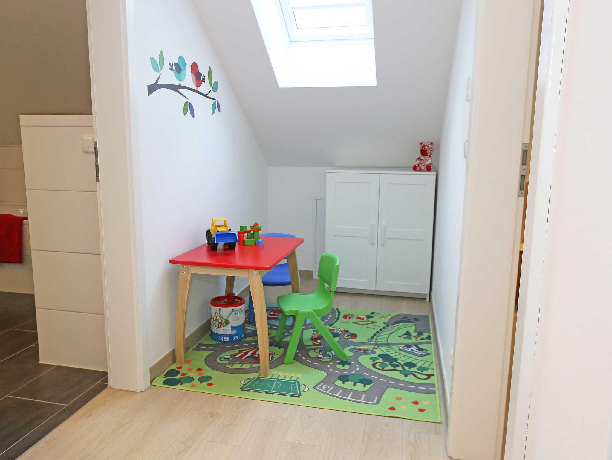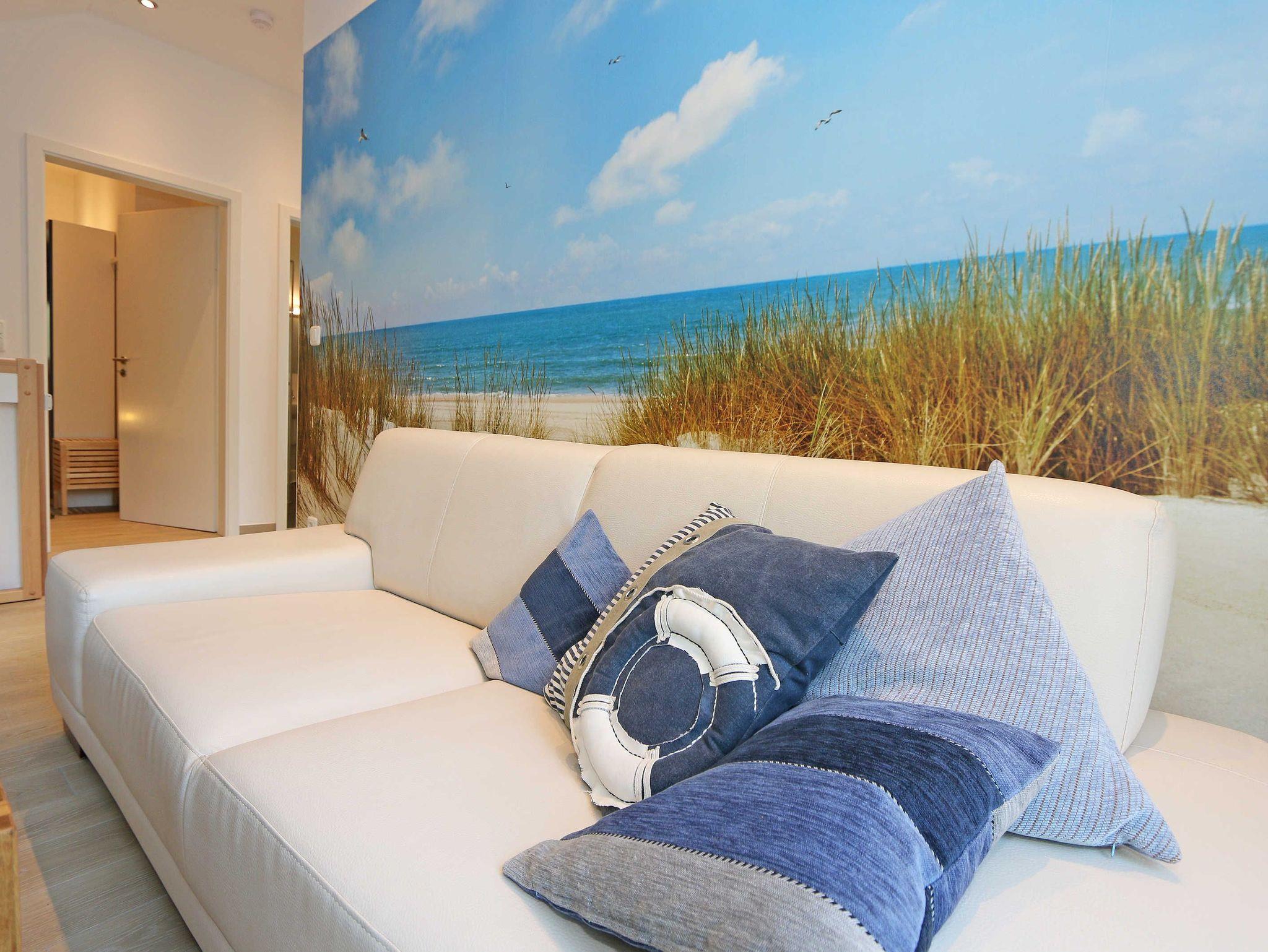 Das gemütliche ca. 95 qm große Nichtraucher Ferienhaus „Traumland“ im skandinavischen Stil mit Kamin und Sauna ist optimal geeignet für 6 Erwachsene und 1 Kleinkind bis 3 Jahre im Kinderreisebett. Durch einen kleinen Eingangsflur mit Garderobe und Schuhregalen betreten Sie Ihr Strandhaus. Im Erdgeschoss befindet sich der Wohn-/Essbereich mit gemütlicher Ledercouchecke, Barvitrine, Highboard mit Smart-TV, Blu-Ray-Player und Mini-Stereoanlage. Auch auf einen Internetzugang (WLAN) brauchen Sie nicht verzichten. Dieser ist für Sie inklusive. Wer es abends gern noch ein bisschen gemütlicher mag, der zündet den Kamin im Wohnraum an und lässt den Tag ausklingen. Dem Wohnbereich angeschlossen ist die Einbauküche, die mit allen Geräten ausgestattet ist, wie Sie es von zu Hause kennen: Geschirrspüler, Kühlschrank mit Gefrierfach, Ceranherd mit Backofen, Mikrowelle, Senseo Padmaschine, Kaffeemaschine, Wasserkocher, Toaster, Stabmixer und ambitionierte Hobbyköche finden eine große Auswahl an Küchenutensilien. Der große Esstisch bietet Platz für 6 Personen. Vom Wohnbereich gibt es einen direkten Zugang zur gen Süden gelegenen Terrasse, welche mit bequemen Terrassenmöbeln ausgestattet ist. Zum Grillen können Sie den Steingrill nutzen. Das freundlich eingerichtete Schlafzimmer im Erdgeschoss ist mit einem Doppelbett (1,60 m x 2,00 m) mit verstellbaren Lattenrosten, Nachttischkonsolen, Leseleuchten und Kleiderschrank ausgestattet. Das Bad auf gleicher Ebene verfügt über eine ebenerdige Dusche und Sauna, welches Ihr „Wellnessbereich“ zum Verwöhnen ist! Auch ein Waschplatz, WC und Fön gehören dazu. Über eine Buchenholztreppe erreichen Sie das lichtdurchflutete Obergeschoss. In der maritim gestalteten Galerie gibt es eine kuschlige Relax-Ecke, Leseleuchte und Highboard mit Smart-TV. Für Ihre Kleinen haben wir eine kleine Kinderspielecke mit Tisch und Stühlen eingerichtet. Zwei weitere Schlafzimmer mit großen Doppelbetten (1,80 m x 2,00 m) mit verstellbaren Lattenrosten, Kleiderschränken, Ablagen mit Leseleuchten sowie ein zweites großes Bad mit ebenerdiger Dusche, WC, Waschplatz, Kosmetikspiegel, Badewanne und Waschmaschine sind ebenfalls im Obergeschoss untergebracht. Das Haus verfügt in allen Räumlichkeiten über eine Fußbodenheizung. In den Schlafräumen, Bädern und der Galerie finden Sie Insektenschutzgitter. Für die kleinen Gäste halten wir 1x Hochstuhl, Bettgitter, 1x Kinderreisebett (ohne Zusatzmatratze/ Inlett) und ein Treppenschutzrollo (im Obergeschoss) bereit. Auf dem Grundstück steht unseren Gästen ein PKW-Stellplatz (Nr. 5) zur Verfügung. Ihre geliehenen oder mitgebrachten Fahrräder können Sie am Haus (einbetonierter Fahrradbügel) abstellen oder im Außenabstellraum verschließen. 1 Haustier ist mit seinem eigenen Schlafplatz gegen eine Gebühr ein gern gesehener Gast. Die Erstausstattung eines Wäschepaketes (komplette Bettwäsche, 1 Duschhandtuch, 2 kleine Handtücher) können Sie bis 14 Tage vor Anreise gegen einen Aufpreis dazu buchen oder durch eigene ergänzen. Ab 2 gebuchten Paketen erhalten Sie einmalig 1 Geschirrhandtuch und 1 Duschvorleger dazu.