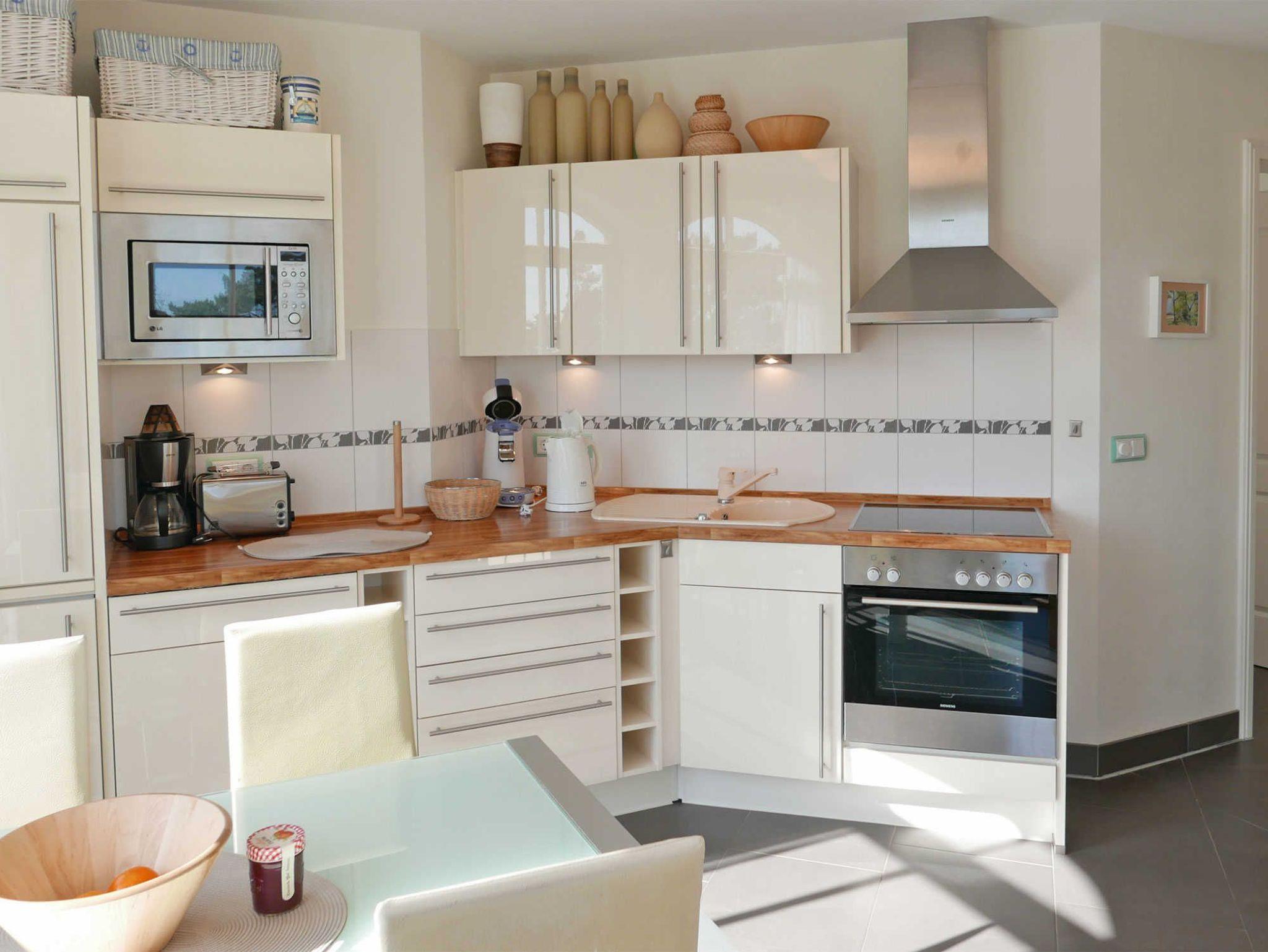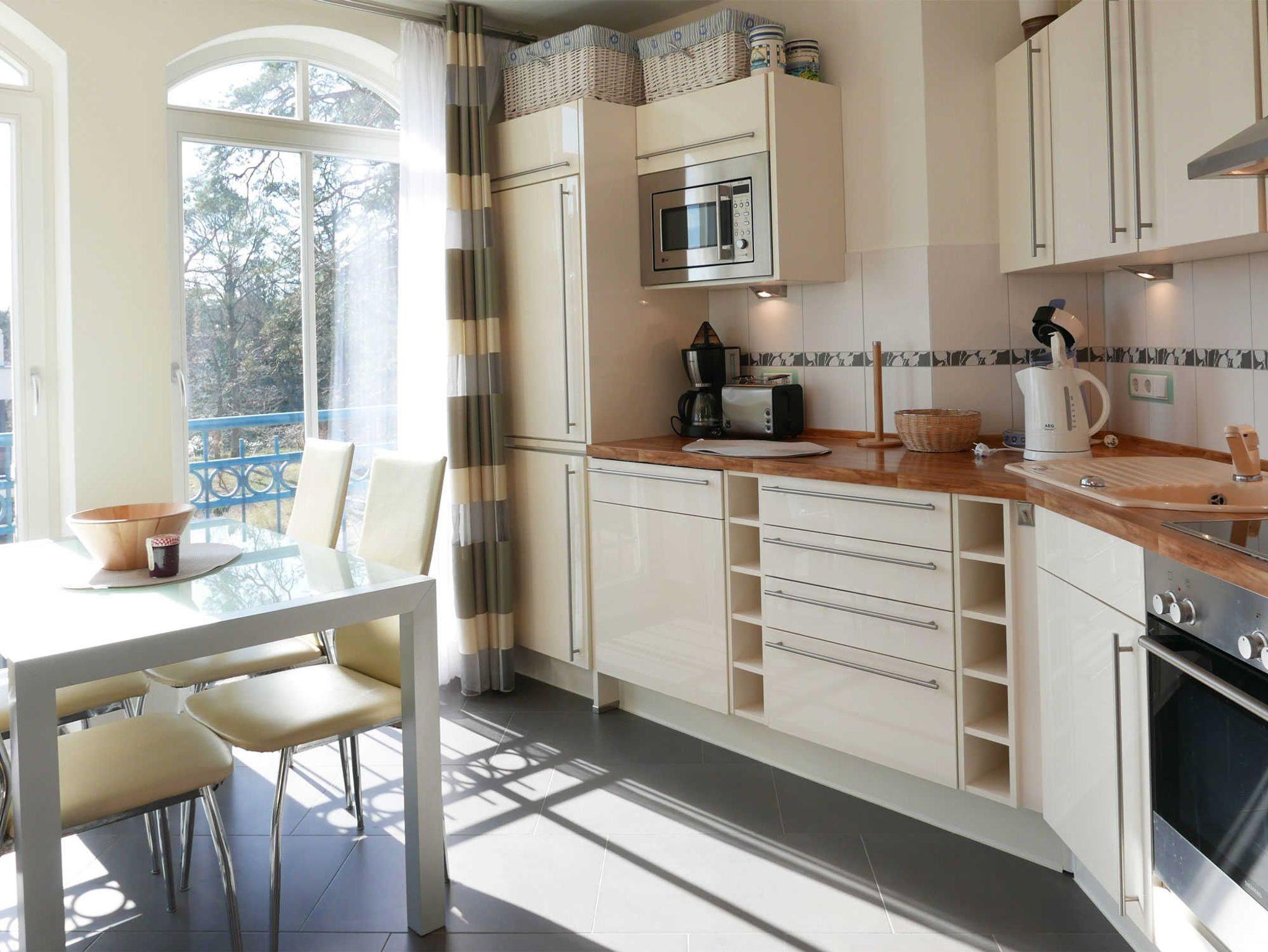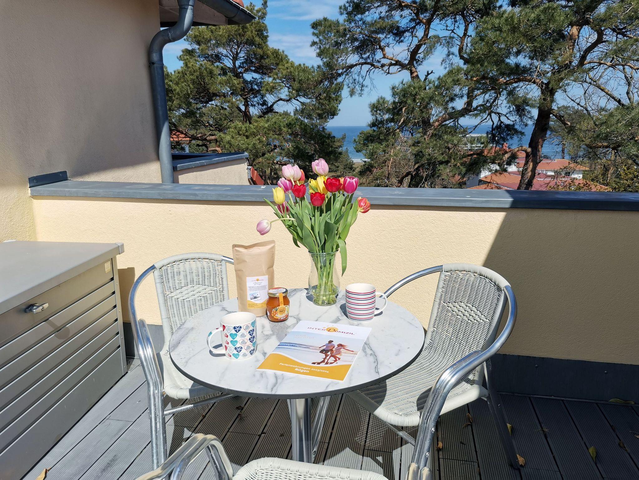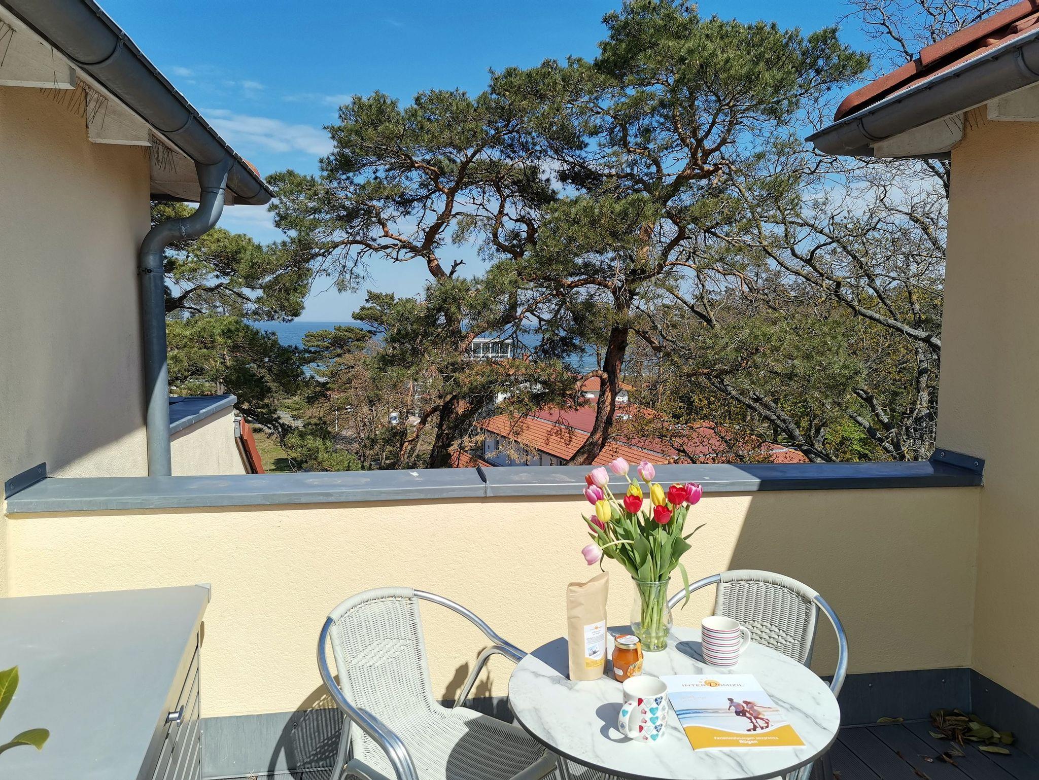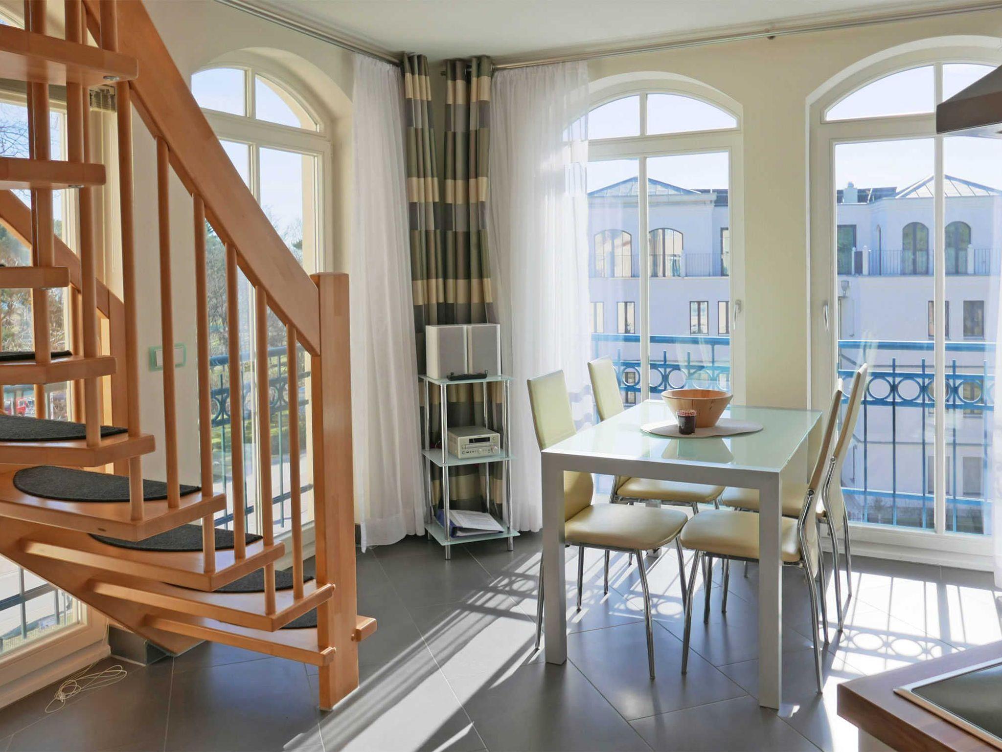 In dieser exklusiv-modernen 4-Zimmerferienwohnung für 4 Personen bleiben keine Wünsche offen. Auf 70 qm und 2 Ebenen befinden sich zwei Schlafzimmer, mit jeweils einem Doppelbett (2x0,90m x 2,00 m und 1,40m x 2,00 m), ein Wohnzimmer, ein Esszimmer mit Küche, ein Duschbad sowie ein Gäste-WC. Auf der Dachterrasse können Sie die herrliche Aussicht auf die Ostsee genießen. Ein zusätzlicher Balkon mit Meerblick ist ebenfalls vorhanden, diesen erreichen Sie über eines der Schlafzimmer. In der Küche sind selbstverständliche alle Annehmlichkeiten vorhanden inklusive 4-Zonen-Ceranfeld, Backofen, Mikrowelle, Geschirrspüler, Kühlschrank und Abzugshaube. Besonders schön ist das Wohnzimmer im Turm, von hier aus haben Sie einen grandiosen Rundumblick.