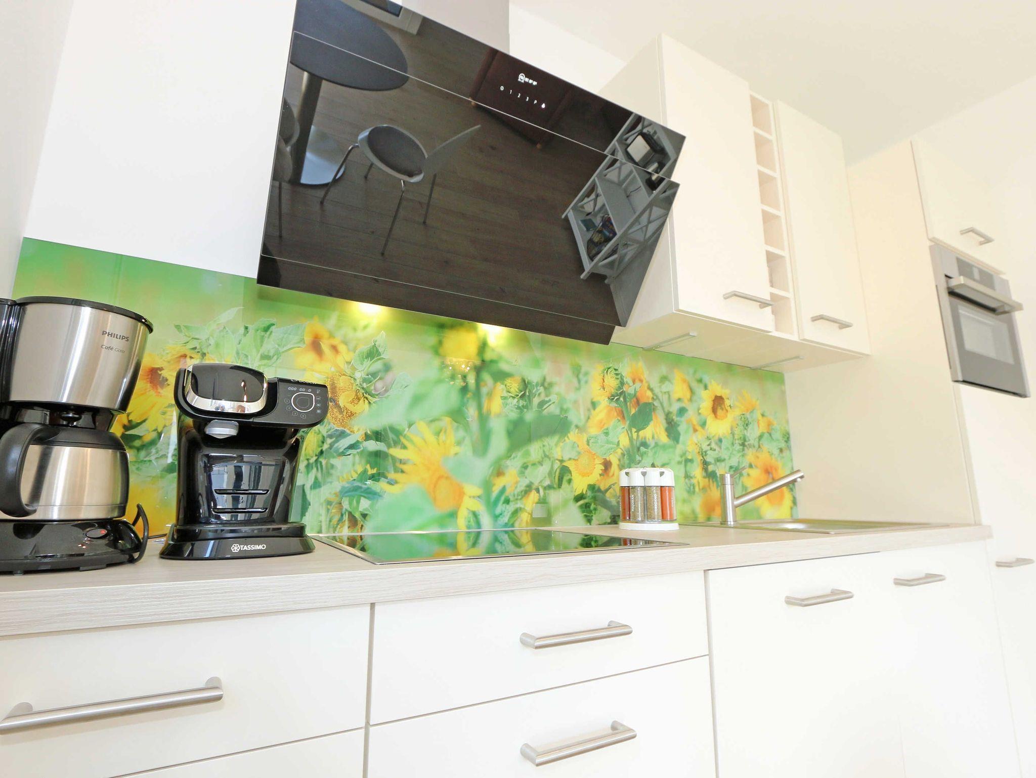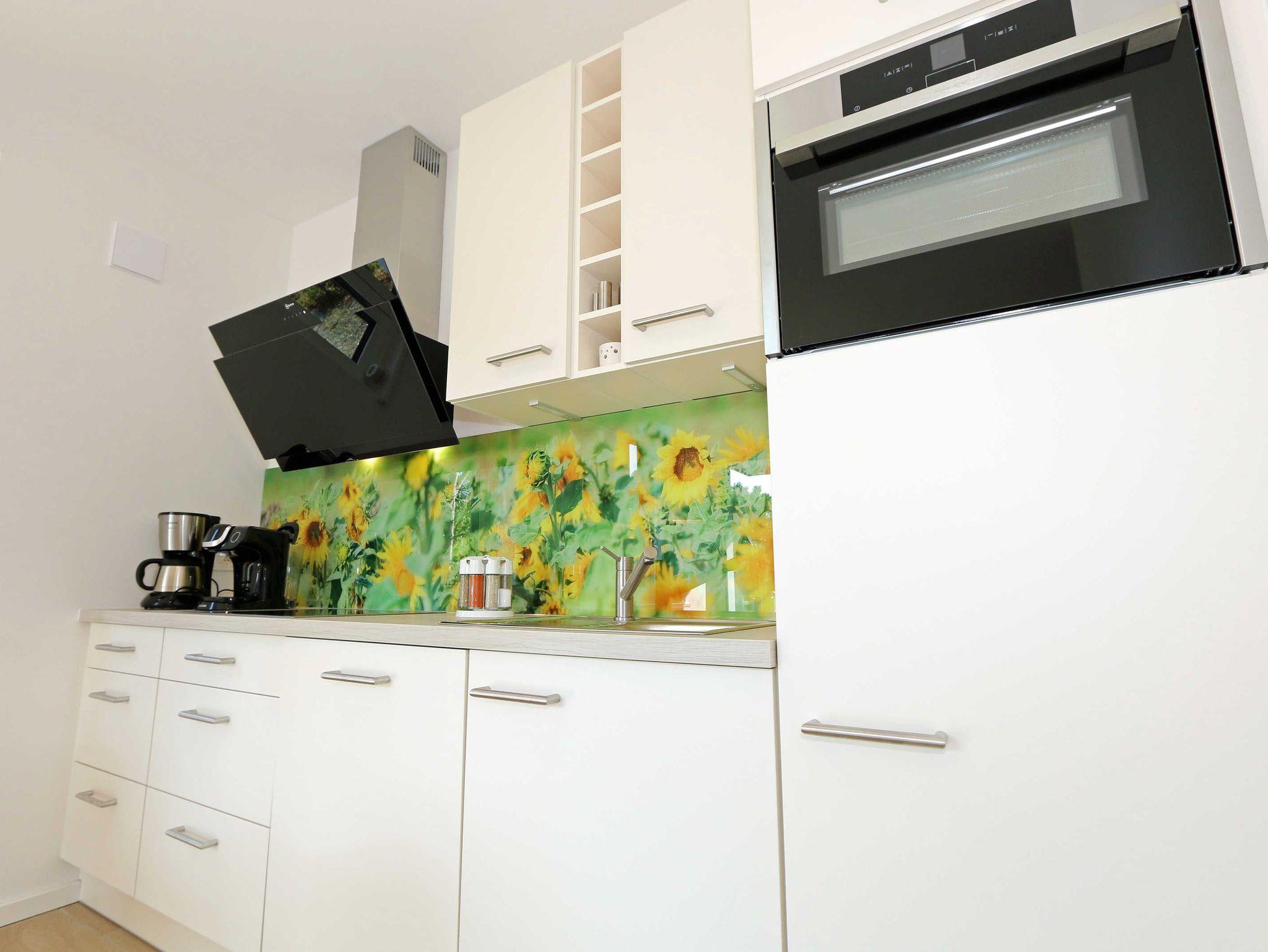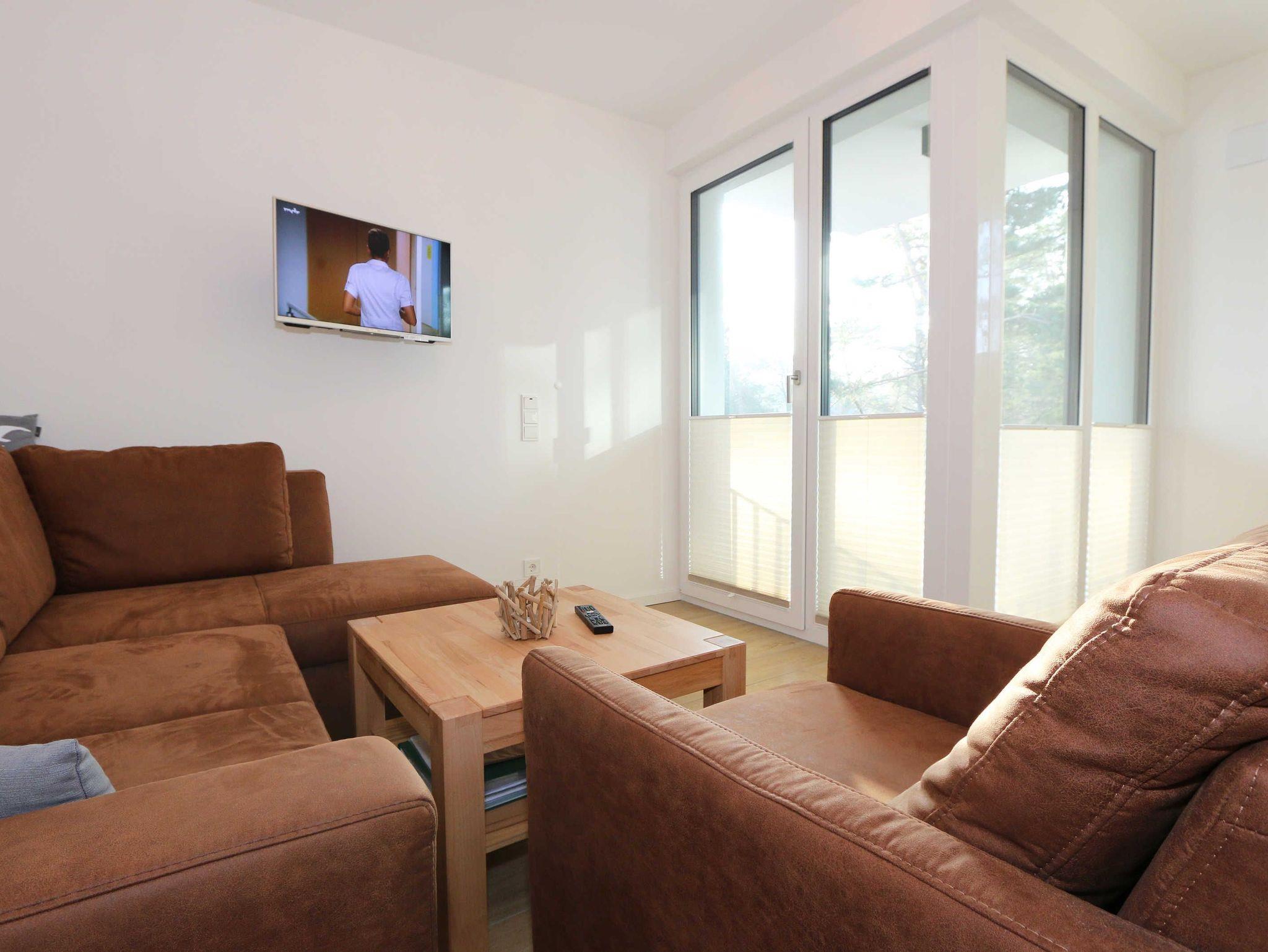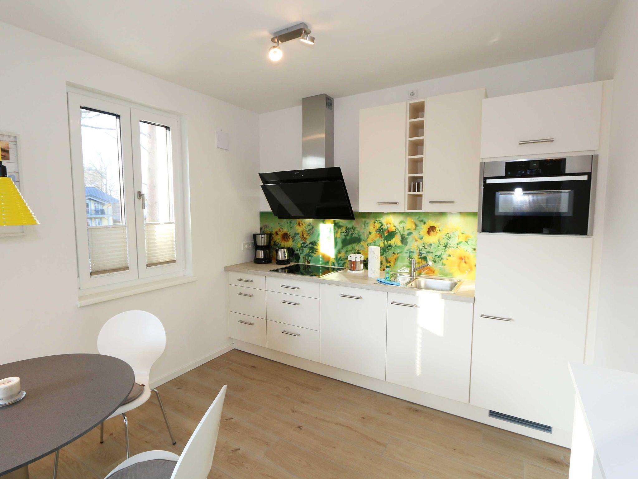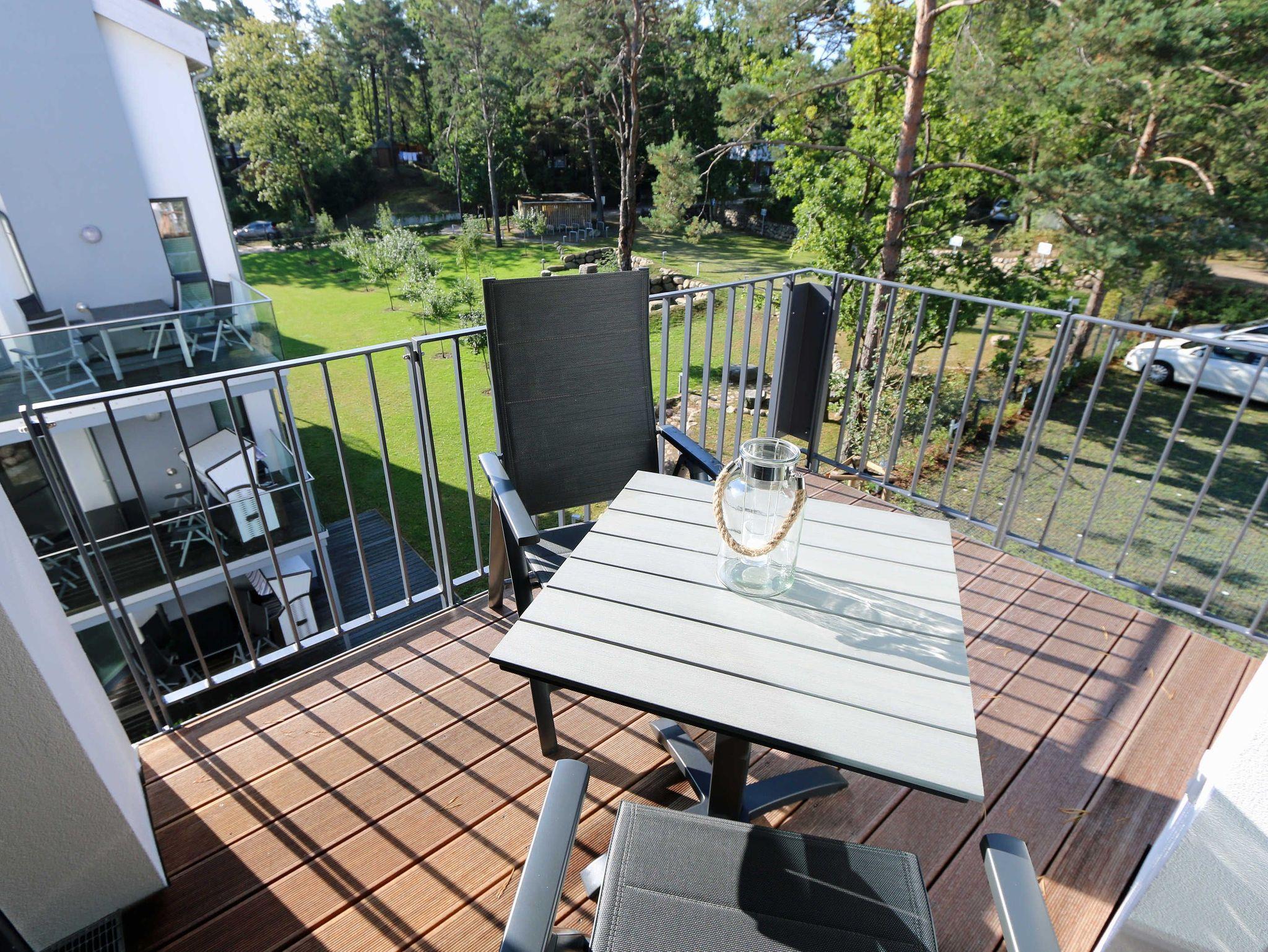Die lichtdurchflutete Zwei-Raum-Komfort-Wohnung befindet sich mit Ihren 50 m² in der 2.Etage der Villa Strandläufer und kann bequem mit dem Fahrstuhl erreicht werden. Die moderne und freundliche Nichtraucherferienwohnung „Sonnenschein“ ist für max. 2 Personen ausgelegt. Im Wohnbereich befindet sich eine gemütliche Eckcouch mit Couchtisch, einen Sessel sowie einer Vitrine. Zum technischen Bereich gehören ein Smart-TV mit integriertem Radio, USB-Anschluss und Bluetooth sowie ein WLAN-Verbindung. Auch eine kleine Auswahl an Gesellschaftsspielen und an Literatur steht für Sie bereit. Der Küchenbereich schließt sich hier mit der modern und zweckmäßig ausgestatteten Küchenzeile an. Zur hochwertigen Ausstattung gehören ein Geschirrspüler, autarkes Elektro-Kochfeld mit 4 Zonenceranfeld, Spüle, Kühlschrank mit Eisfach, Kompaktbackofen mit Mikrowelle, Einbaukühlschrank, Dunstabzugshaube, Wasserkocher, Toaster, Kaffeemaschine mit Thermoskanne, Pad-Kaffeemaschine (Tassimo) sowie ein Essplatz mit Radio. Vom Wohn- und Essbereich haben Sie einen entspannten Ausblick auf die Kiefernbestände wo Sie auf dem bestuhlten Balkon (ideal mit Süd/West Ausrichtung) die Sonne wunderbar genießen bzw. den Tag gemütlich beim Sonnenuntergang ausklingen lassen können. Das gemütliche Schlafzimmer verfügt über ein Doppelbett (1,80m x 2,00m), verstellbare Lattenroste, Nachttischablagen, Smart-TV mit integriertem Radio, USB-Anschluss, Bluetooth und Kleiderschrank mit Spiegelfront. Für einen ruhigen und entspannten Schlaf sorgen entsprechende Verdunklungsplissee´s sowie Insektenschutzgitter, die auch im Wohn- und Essbereich vorhanden sind. Das Bad wird durch eine ebenerdige Regendusche, Waschtisch, WC, Spiegel, Fön und einem Handtuchtrockner abgerundet. Zusätzlich verfügt die Wohnung über ein separates Gäste-WC und einen kleinen Abstellraum im Eingangsbereich mit diversen Reinigungsutensilien, ein Bügelbrett und ein Bügeleisen. Zu dem Villen-Ensembles gehören ein Wellnessbereich mit einer Gemeinschaftssauna, ein Waschraum mit Waschmaschinen und Trocknern, die gegen Gebühr bei Bedarf gern von Ihnen genutzt werden können. Haustiere sind nicht erlaubt. Ein Stellplatz (Nr.06/Sonnenschein) in der Tiefgarage (Einfahrtshöhe 2,00m) ist für Sie inklusive. Die Erstausstattung eines Wäschepaketes (komplette Bettwäsche, 1 Duschhandtuch, 2 kleine Handtücher) können Sie bis 14 Tage vor Anreise gegen einen Aufpreis dazu buchen oder durch eigene ergänzen. Ab 2 gebuchten Paketen erhalten Sie einmalig 1 Geschirrhandtuch und 1 Duschvorleger hinzu. Wir würden uns freuen, Sie in der Ferienwohnung „Sonnenschein“ in der Villa Standläufer begrüßen zu dürfen.