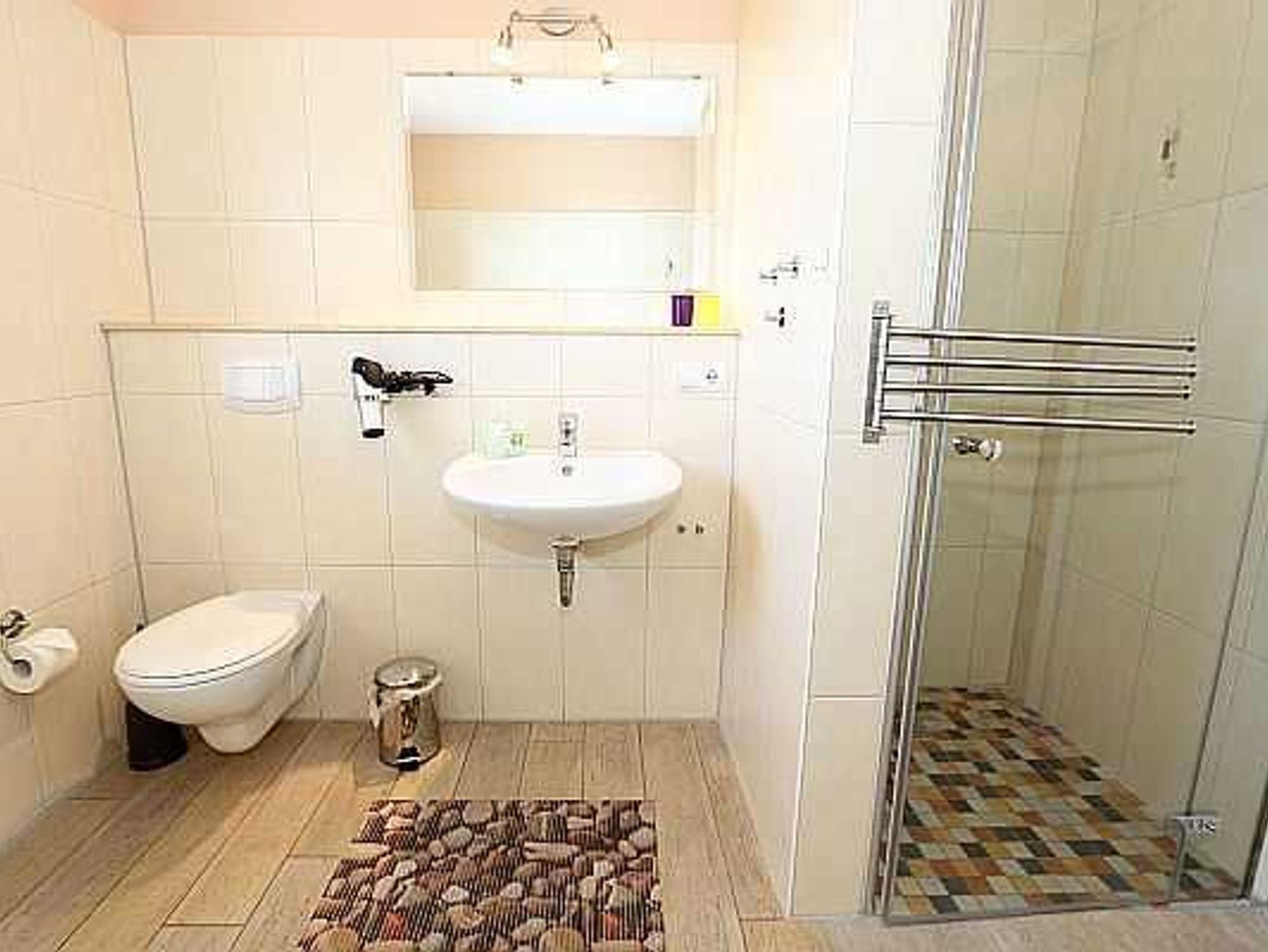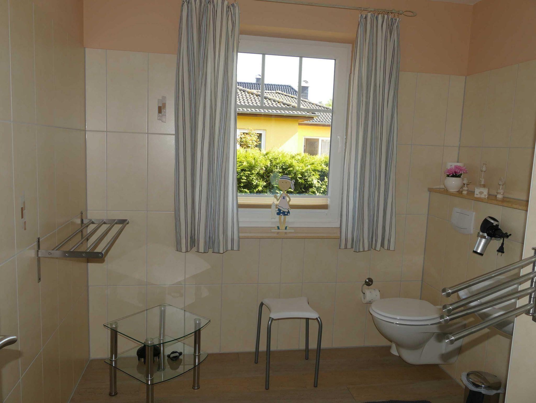 Die bodenebene und barrierefreie Dusche und der Fön bilden den Charakter des Bades. Die Erstausstattung eines Wäschepaketes (komplette Bettwäsche, 1 Duschhandtuch, 2 kleine Handtücher, einmalig eine Geschirrhandtuch und ein Duschvorleger) können Sie gegen eine Gebühr dazu buchen.