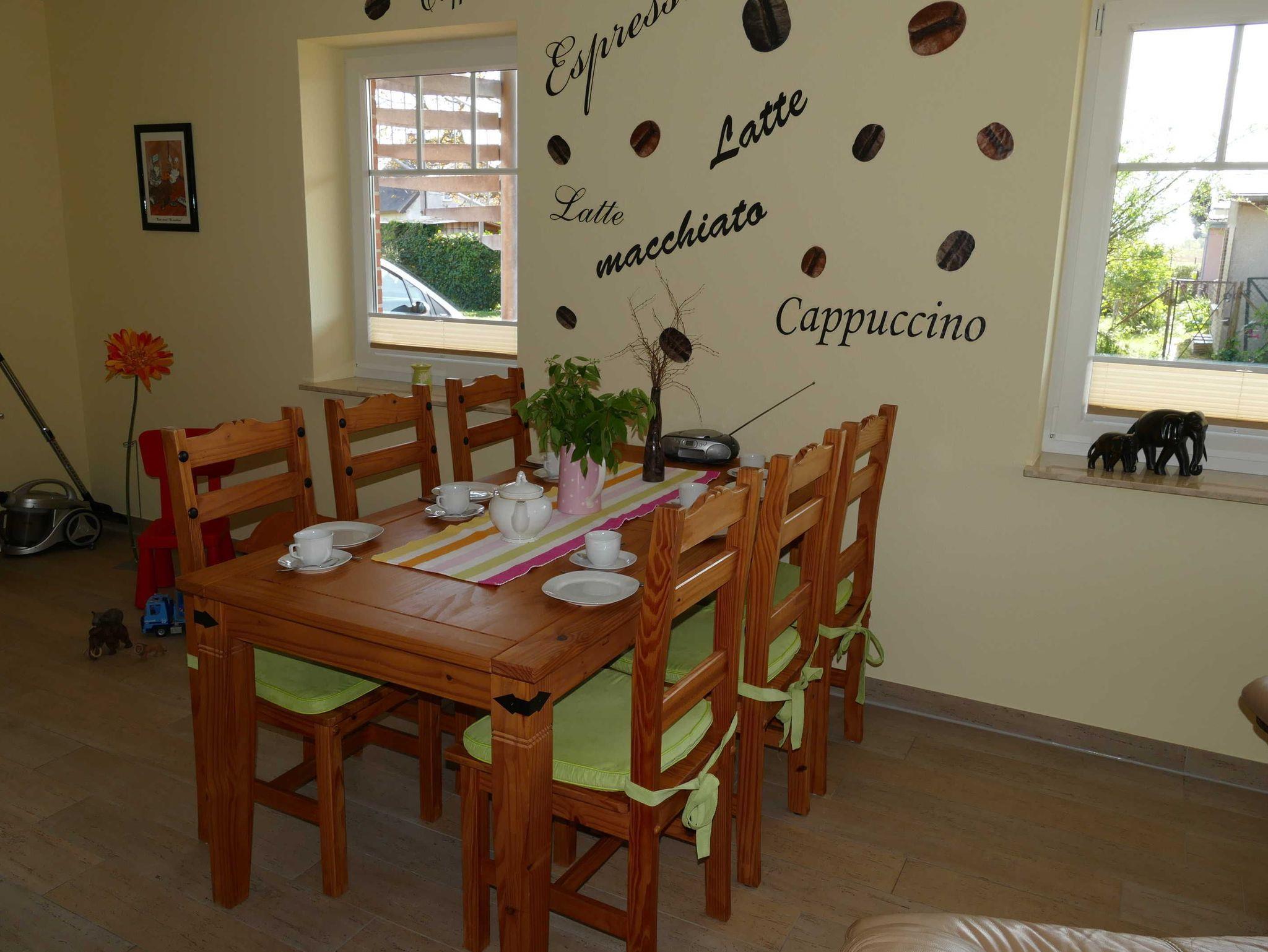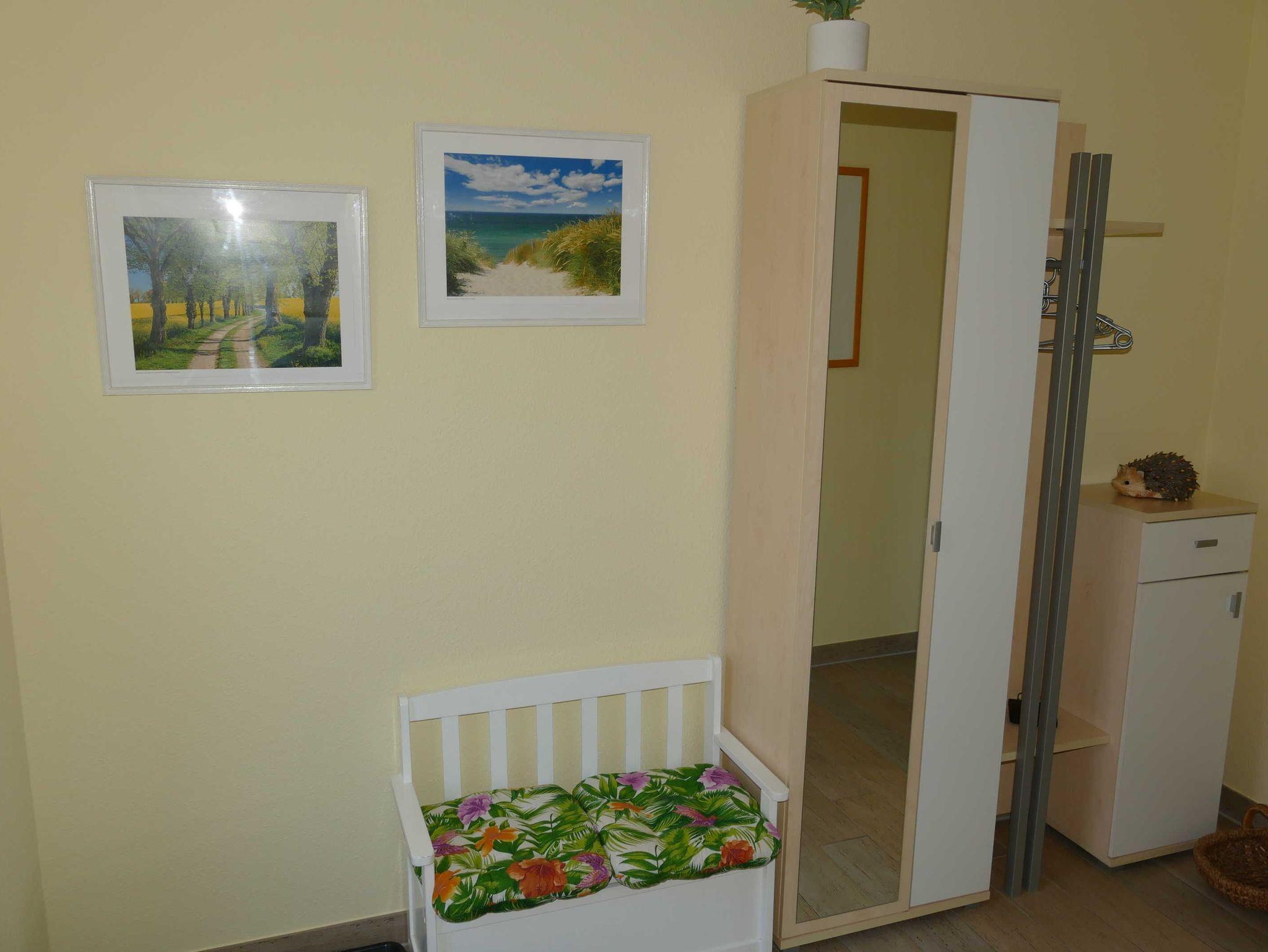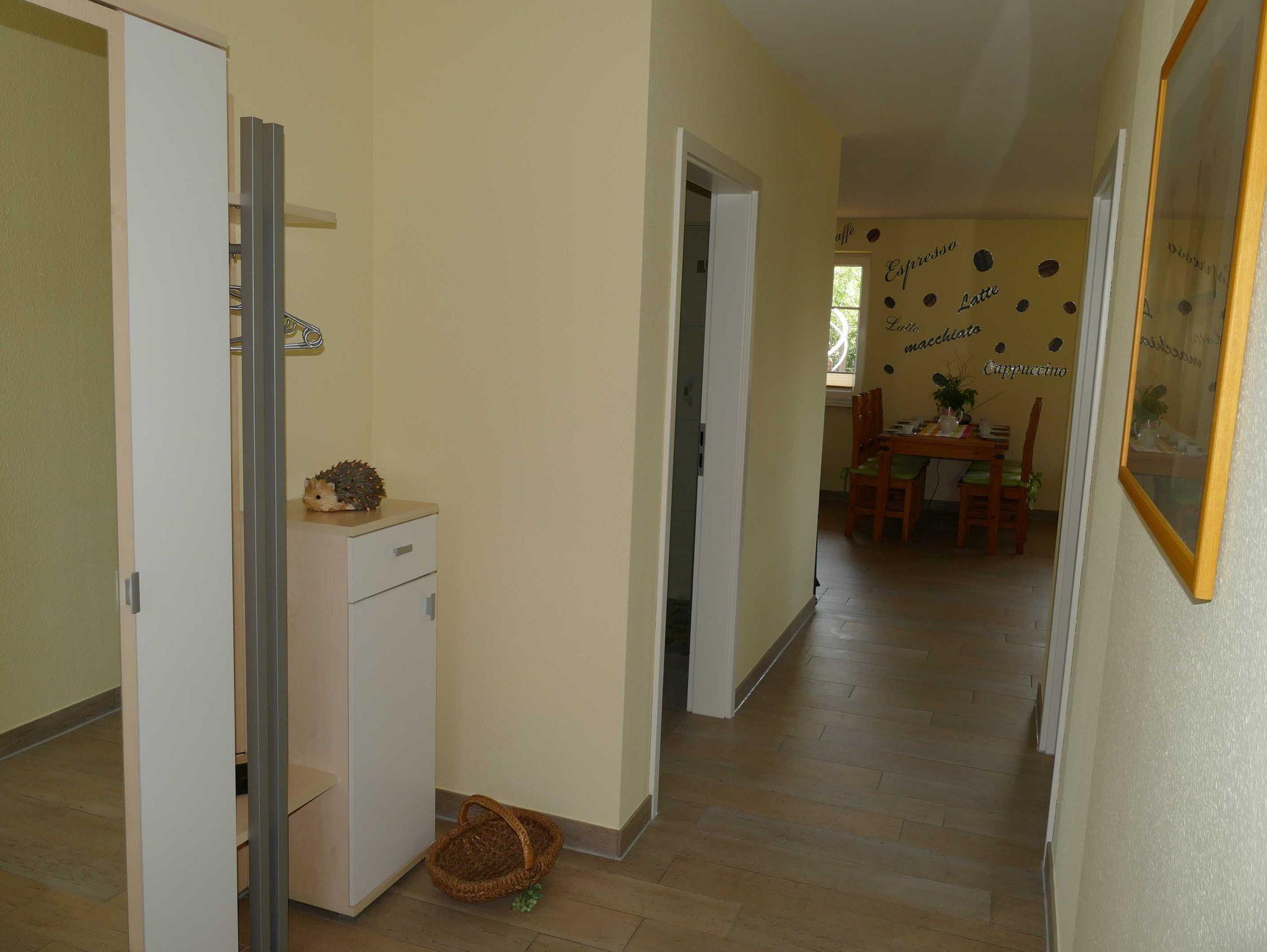 Empfangen werden Sie im geräumigen hellen Flur, der für Sie eine Garderobe sowie eine kleines Bänkchen, die Ihnen als Sitzgelegenheit dienen kann, bereit hält. Von dort gelangen Sie in die Schlafräume, in den Wohn- und Essbereich sowie in das Bad. Der Wohn- und Essbereich der Ferienwohnung zeigt sich, mit einem Kamin (Holz inklusive/kostenlos), einer gemütlichen Sitzgruppe sowie einem Esstisch für 6 Personen und lädt zum Verweilen ein. Der Fernseher mit DVD-Player, Radio, W-LAN (kostenlos) sowie Bücher und Spiele sorgen für exklusiven Wohnkomfort und gemütliche Abende.