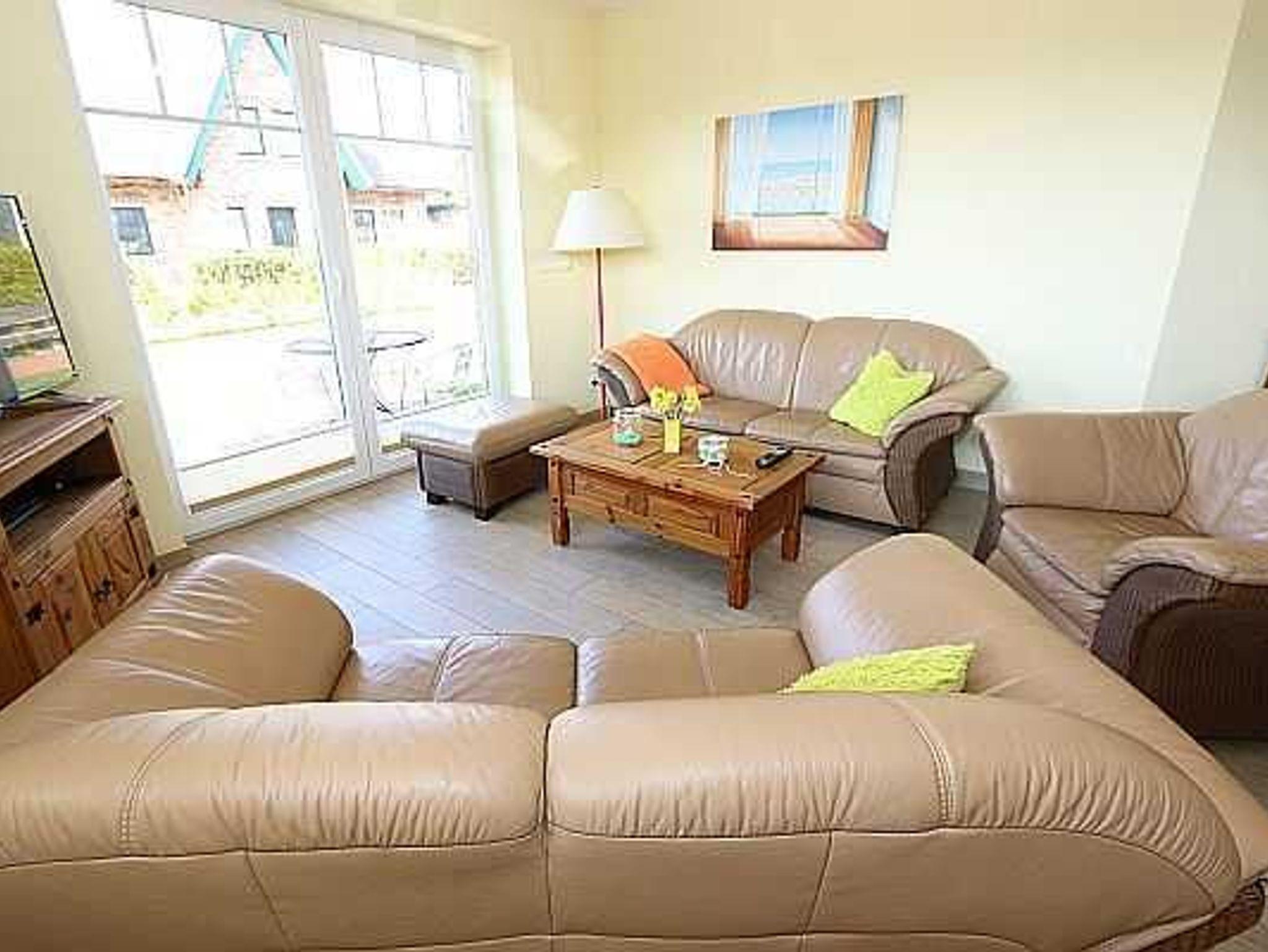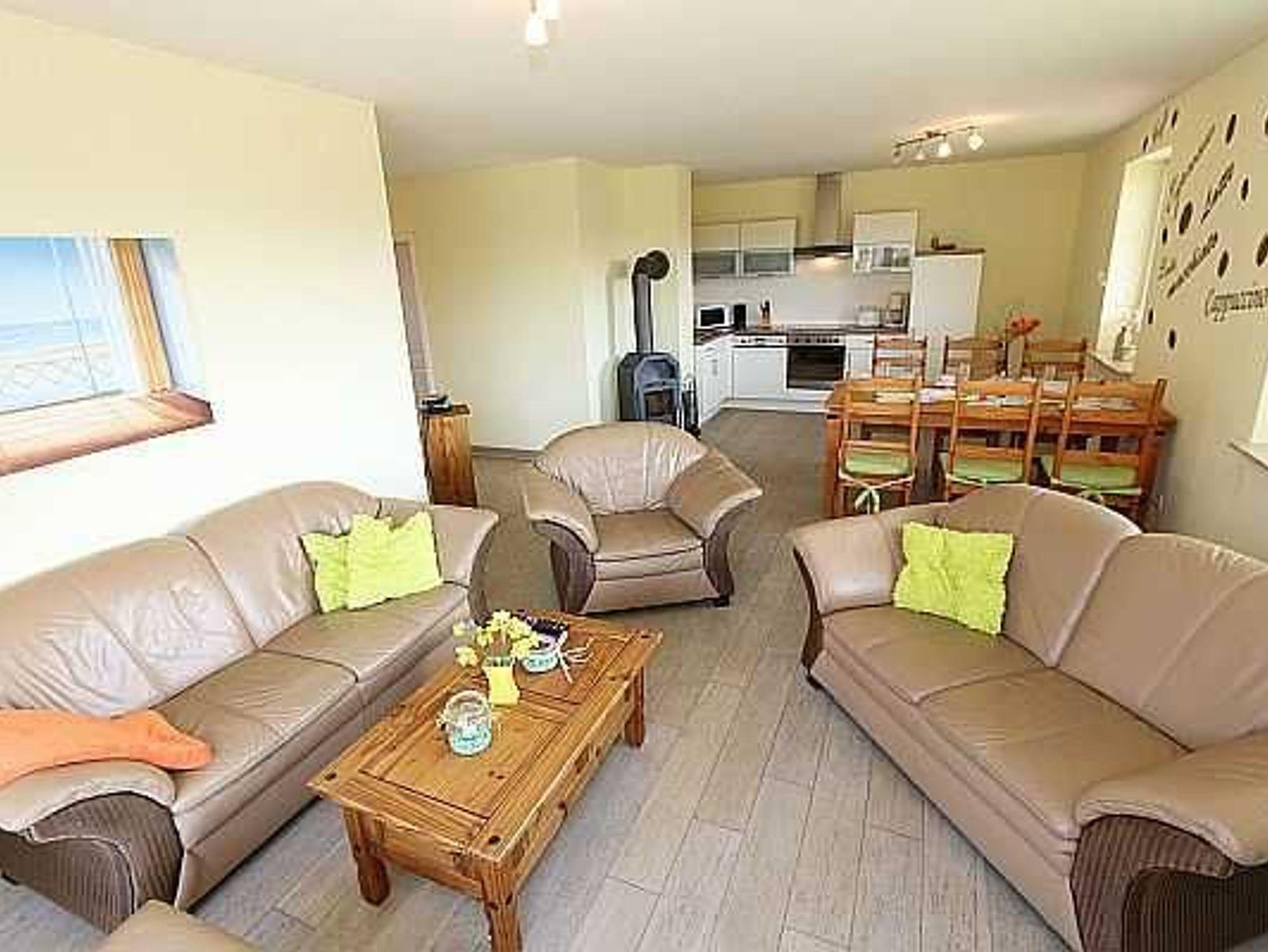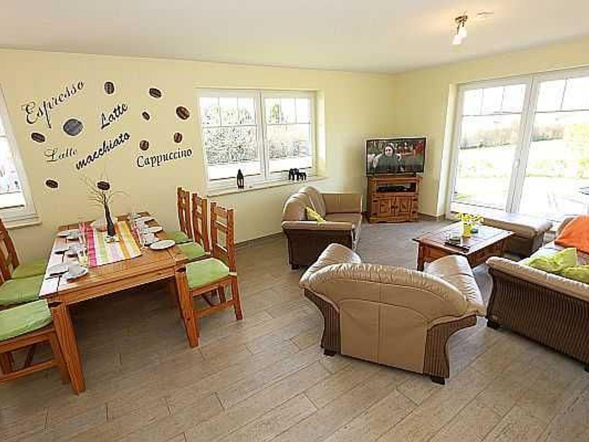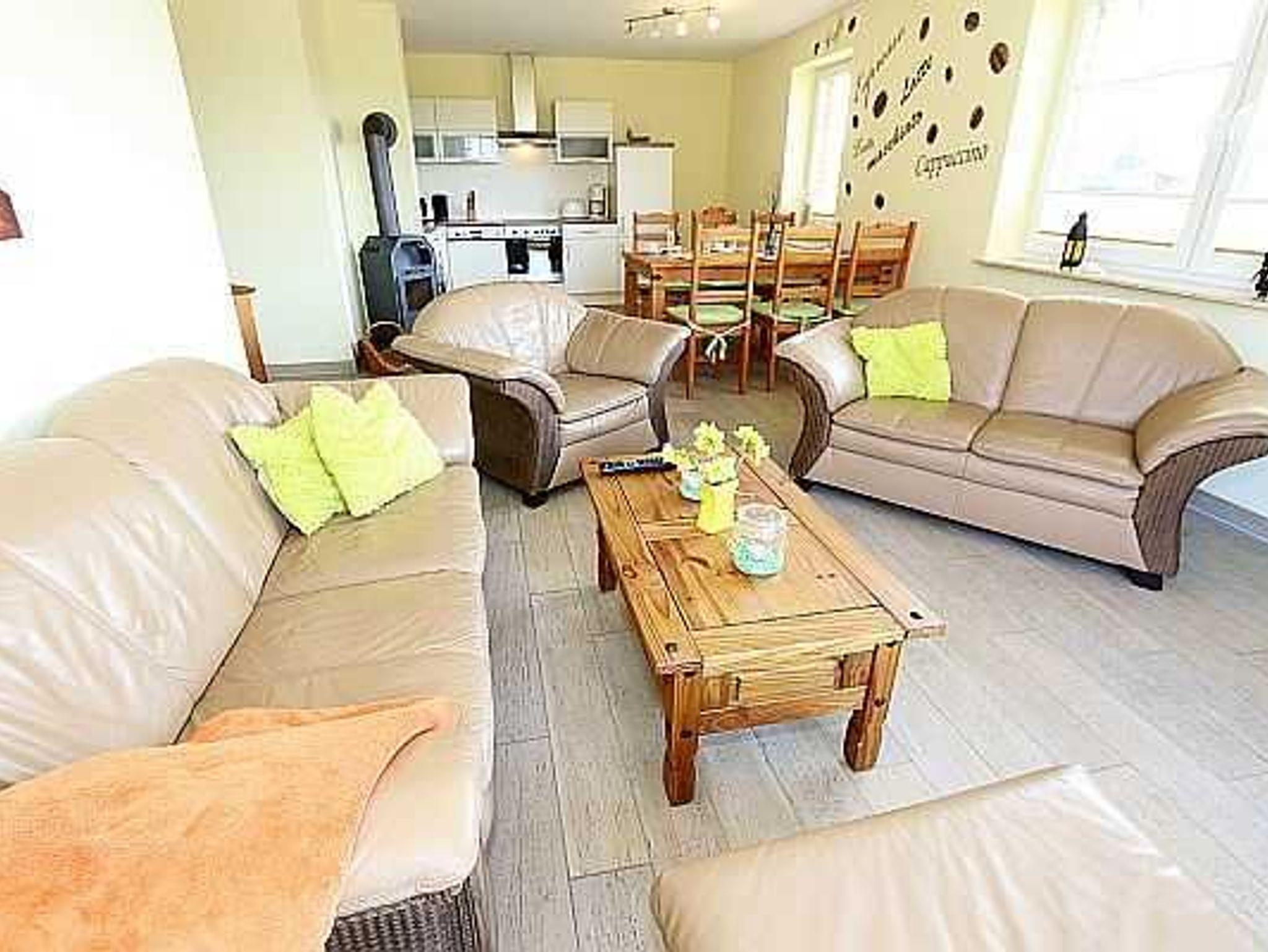 Empfangen werden Sie im geräumigen hellen Flur, der für Sie eine Garderobe sowie eine kleines Bänkchen, die Ihnen als Sitzgelegenheit dienen kann, bereit hält. Von dort gelangen Sie in die Schlafräume, in den Wohn- und Essbereich sowie in das Bad. Der Wohn- und Essbereich der Ferienwohnung zeigt sich, mit einem Kamin (Holz inklusive/kostenlos), einer gemütlichen Sitzgruppe sowie einem Esstisch für 6 Personen und lädt zum Verweilen ein. Der Fernseher mit DVD-Player, Radio, W-LAN (kostenlos) sowie Bücher und Spiele sorgen für exklusiven Wohnkomfort und gemütliche Abende.