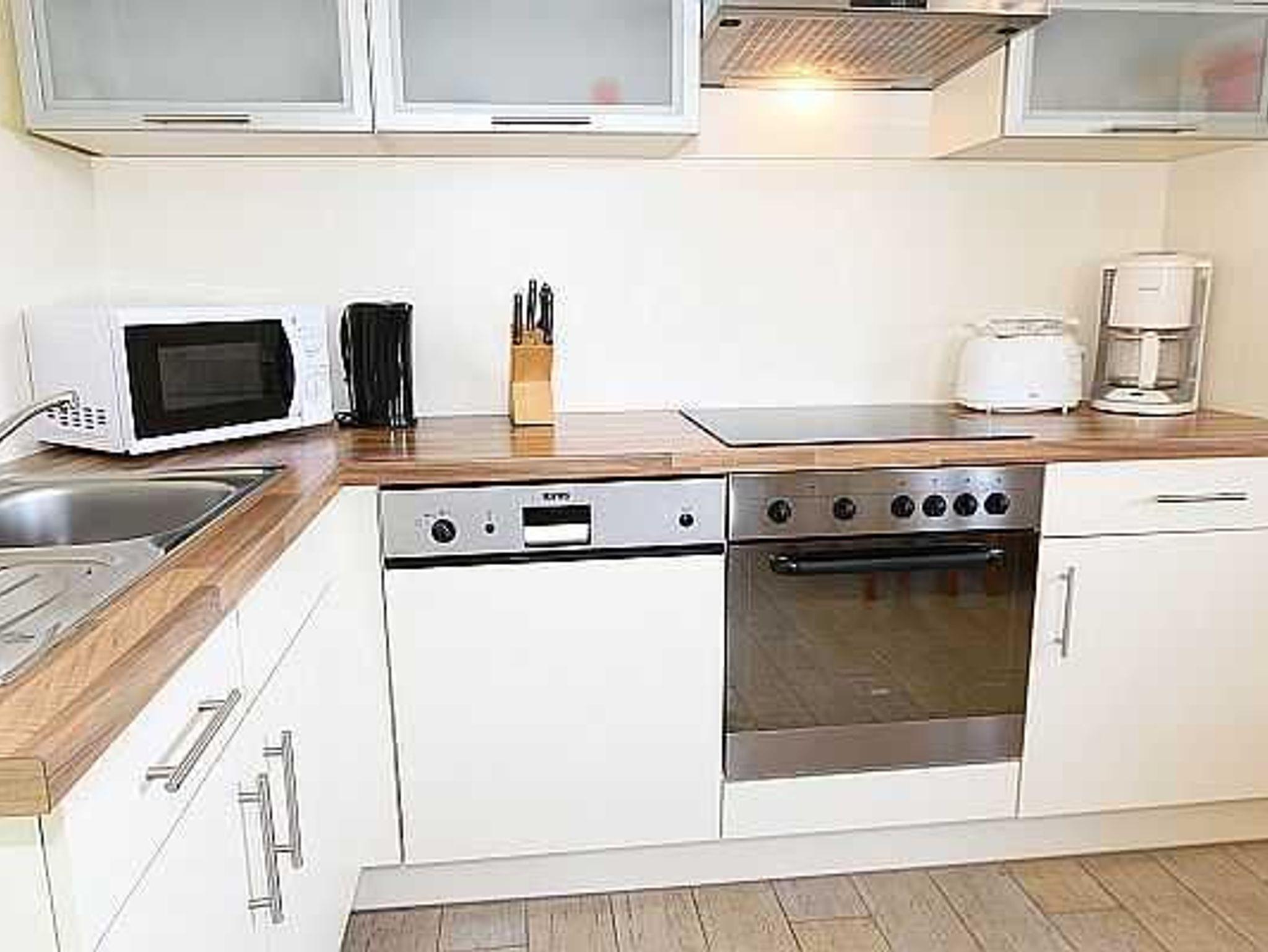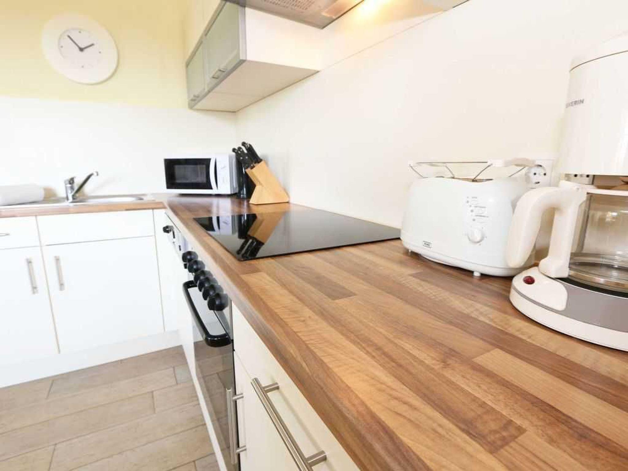 Ebenfalls finden Sie eine sehr gut ausgestattete Küchenzeile mit Spülmaschine, Backofen, 4-Platten-Cereanfeld, Mikrowelle, Kühlschrank mit Gefrierfach, Toaster, Kaffeemaschine, Wasserkocher und diverse Küchenutensilien vor.