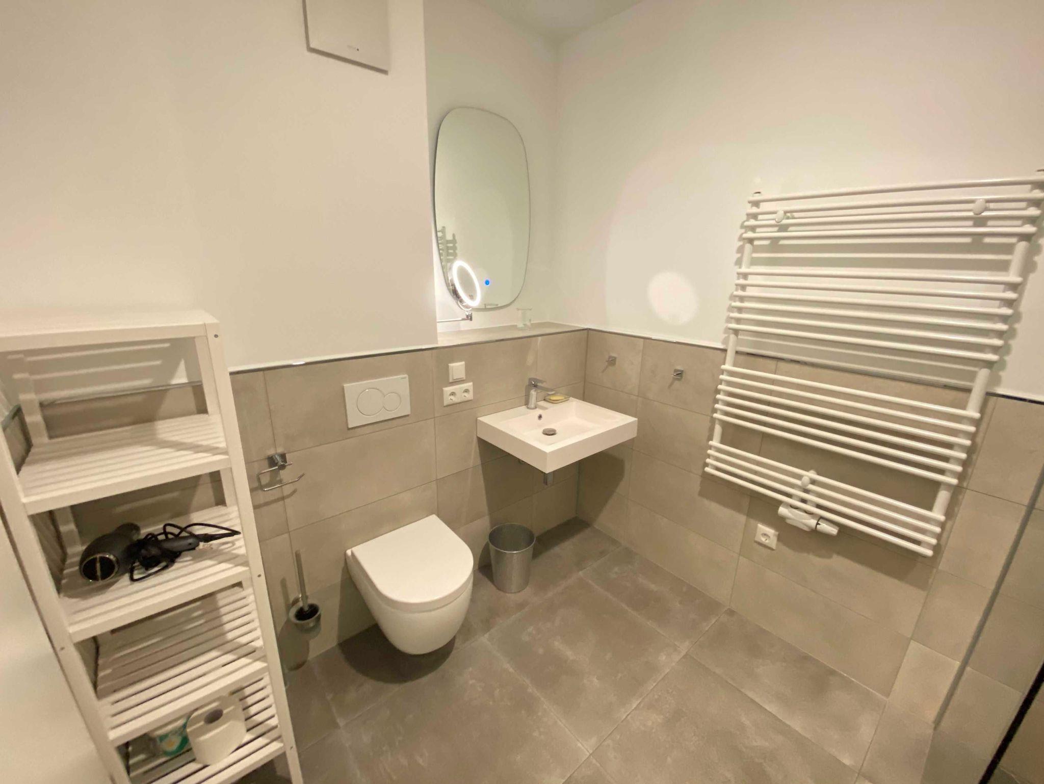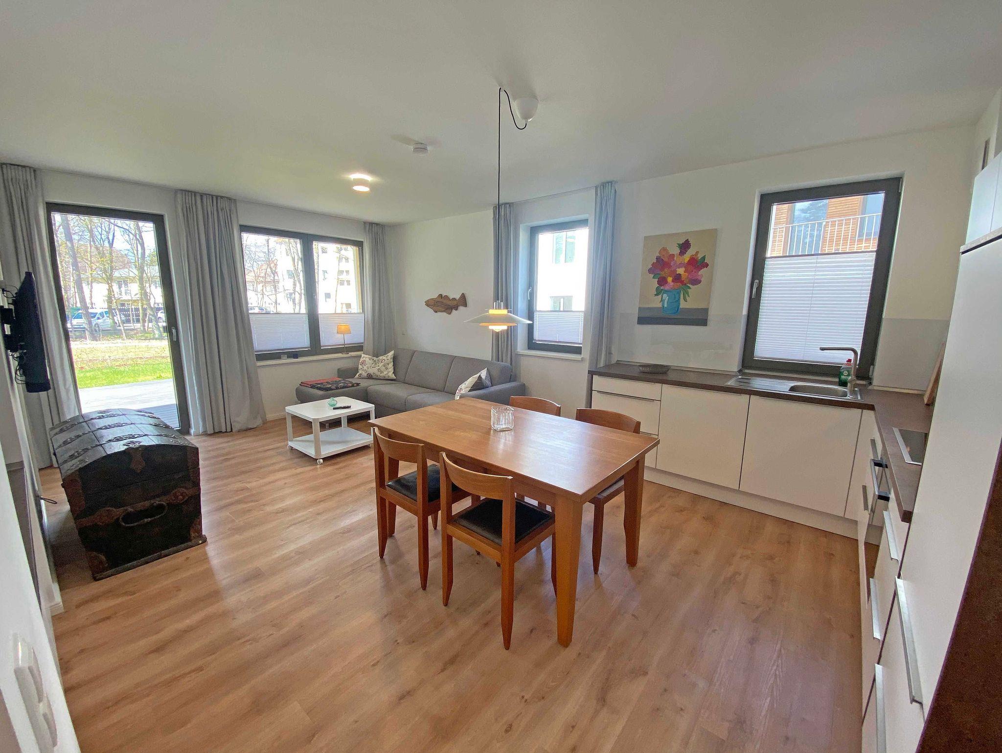 Die Nichtraucherwohnung umfasst ca. 61 m² und bietet als 2-Raumwohnung ausreichend Platz für maximal 2 bis 4 Personen. Über einen kleinen Flur mit Garderobe erreichen Sie den offenen Wohnbereich mit angrenzender Küchenzeile. Der Wohnbereich wird durch eine bequeme Couch (1,40m x 2,00m), einen mobilen Couchtisch sowie einen Smart-TV mit Denon-Soundbar abgerundet. Ein inklusiver Internetanschluss per WLAN steht Ihnen zusätzlich zur Verfügung, über das u.a. per Sono-App Musik gestreamt werden kann. Die moderne Küchenzeile mit Backofen, Kühlschrank mit Gefrierfach, Spülmaschine, Cerankochfeld, Wasserkocher, Kaffeemaschine, Espressokocher und Toaster fügt sich mit einem massiven Holzesstisch sowie lederbezogene Essstühle an. Vom Wohnbereich gelangen Sie auf Ihre bestuhlte Terrasse (Süd/West). Das Schlafzimmer wurde mit einem Boxspringbett (1,80m x 2,00m), Beistelltischen mit Nachtlicht, einen Kleiderschrank ausgestattet. Durch lichtdichte Vorhänge sowie Insektenschutzgitter steht einem angenehmen Schlaf nichts im Wege. Das innenliegende Bad verfügt über einen Waschtisch, einen beheizten und beleuchteten Spiegel, Handtuchheizung, Fön, Kosmetikspiegel, WC sowie eine große ebenerdige Klarglas-Dusche mit Regenduschkopf. Alle Räumlichkeiten sind mit einer separat regulierten Fußbodenheizung ausgestattet. Von Ihrem Tiefgaragenstellplatz (Nr.80, Einfahrtshöhe 2,15m) gelangen Sie bequem mit dem Aufzug zu Ihrer Ferienwohnung. Im Kellerraum Nr.13 haben Sie die Möglichkeit Strandgeräte, Fahrräder etc. einzuschließen. Haustiere sind nicht erlaubt. Die Erstausstattung eines Wäschepaketes (komplette Bettwäsche, 1 Duschhandtuch, 2 kleine Handtücher) können Sie bis 14 Tage vor Anreise gegen einen Aufpreis dazu buchen oder durch eigene ergänzen. Ab 2 gebuchten Paketen erhalten Sie einmalig 1 Geschirrhandtuch und 1 Duschvorleger hinzu.