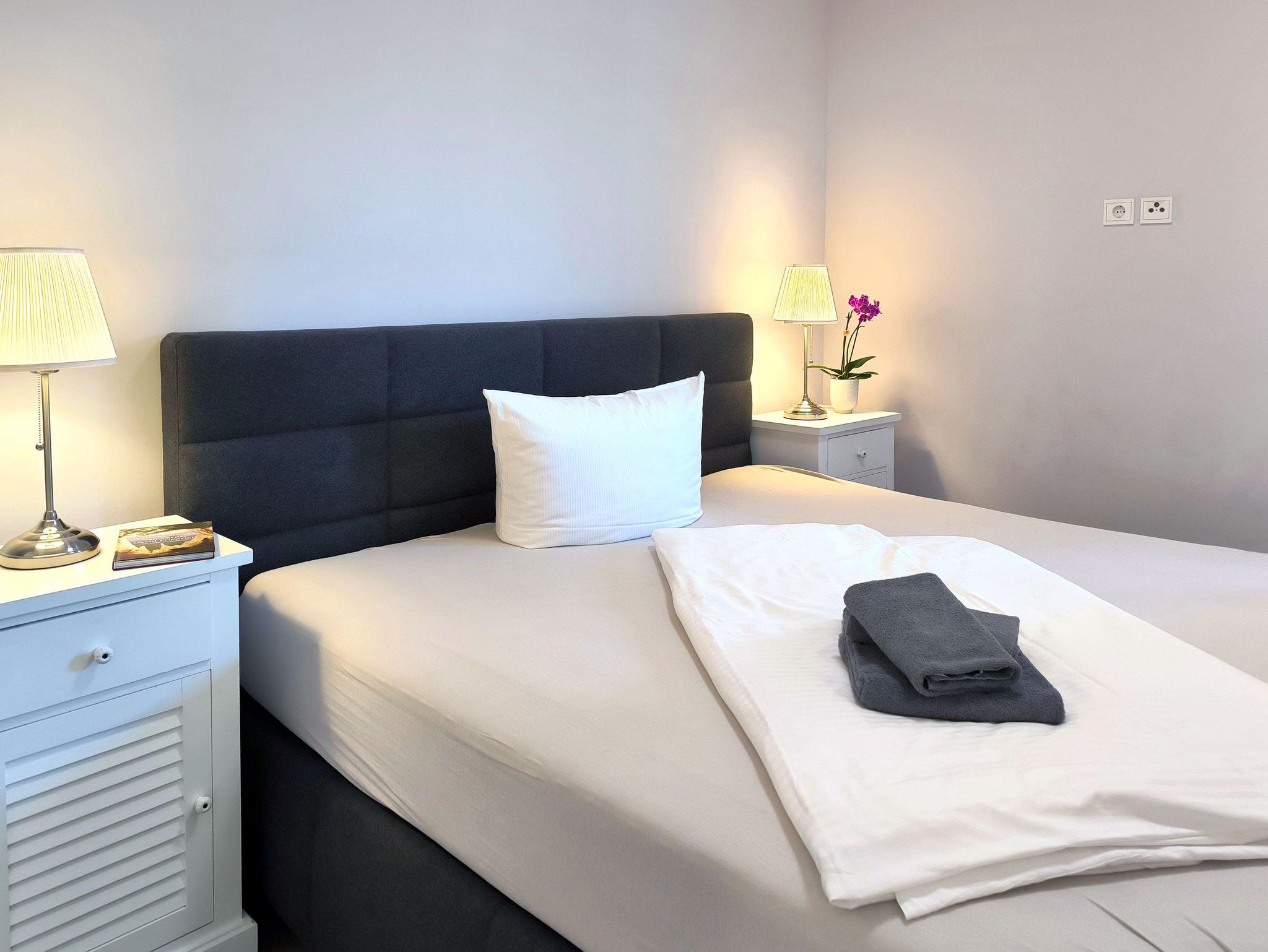 Die moderne, kleine Ferienwohnung von ca. 30 qm mit Terrasse und Garten bietet Platz für bis zu 2 Personen. Im offenen Wohnbereich gibt es ein hochwertiges Doppelbett mit einer Liegefläche von 180 x 200 cm, räumlich durch eine Wand getrennt.