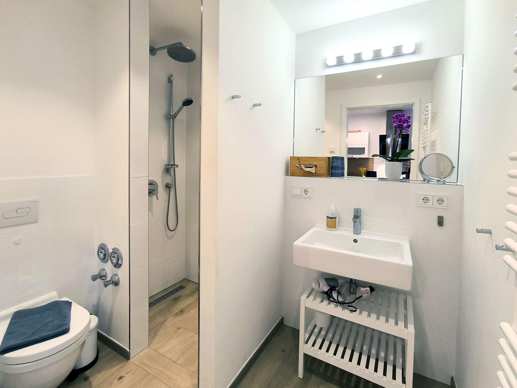 Die Wohnung ist hochwertig eingerichtet und hat neben den Wohnraum noch ein Duschbadezimmer mit WC. Die Ferienwohnung ist somit gut für 2 Personen eingerichtet.