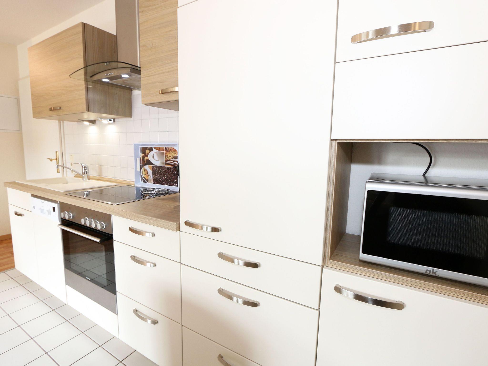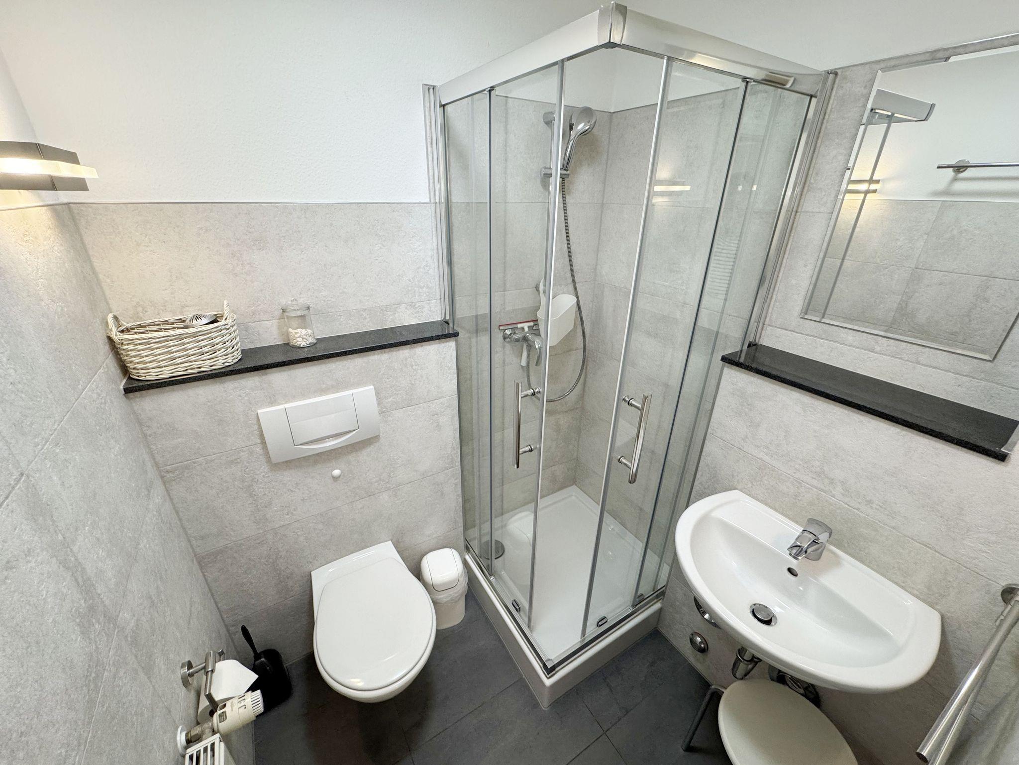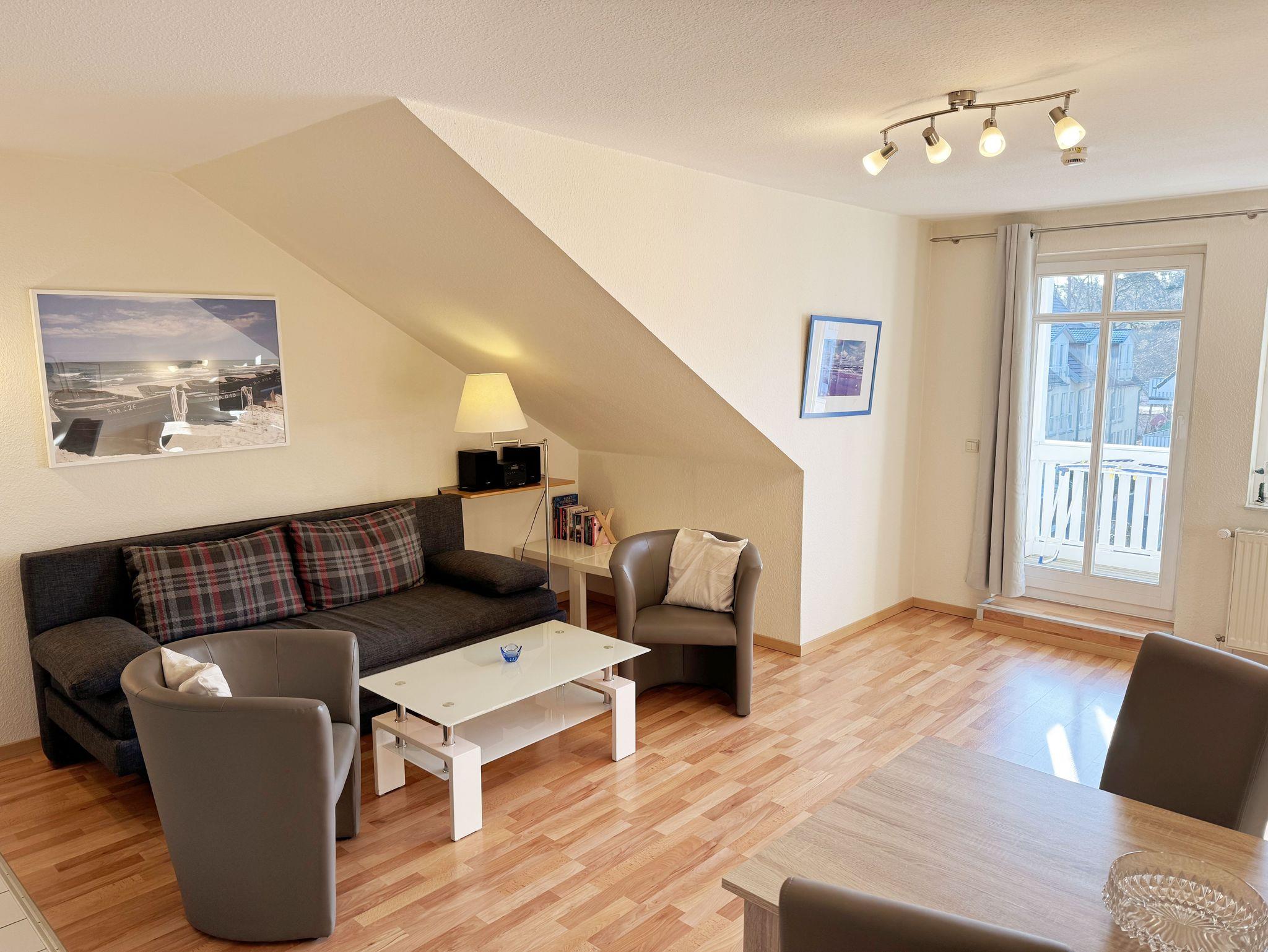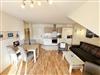 Die ca. 50 m² große gemütliche Ferienwohnung befindet sich im Dachgeschoss. Es ist eine komfortable Nichtraucherwohnung für 2 bis 3 Personen. Die Wohnung hat einen kombinierten Wohn-, Küchen- und Essbereich, einen Flur, ein Schlafzimmer und ein Bad. Die moderne Küchenzeile verfügt über ein Cerankochfeld mit Backofen und Abzugshaube, Kühlschrank mit Gefrierfach, Geschirrspüler, Mikrowelle, Kaffeemaschine, Senseo Padmaschine, Wasserkocher, Eierkocher, Toaster und weitere Küchenutensilien. Im Wohnbereich steht eine Couch mit Schlaffunktion und einer Liegefläche von 2,00 m x 1,60 m, die komplett mit Lattenrost und Federkern ausgestattet ist. Auf dem beleuchteten Sideboard stehen ein Smart-TV, ein DVD-Player und eine kleine Stereoanlage mit CD-Spieler und DAB-Radio. Zum Essbereich zählt ein Tisch mit 4 komfortabel und gepolsterten Stühlen. Der nach Süden ausgerichtete Balkon ist vom Wohn- sowie vom Schlafbereich aus begehbar und verfügt über Balkonmöbel sowie einen Wäscheständer. Dort kann der Tag mit dem Blick über die Promenade der Strandstraße beim Frühstück beginnen oder bei einem Glas Wein ausklingen. Im Schlafbereich stehen ein Doppelbett mit 2 Matratzen je (0,90m x 2,00m) mit Nachttischkonsolen, TV sowie ein großer Kleiderschrank. Der Sanitärbereich wird durch eine Dusche, WC, Waschtisch und Haartrockner abgerundet Auch in Ihrem Urlaub brauchen Sie auf einen Internetzugang (WLAN) nicht verzichten, dieser ist vorhanden und inklusive. Der zur Wohnung gehörende PKW-Stellplatz Nr.06 befindet sich hinter dem Haus. Haustiere sind nicht erlaubt. Die Erstausstattung eines Wäschepaketes (komplette Bettwäsche, 1 Duschhandtuch, 1 kleines Handtuch) können Sie bis 14 Tage vor Anreise gegen einen Aufpreis dazu buchen oder durch eigene ergänzen. Ab 2 gebuchten Paketen erhalten Sie einmalig 1 Geschirrhandtuch und 1 Duschvorleger hinzu.