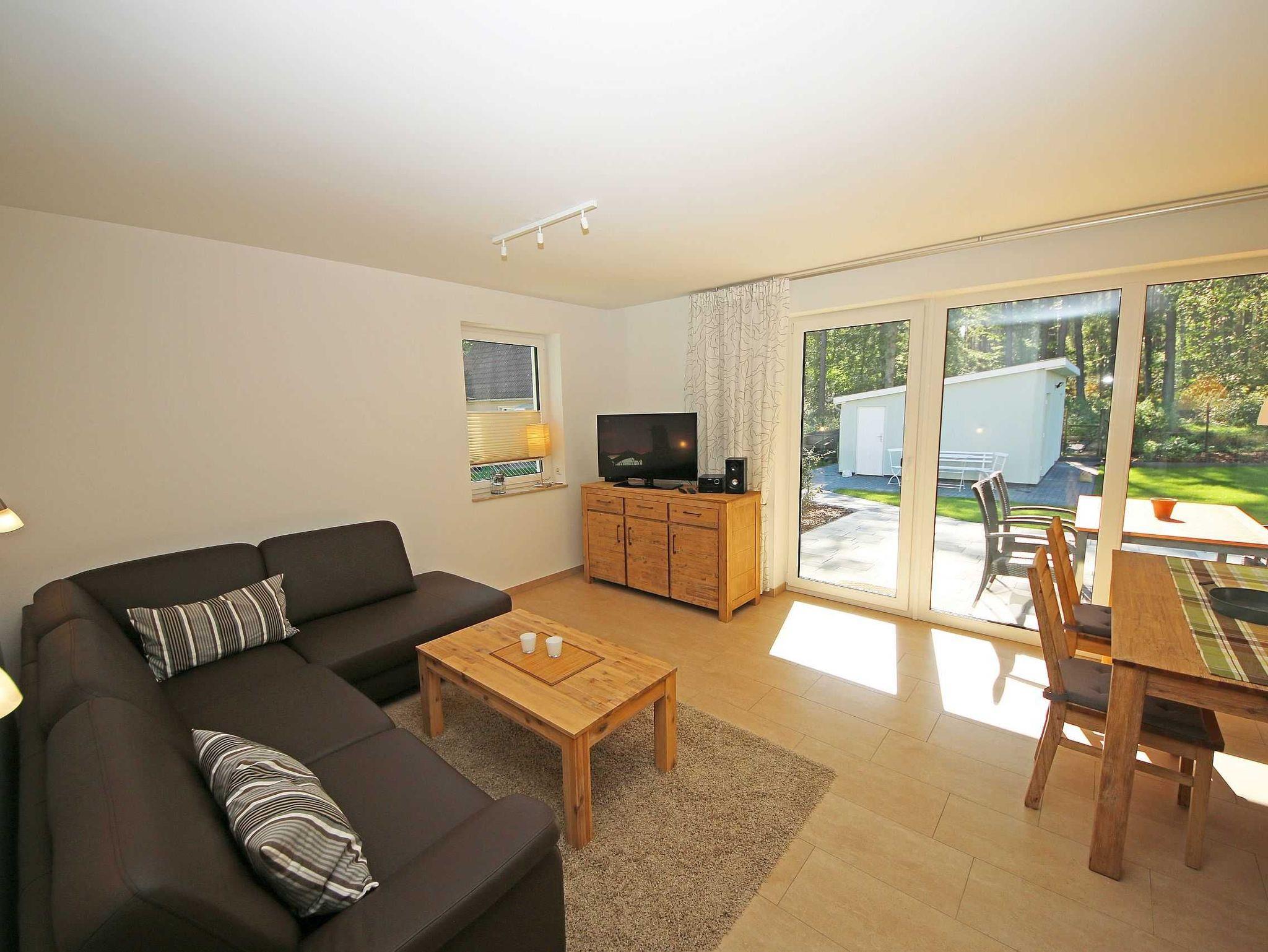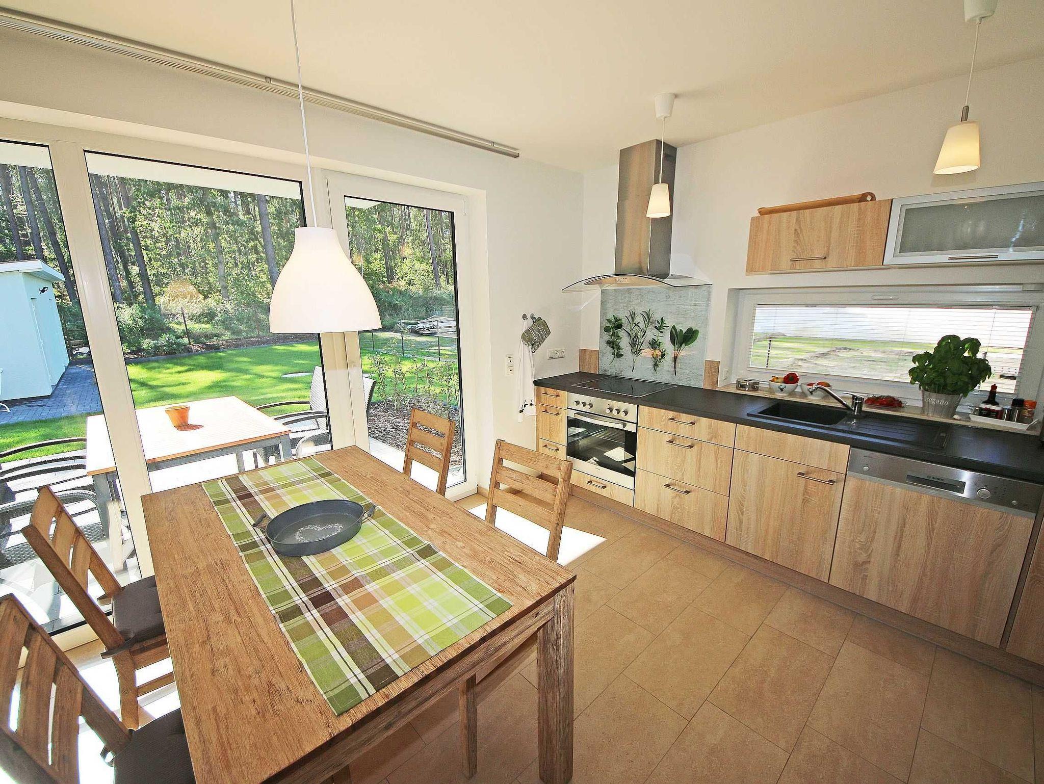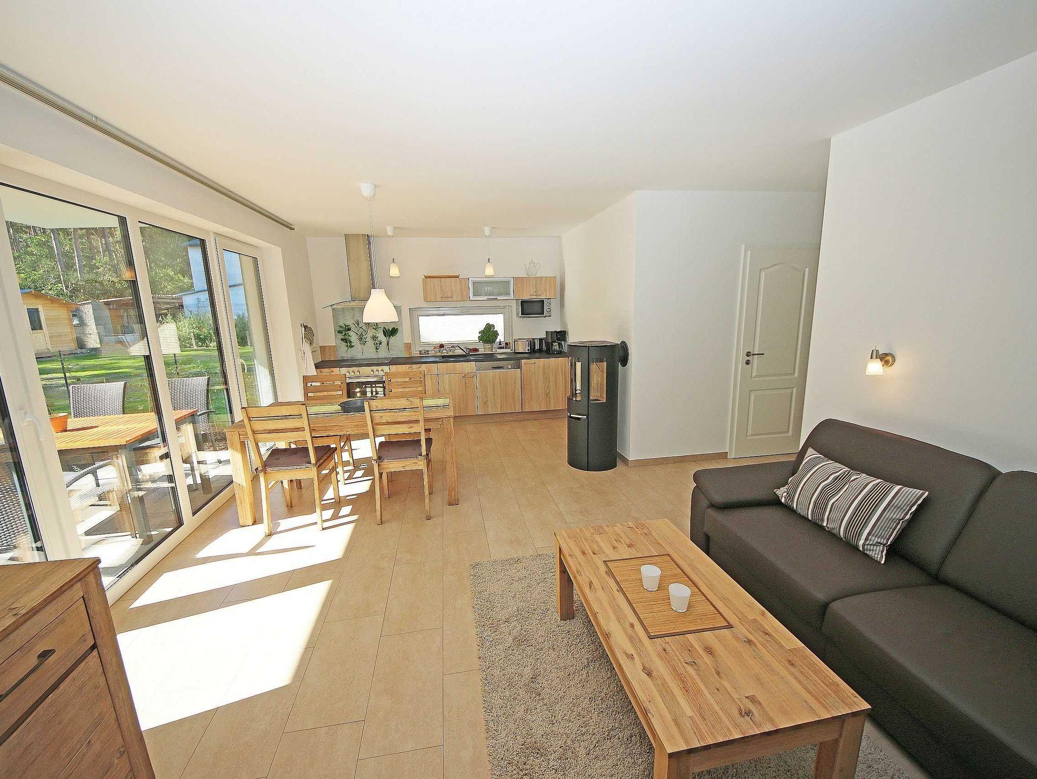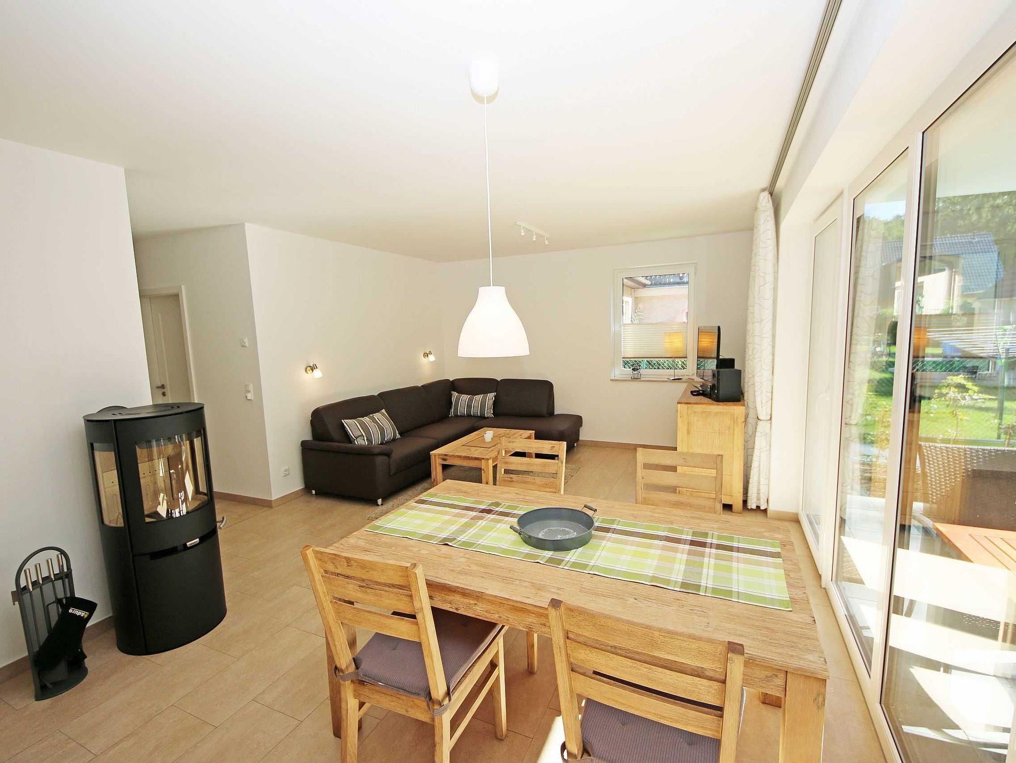 Die gebaute, modern eingerichtete Ferienwohnung hat eine Größe von ca. 65 qm und ist mit ausgewählten Stilelementen versehen. Sie bietet Platz für 2 bis 4 Erwachsene und 1 Kleinkind bis 3 Jahre im Kinderreisebett. Die Allergikerfreundliche Nichtraucherwohnung befindet sich im Erdgeschoss und ist daher gut für Familien mit Kindern und für ältere Gäste geeignet. Zu der Wohnung gehört eine bestuhlte, mit Sonnenschirm überdachte Terrasse mit Blick in den Küstenwald sowie ein zusätzlicher Grillplatz. Der Wohnbereich ist mit einer gemütlichen Eckcouch (Leder), Couchtisch, Leselampe sowie Sideboard ausgestattet. Zu den Unterhaltungsmöglichkeiten in den Abendstunden oder bei schlechtem Wetter gehören ein Smart-TV, Blu-Ray-Player sowie eine Hi-Fi Kompaktanlage mit CD- und USB-Anschluss. Auch auf einen Internetanschluss (WLAN) brauchen Sie nicht verzichten. Dieser ist inklusive. Ein Kaminofen für wohlige Wärme rundet die Gemütlichkeit ab. Kaminholz ist nicht inklusive. Die komplett ausgestattete Küchenzeile mit Ceranfeld, Backofen, Geschirrspüler, Kühlschrank mit Eisfach, Mikrowelle, Kaffeemaschine, Wasserkocher, Toaster, diverse Küchenutensilien wird durch den Essplatz am Panoramafenster komplettiert. Einer der 2 Schlafräume ist mit einem Doppelbett (1,80m x 2,00m), Nachttischablagen und einem geräumigen Kleiderschrank ausgestattet. Das zweite Schlafzimmer hat zwei Einzelbetten (0,90m x 2,00m), Nachttischablagen und einen Kleiderschrank sowie einen LCD-TV. Die Schlafräume sind mit einem modernen Vinylbelag versehen. Die Schlafräume sind für einen angenehmen Schlaf abdunkelbar und mit Insektenschutzgittern versehen. In allen anderen Räumlichkeiten sind Fliesen verlegt worden. Für eine angenehme Wärme sorgt die im ganzen Haus verlegte Fußbodenheizung. Das Tageslichtbad wird durch eine flache Duschwanne, einen Waschtisch, ein WC, Fön und einem beheizten Handtuchhalter abgerundet. Das Gäste-WC wurde zusätzlich mit einem beheizten Handtuchtrockner ausgestattet. Beide Bäder sind ebenfalls mit Insektenschutzgittern versehen. Für unsere kleinen Gäste ist 1x Hochstuhl inklusive. Haustiere sind nicht erlaubt. Ein PKW-Stellplatz befindet sich auf dem Grundstück. Mitgebrachte oder geliehene Fahrräder können Sie im hauseigenen Abstellraum unterbringen. Die Erstausstattung eines Wäschepaketes (komplette Bettwäsche, 1 Duschhandtuch, 1 kleines Handtuch) können Sie bis 14 Tage vor Anreise gegen einen Aufpreis dazu buchen oder durch eigene ergänzen. Ab 2 gebuchten Paketen erhalten Sie einmalig 1 Geschirrhandtuch und 1 Duschvorleger hinzu.