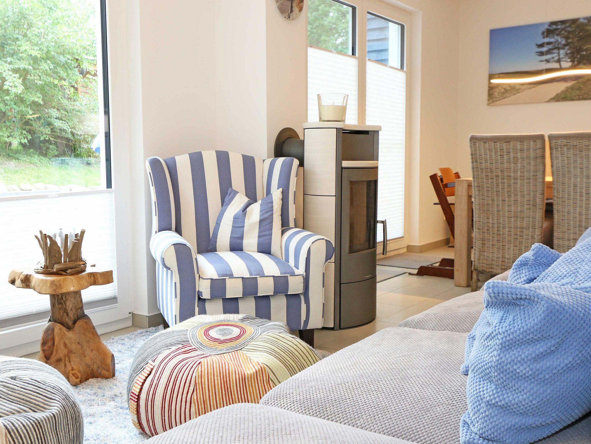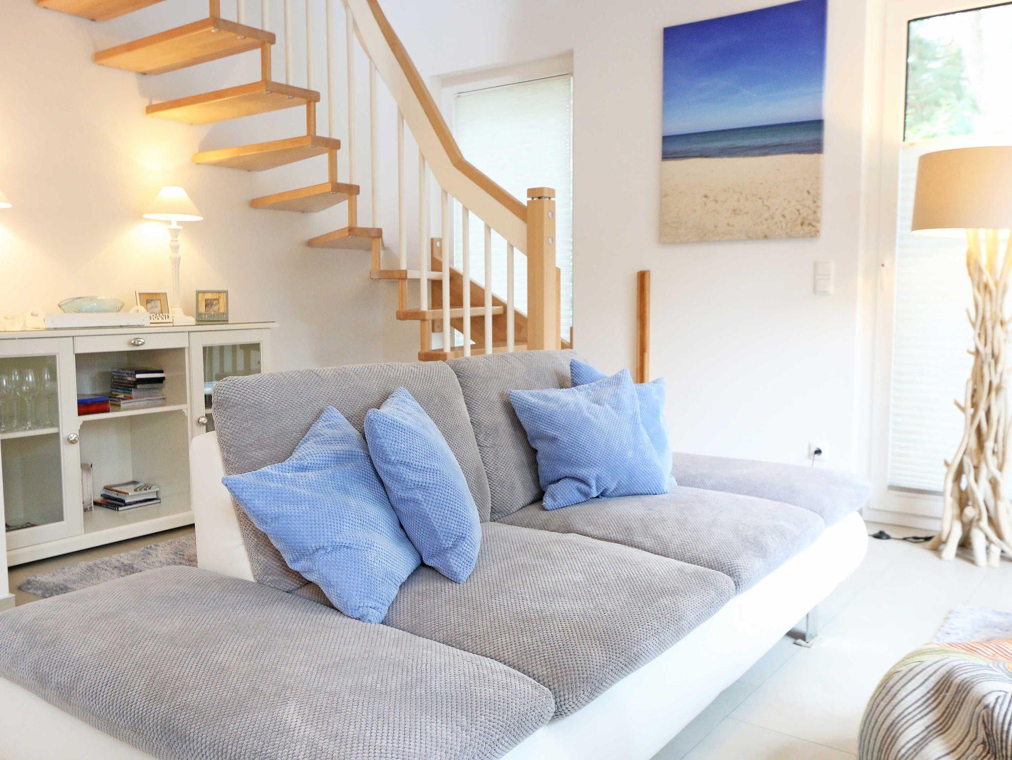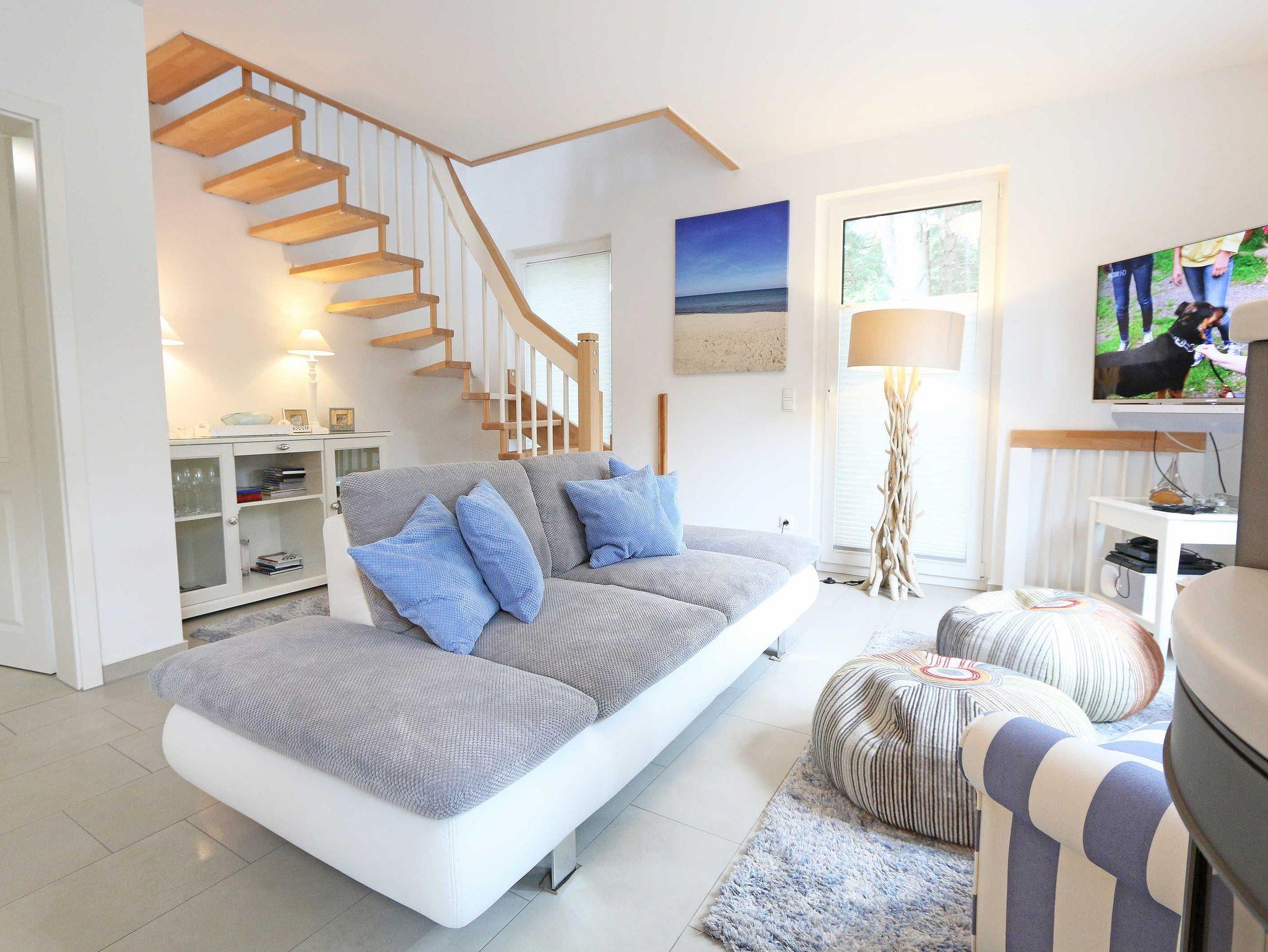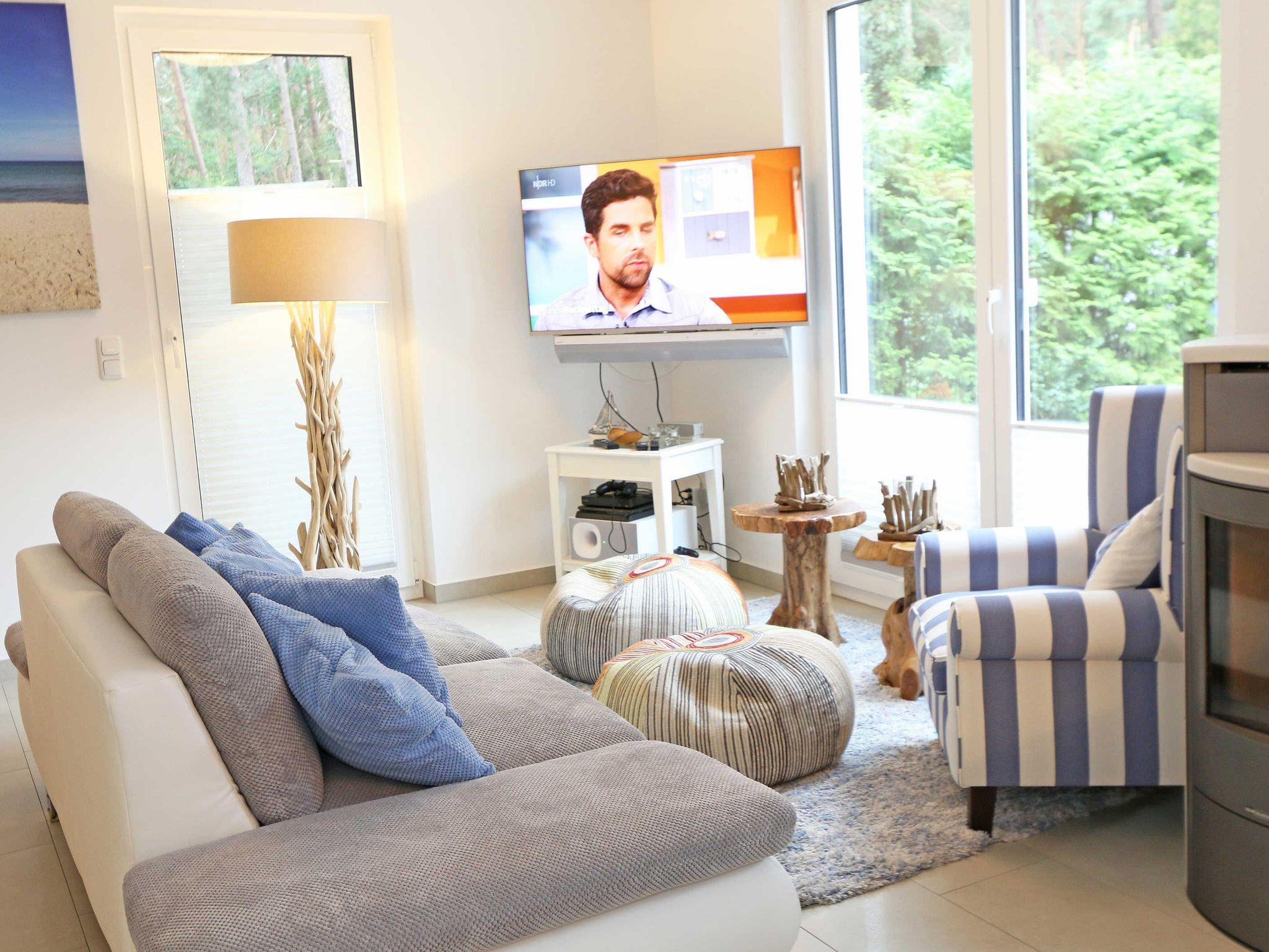 Das Nichtraucherferienhaus „Blaue Welle“ befindet sich in einzigartiger Lage, im Dünenpark Baabe. Durch die großzügige Wohnfläche von ca. 95 qm, welche sich über 2 Etagen erstreckt, bietet Ihnen das Haus ausreichend Platz für max. 5 Erwachsene und 1 Kleinkind bis 3 Jahre im Kinderreisebett. Die Innenausstattung wird Ihr Herz höher schlagen lassen, denn durch die angefertigten Echtholzmöbel sowie die Einbauküche aus dem Hause Leicht werden besondere Akzente im Haus gesetzt. Der kombinierte Wohn-/Essbereich wurde mit einer gemütlichen Couchecke, Couchtisch, einem Hocker, Leselampe sowie ein Sideboard ausgestattet. Für gemütliche Abende dient ein Flachbild-TV mit passender Soundbar von SONY, ein DVD-Player durch die PS4 und ein moderner Kaminofen mit großem Sichtfenster. Auch auf einen Internetanschluss (WLAN) brauchen Sie nicht verzichten dieser ist für Sie inklusive. Die angrenzende Einbauküche lässt keine Wünsche offen mit einem Kühlschrank inklusive großem Eisfach, ein Cerankochfeld, einer Dunstabzugshaube, ein kombinierter Backofen mit Mikrowelle, einem Geschirrspüler, einer Duo-Kaffeemaschine (Pads und Filter/Phillips Senseo Thermo Duo), einem Toaster, einem Wasserkocher, einem Handrührgerät, einem Pürierstab sowie vielen Küchenhelfer. Vom Wohnbereich gelangen Sie auf die großflächige und beleuchtete Terrasse (Süd/West) mit robuster Bestuhlung. Im Gartenbereich wartet zusätzlich ein Ostseestrandkorb sowie ein Steingrill auf Sie. Im Erdgeschoss befindet sich eines von insgesamt 3 Schlafzimmern, welches mit einem Queensize-Bett (1,40 m x 2,00 m), 2 kleinen Schränken, 2 kleinen Sesseln und einem Flachbild-TV ausgestattet ist. Gleich gegenüber befindet sich das ebenerdige Badezimmer mit einer Echtglasdusche, WC, Fön, Waschtisch sowie einer hauseigenen Sauna. Über die Treppe gelangen Sie vom Wohnbereich in die 1. Etage des Hauses, wo Sie eine lichtdurchflutete und offene Galerie erwartet. Hier lässt es sich wunderbar mit einem Buch relaxen. 2 weitere Schlafzimmer sind hier hell und freundlich eingerichtet worden und bieten Ihnen jeweils 1 Doppelbett (1,80 m x 2,00 m), 2 Nachttischablagen, ein Flachbild-TV und Echtholzkommoden. Bei geöffnetem Fenster können Sie dem Wellenspiel der Ostsee zuhören. Alle Schlafräume sind mit verdunkelnden Rollos oder Plissee und Insektenschutzgitter versehen, so dass einem ruhigen Ausschlafen nichts im Wege steht. Das 2. Tageslichtbad wird durch eine ebenerdige Dusche, eine formschöne Badewanne, ein WC, einen Fön, einen Waschtisch sowie einen Waschtrockner abgerundet. Für eine angenehme Wärme sorgt in allen Räumlichkeiten die Fußbodenheizung. Zusätzliche Highlights sind eine Entkalkungsanlage sowie eine verbrauchsarme Gasbrennwerttherme. Für unsere kleinen Gäste stehen 1x Tripp-Trapp Hochstuhl und 1x Kinderreisebett (mit Zusatzkindermatratze / ohne Bett-Inlett) kostenfrei zur Verfügung. Auch 2 vorhandene Fallschutzgitter für die Treppe oder auch Steckdosenschutz sind vorhanden. Haustiere sind nicht erlaubt. Zum Ferienhaus gehören 2 nebeneinander gelegene PKW-Stellplätze (Blaue Welle). Die Erstausstattung eines Wäschepaketes (komplette Bettwäsche, 1 Duschhandtuch, 2 kleine Handtücher) können Sie bis 14 Tage vor Anreise gegen einen Aufpreis dazu buchen oder durch eigene ergänzen. Ab 2 gebuchten Paketen erhalten Sie einmalig 1 Geschirrhandtuch und 1 Duschvorleger hinzu.