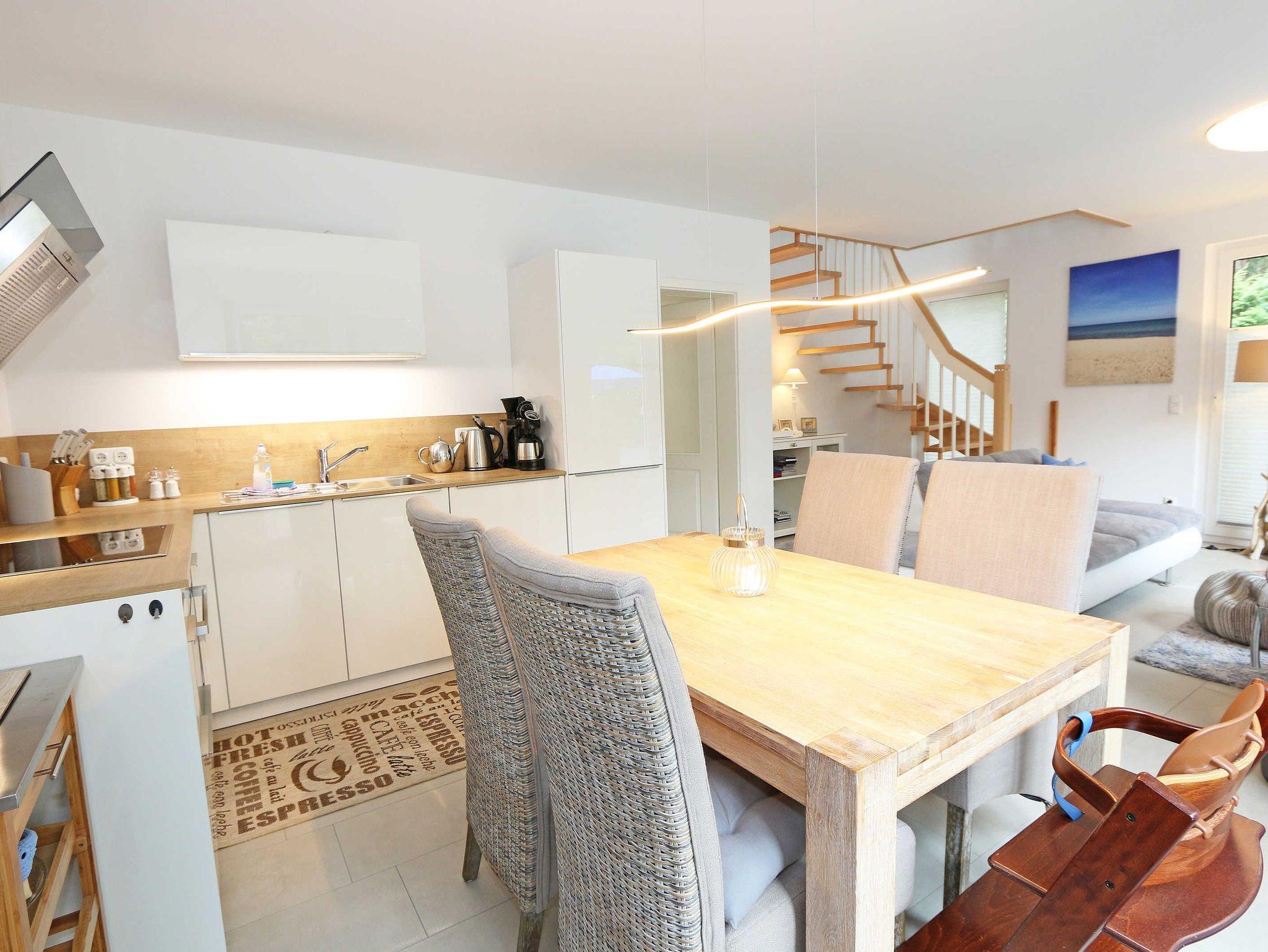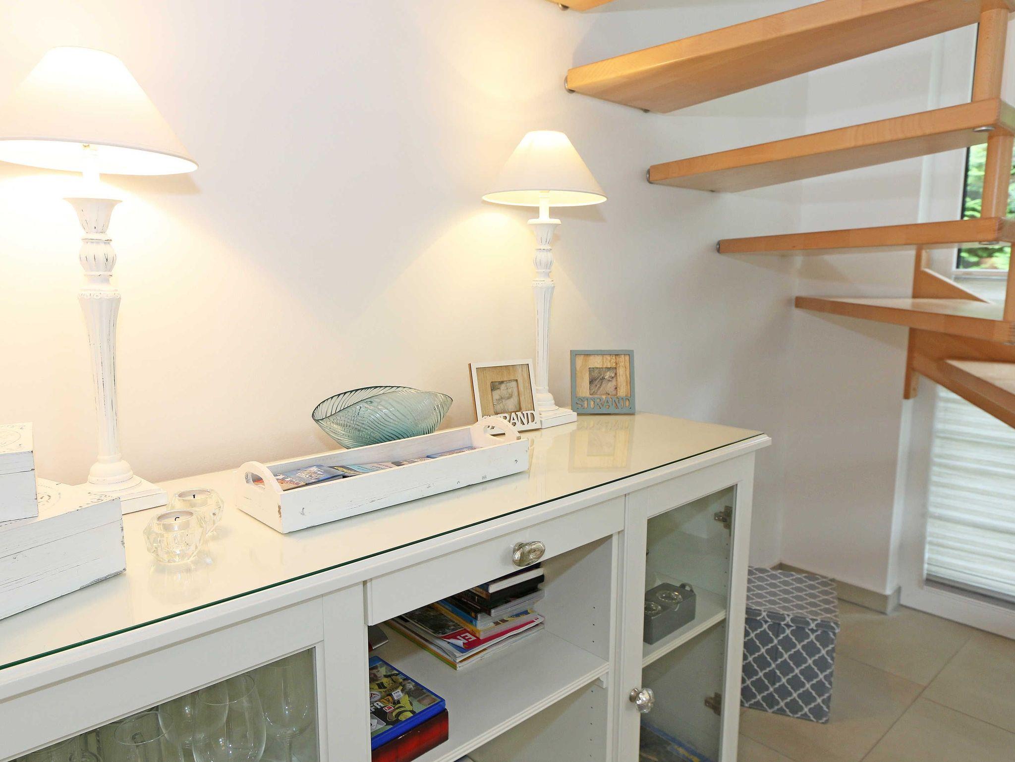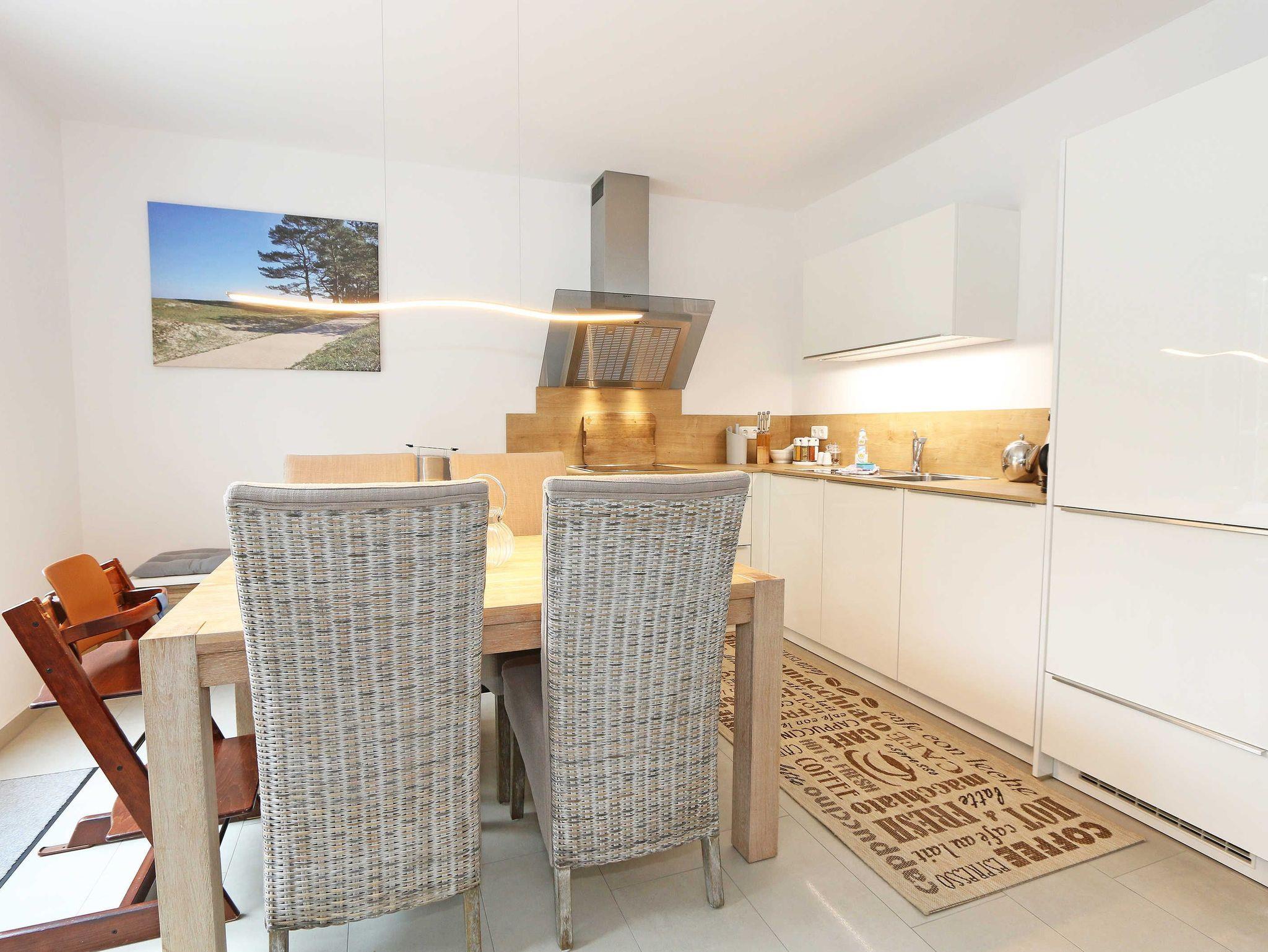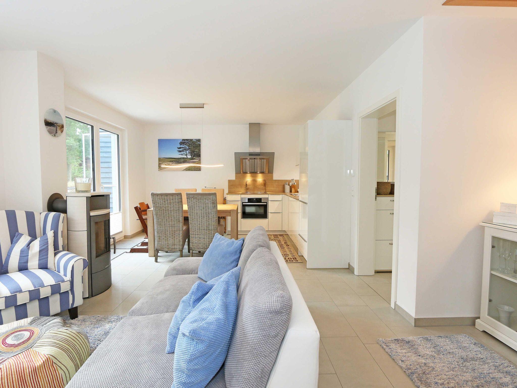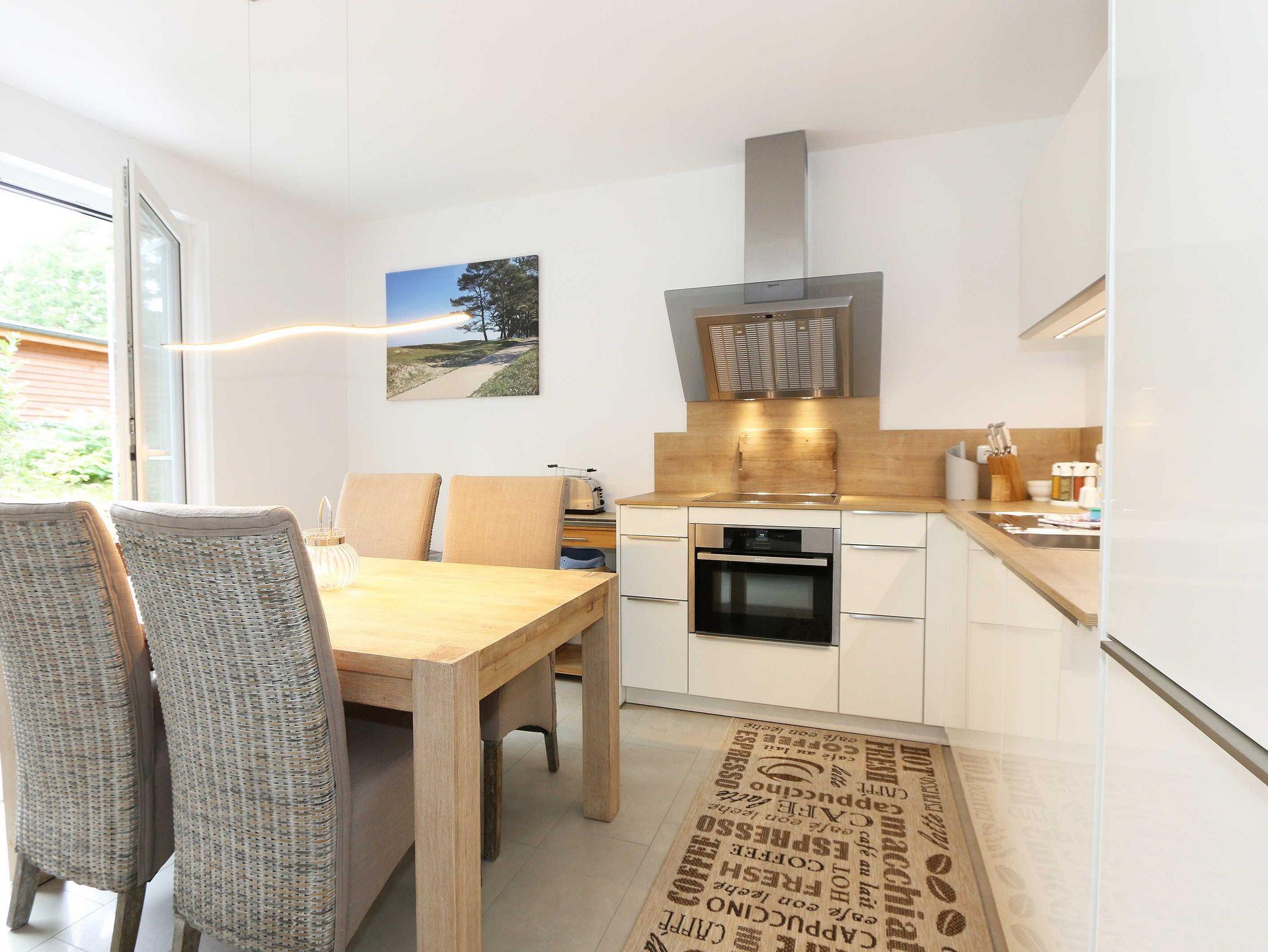 Das Nichtraucherferienhaus „Blaue Welle“ befindet sich in einzigartiger Lage, im Dünenpark Baabe. Durch die großzügige Wohnfläche von ca. 95 qm, welche sich über 2 Etagen erstreckt, bietet Ihnen das Haus ausreichend Platz für max. 5 Erwachsene und 1 Kleinkind bis 3 Jahre im Kinderreisebett. Die Innenausstattung wird Ihr Herz höher schlagen lassen, denn durch die angefertigten Echtholzmöbel sowie die Einbauküche aus dem Hause Leicht werden besondere Akzente im Haus gesetzt. Der kombinierte Wohn-/Essbereich wurde mit einer gemütlichen Couchecke, Couchtisch, einem Hocker, Leselampe sowie ein Sideboard ausgestattet. Für gemütliche Abende dient ein Flachbild-TV mit passender Soundbar von SONY, ein DVD-Player durch die PS4 und ein moderner Kaminofen mit großem Sichtfenster. Auch auf einen Internetanschluss (WLAN) brauchen Sie nicht verzichten dieser ist für Sie inklusive. Die angrenzende Einbauküche lässt keine Wünsche offen mit einem Kühlschrank inklusive großem Eisfach, ein Cerankochfeld, einer Dunstabzugshaube, ein kombinierter Backofen mit Mikrowelle, einem Geschirrspüler, einer Duo-Kaffeemaschine (Pads und Filter/Phillips Senseo Thermo Duo), einem Toaster, einem Wasserkocher, einem Handrührgerät, einem Pürierstab sowie vielen Küchenhelfer. Vom Wohnbereich gelangen Sie auf die großflächige und beleuchtete Terrasse (Süd/West) mit robuster Bestuhlung. Im Gartenbereich wartet zusätzlich ein Ostseestrandkorb sowie ein Steingrill auf Sie. Im Erdgeschoss befindet sich eines von insgesamt 3 Schlafzimmern, welches mit einem Queensize-Bett (1,40 m x 2,00 m), 2 kleinen Schränken, 2 kleinen Sesseln und einem Flachbild-TV ausgestattet ist. Gleich gegenüber befindet sich das ebenerdige Badezimmer mit einer Echtglasdusche, WC, Fön, Waschtisch sowie einer hauseigenen Sauna. Über die Treppe gelangen Sie vom Wohnbereich in die 1. Etage des Hauses, wo Sie eine lichtdurchflutete und offene Galerie erwartet. Hier lässt es sich wunderbar mit einem Buch relaxen. 2 weitere Schlafzimmer sind hier hell und freundlich eingerichtet worden und bieten Ihnen jeweils 1 Doppelbett (1,80 m x 2,00 m), 2 Nachttischablagen, ein Flachbild-TV und Echtholzkommoden. Bei geöffnetem Fenster können Sie dem Wellenspiel der Ostsee zuhören. Alle Schlafräume sind mit verdunkelnden Rollos oder Plissee und Insektenschutzgitter versehen, so dass einem ruhigen Ausschlafen nichts im Wege steht. Das 2. Tageslichtbad wird durch eine ebenerdige Dusche, eine formschöne Badewanne, ein WC, einen Fön, einen Waschtisch sowie einen Waschtrockner abgerundet. Für eine angenehme Wärme sorgt in allen Räumlichkeiten die Fußbodenheizung. Zusätzliche Highlights sind eine Entkalkungsanlage sowie eine verbrauchsarme Gasbrennwerttherme. Für unsere kleinen Gäste stehen 1x Tripp-Trapp Hochstuhl und 1x Kinderreisebett (mit Zusatzkindermatratze / ohne Bett-Inlett) kostenfrei zur Verfügung. Auch 2 vorhandene Fallschutzgitter für die Treppe oder auch Steckdosenschutz sind vorhanden. Haustiere sind nicht erlaubt. Zum Ferienhaus gehören 2 nebeneinander gelegene PKW-Stellplätze (Blaue Welle). Die Erstausstattung eines Wäschepaketes (komplette Bettwäsche, 1 Duschhandtuch, 2 kleine Handtücher) können Sie bis 14 Tage vor Anreise gegen einen Aufpreis dazu buchen oder durch eigene ergänzen. Ab 2 gebuchten Paketen erhalten Sie einmalig 1 Geschirrhandtuch und 1 Duschvorleger hinzu.