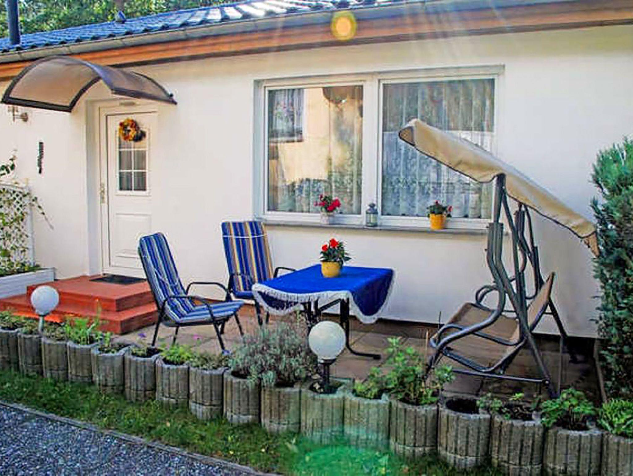 Vor dem Bungalow befindet sich eine Terrasse mit Hollywoodschaukel und Grill. Der Parkplatz, der große Garten und das WLAN können genutzt werden