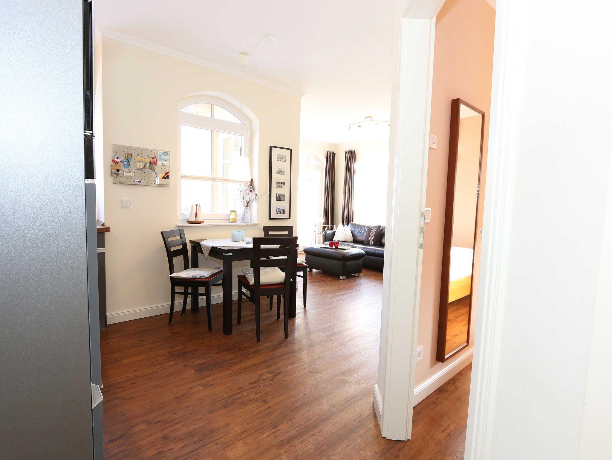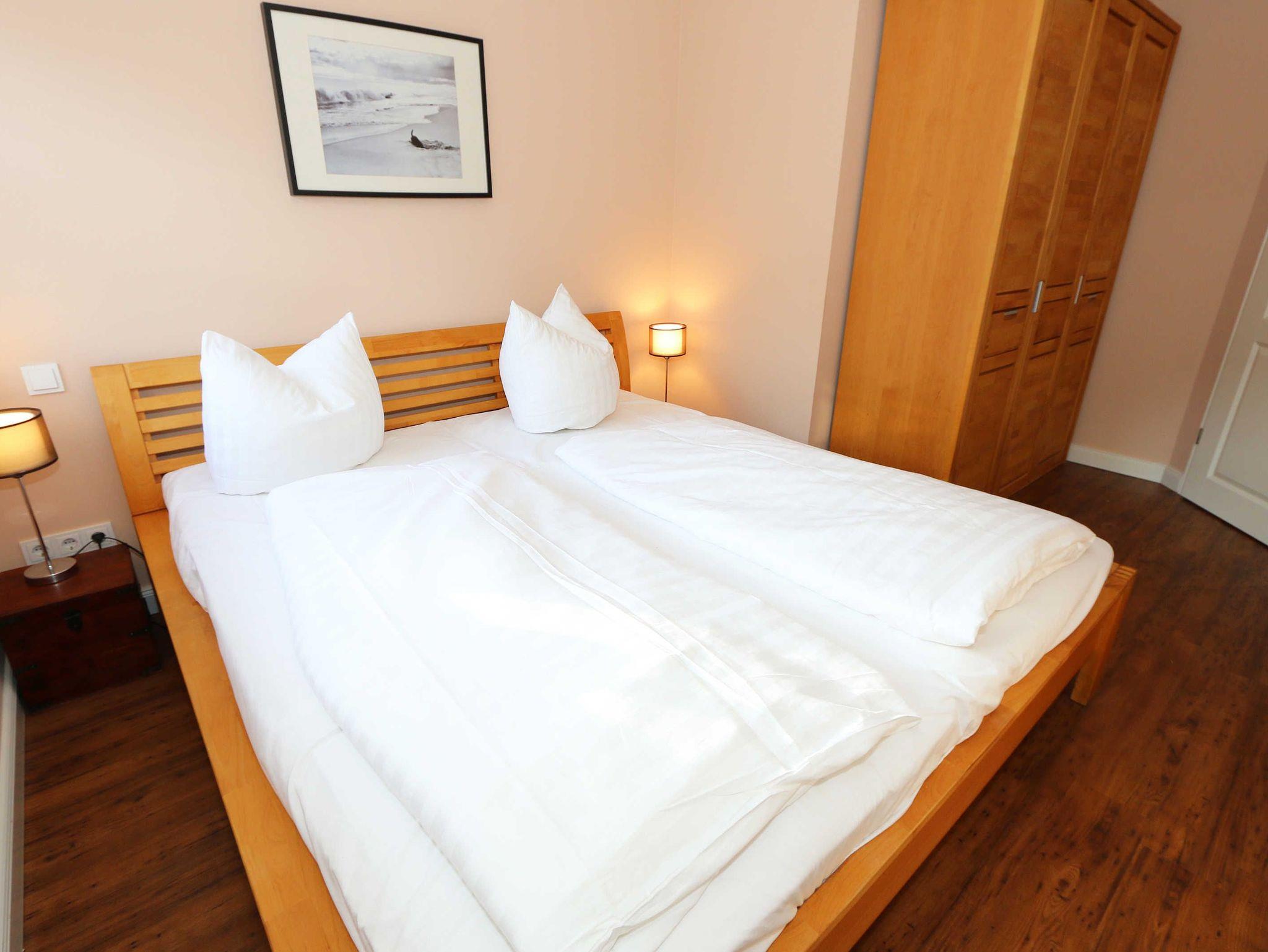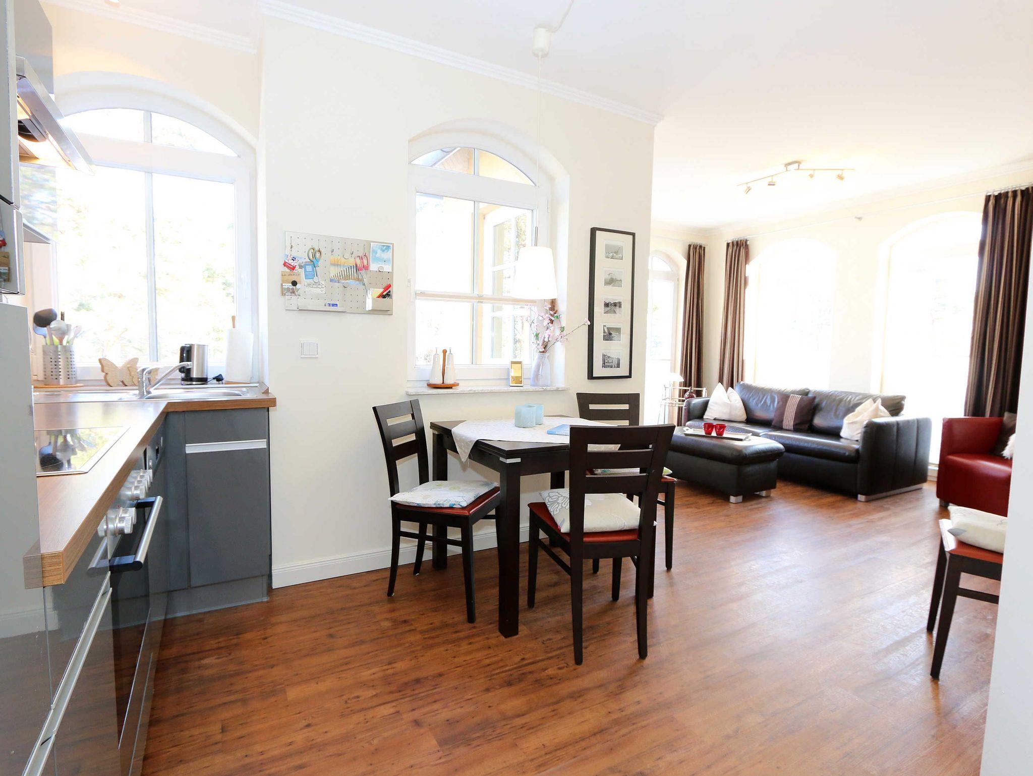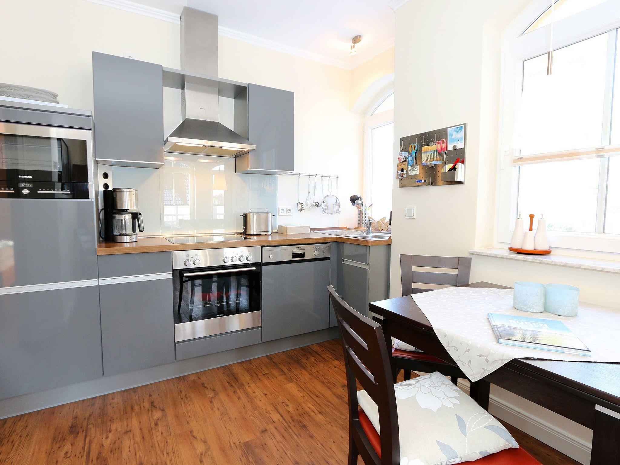 Ihre Nichtraucher/Ferienwohnung ist exklusiv mit viel Liebe zum Detail ausgestattet. Sie wohnen in einer 45 qm 2-Zimmer Wohnung für 2-3 Personen. Vom Balkon im 2. OG aus genießen Sie den Blick auf den Kurpark. Weiterhin finden Sie eine hochwertige, voll ausgestattete Pantry-Küche (Siemens-Küchengeräte, Herd, Backofen, Mikrowelle, Kühlschrank, Geschirrspülmaschine, Kaffeemaschine, Toaster, Wasserkocher, Mixer) mit einer Essecke für drei Personen. In der gemütlichen Sitzecke bestehend aus Ledercouch (ausklappbar mit Lattenrost und Matratze 1,40m x 2,00m) und zwei Sesseln können Sie es sich gemütlich machen. Dort steht Ihnen ein Smart-TV zur Verfügung. Das separate Schlafzimmer ist mit einem Doppelbett (2x0,90m x2,00m mit Sommer-und Winterbett in Übergrößen), ebenfalls Flachbildfernseher sowie geräumigem Schrank mit Bügelbrett und Bügeleisen ausgestattet. Das hochwertige Bad verfügt über Dusche, WC, Kosmetikspiegel, Fön und Handtuchheizkörper sowie einen exklusiven Waschtisch mit passenden Wandfliesen von Villeroy + Boch. Auch im Urlaub brauchen Sie in der Wohnung nicht auf einen Internetanschluss (WLAN) verzichten. Dieser ist für Sie inklusive!!! Für unsere kleinen Gäste ist ein Kinderreisebett (ohne Matratze und Bett Inlett) inklusive vorhanden. Ein Hochstuhl kann nicht gestellt werden. Im Keller des Hauses befindet sich eine Waschmaschine und ein Trockner, der gegen Gebühr genutzt werden kann. Die Erstausstattung eines Wäschepaketes (komplette Bettwäsche, 1 Duschhandtuch, 2 kleine Handtücher) können Sie bis 14 Tage vor Anreise gegen einen Aufpreis dazu buchen oder durch eigene ergänzen. Ab 2 gebuchten Paketen erhalten Sie einmalig 1 Geschirrhandtuch und 1 Duschvorleger hinzu. Zur Wohnung gehört ein Außenstellplatz Nr. 14. Im Preis inbegriffen ist ein Strandkorb (von ca. Mai bis September), in dem Sie die See auch bei einer steifen Brise genießen können. Wir freuen uns auf Sie und heißen Sie herzlich willkommen in Baabe!