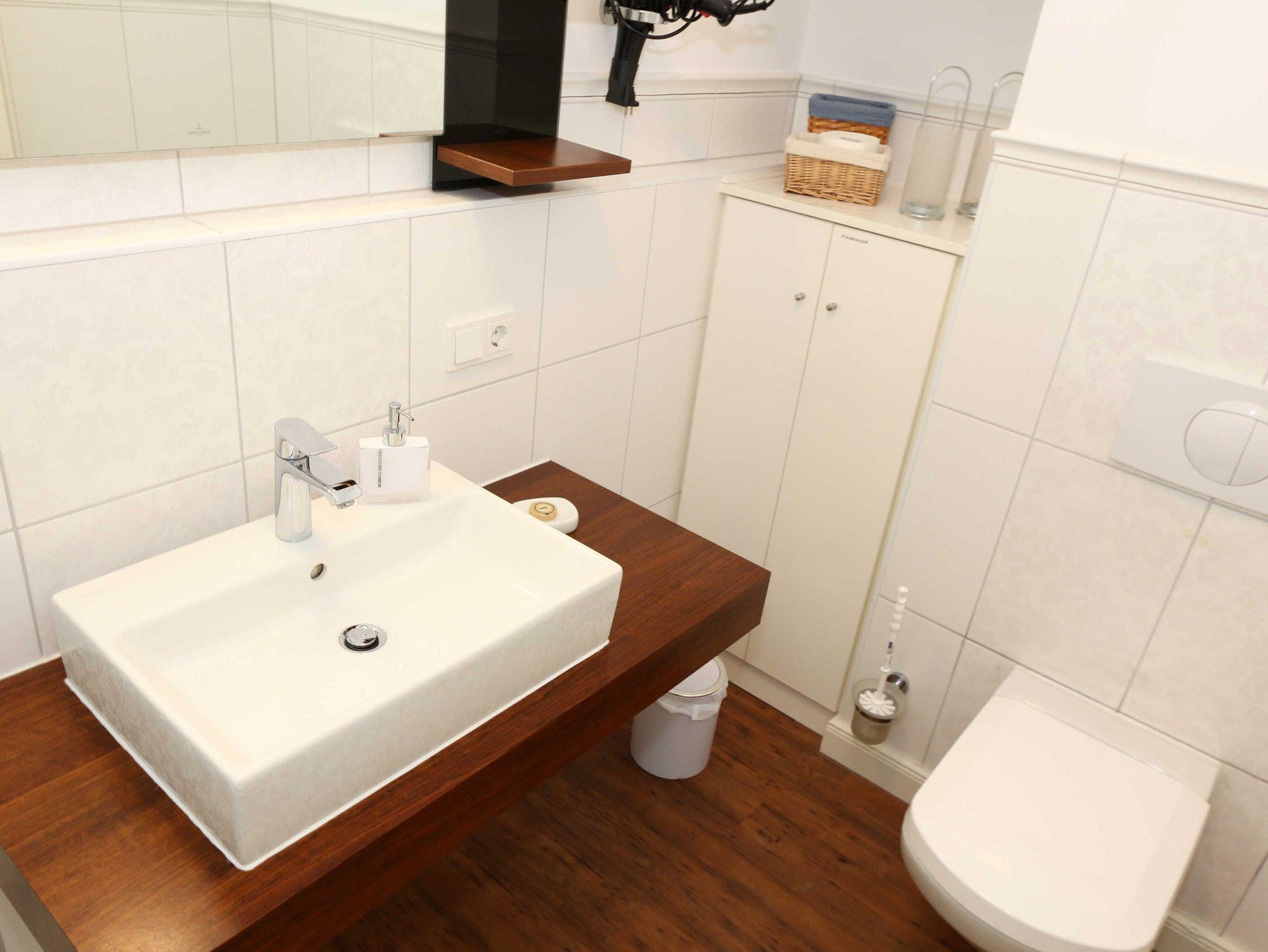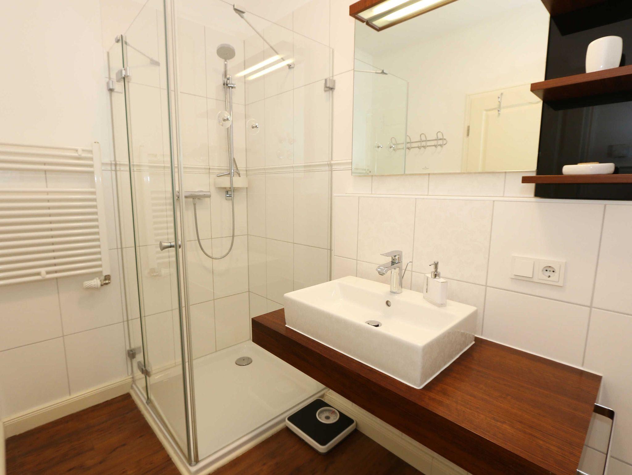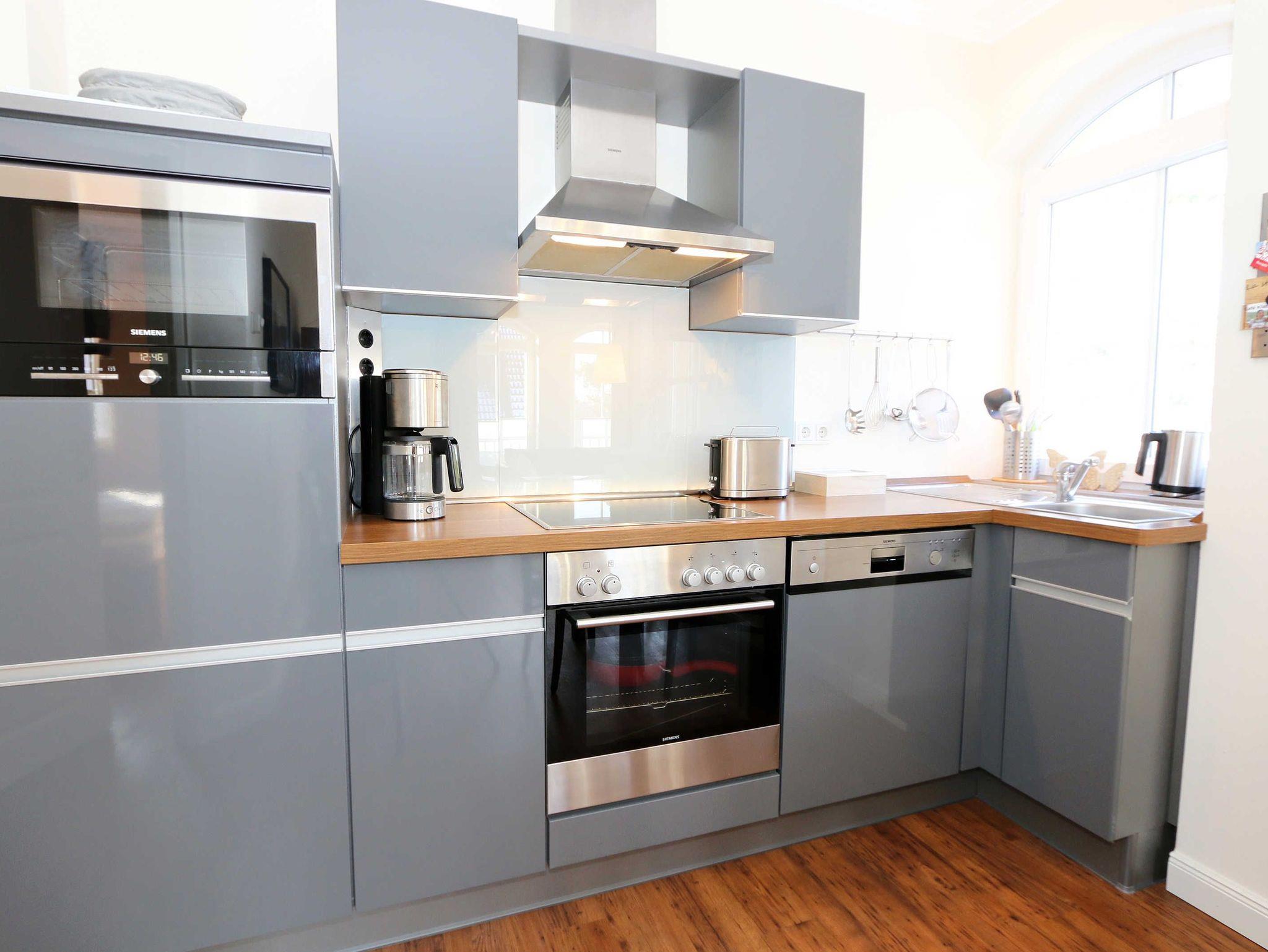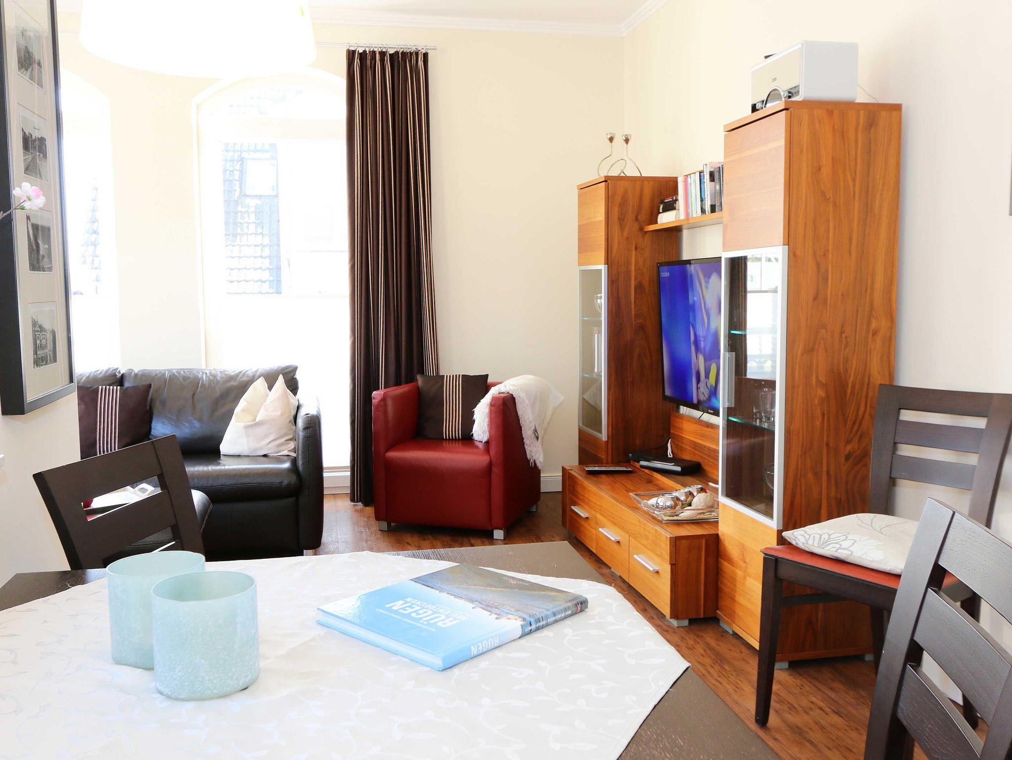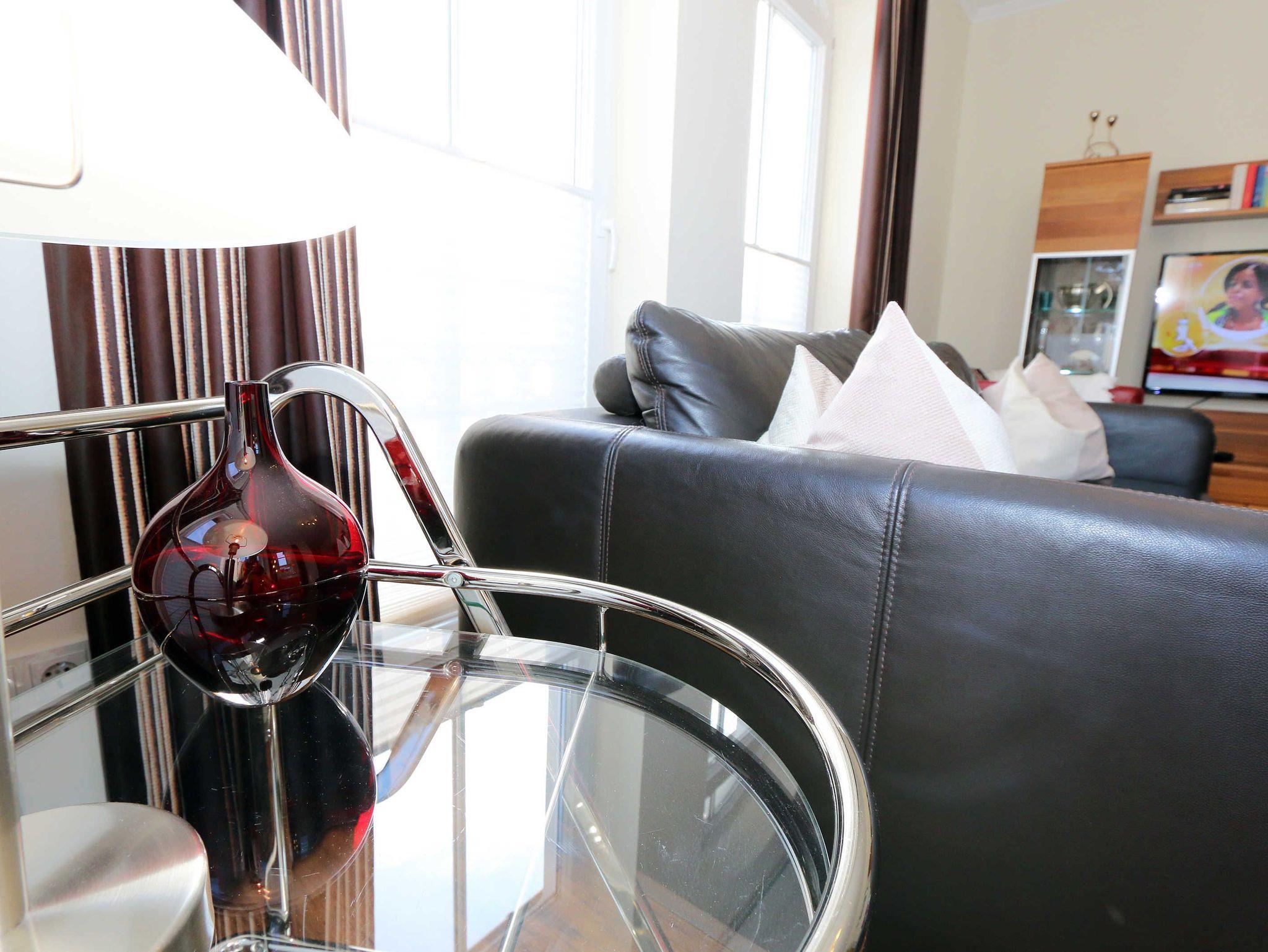 Ihre Nichtraucher/Ferienwohnung ist exklusiv mit viel Liebe zum Detail ausgestattet. Sie wohnen in einer 45 qm 2-Zimmer Wohnung für 2-3 Personen. Vom Balkon im 2. OG aus genießen Sie den Blick auf den Kurpark. Weiterhin finden Sie eine hochwertige, voll ausgestattete Pantry-Küche (Siemens-Küchengeräte, Herd, Backofen, Mikrowelle, Kühlschrank, Geschirrspülmaschine, Kaffeemaschine, Toaster, Wasserkocher, Mixer) mit einer Essecke für drei Personen. In der gemütlichen Sitzecke bestehend aus Ledercouch (ausklappbar mit Lattenrost und Matratze 1,40m x 2,00m) und zwei Sesseln können Sie es sich gemütlich machen. Dort steht Ihnen ein Smart-TV zur Verfügung. Das separate Schlafzimmer ist mit einem Doppelbett (2x0,90m x2,00m mit Sommer-und Winterbett in Übergrößen), ebenfalls Flachbildfernseher sowie geräumigem Schrank mit Bügelbrett und Bügeleisen ausgestattet. Das hochwertige Bad verfügt über Dusche, WC, Kosmetikspiegel, Fön und Handtuchheizkörper sowie einen exklusiven Waschtisch mit passenden Wandfliesen von Villeroy + Boch. Auch im Urlaub brauchen Sie in der Wohnung nicht auf einen Internetanschluss (WLAN) verzichten. Dieser ist für Sie inklusive!!! Für unsere kleinen Gäste ist ein Kinderreisebett (ohne Matratze und Bett Inlett) inklusive vorhanden. Ein Hochstuhl kann nicht gestellt werden. Im Keller des Hauses befindet sich eine Waschmaschine und ein Trockner, der gegen Gebühr genutzt werden kann. Die Erstausstattung eines Wäschepaketes (komplette Bettwäsche, 1 Duschhandtuch, 2 kleine Handtücher) können Sie bis 14 Tage vor Anreise gegen einen Aufpreis dazu buchen oder durch eigene ergänzen. Ab 2 gebuchten Paketen erhalten Sie einmalig 1 Geschirrhandtuch und 1 Duschvorleger hinzu. Zur Wohnung gehört ein Außenstellplatz Nr. 14. Im Preis inbegriffen ist ein Strandkorb (von ca. Mai bis September), in dem Sie die See auch bei einer steifen Brise genießen können. Wir freuen uns auf Sie und heißen Sie herzlich willkommen in Baabe!